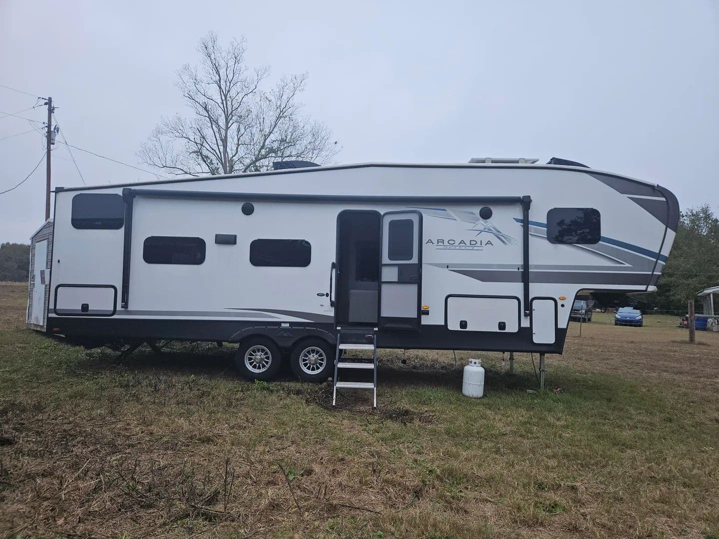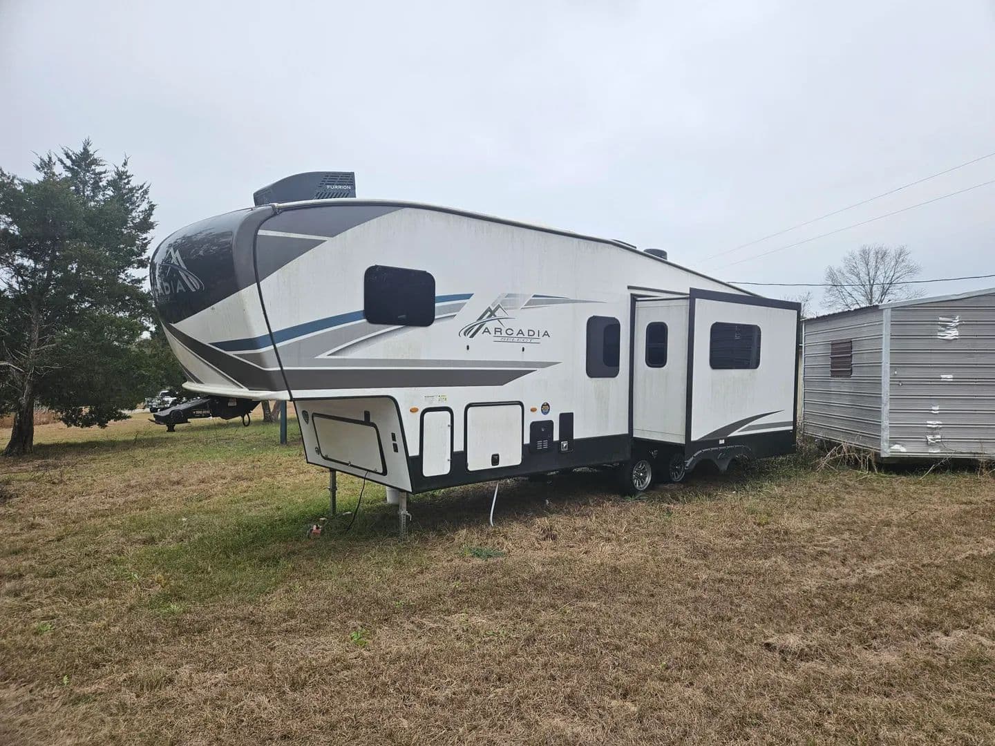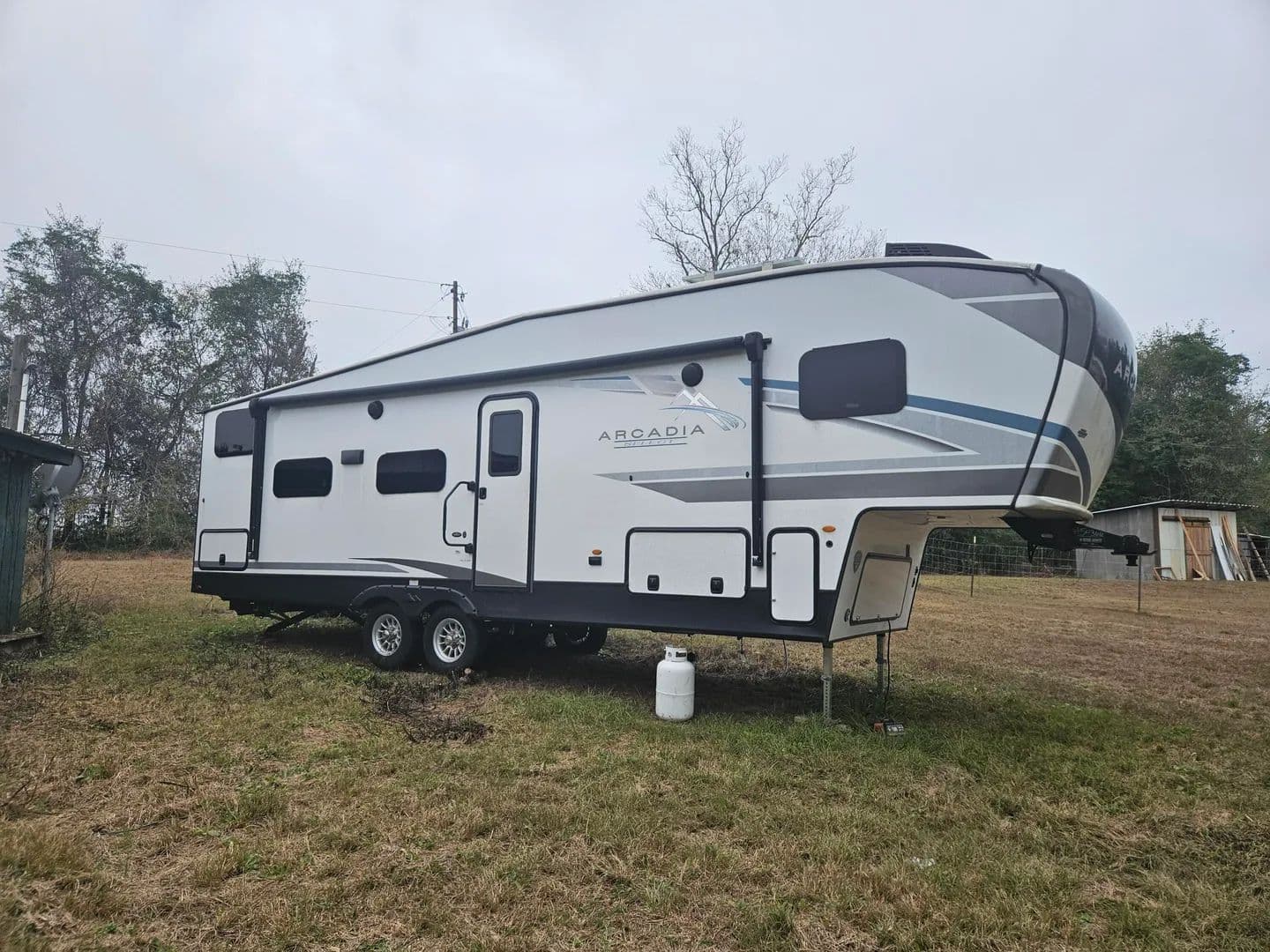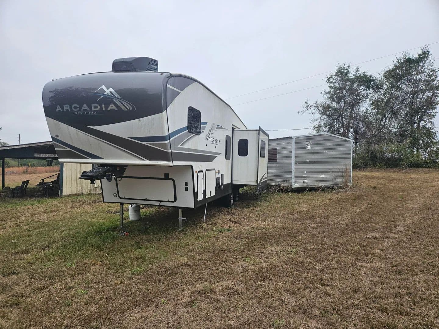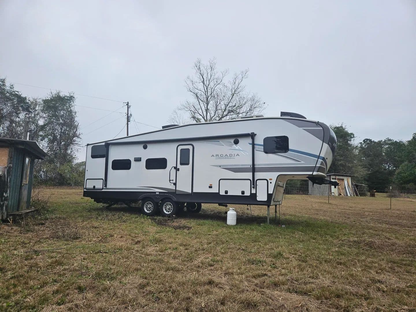 Over an acre just northwest of Florala proper with power and public water in place. Four hundred and forty feet of paved road frontage. Offered with a like new 2024 Keystone Arcadia 27' SBH fifth wheel RV. All the bells and whistles and ready to camp. Small structure with a kitchen and two bedrooms that needs rehabilitation but is given no value. Only cash offers considered