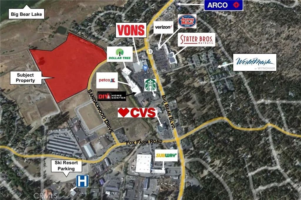 THE LAKE IS UP! CHECK THIS RARE 25 ACRE LAKEFRONT LOT ZONED GENERAL COMMERCIAL. This Commercial Land Offering is the Last Acreage of the Wild Frontier in Big Bear Lake. This 24.91 Acre Parcel runs from the Lake to Sandalwood Drive. Lake Frontage measures 826 feet and is nearly level all the way to Sandalwood Drive. All utilities are available including Sewer and Natural Gas. Imagine the possibilities... Approved for Marina Use.... or a Horseshoe Shaped Channel for Boating Access from the Lake to Retail Shops & Restaurants (Mixed Use). The Possibilities are Endless. Address has not yet been assigned to this property.
