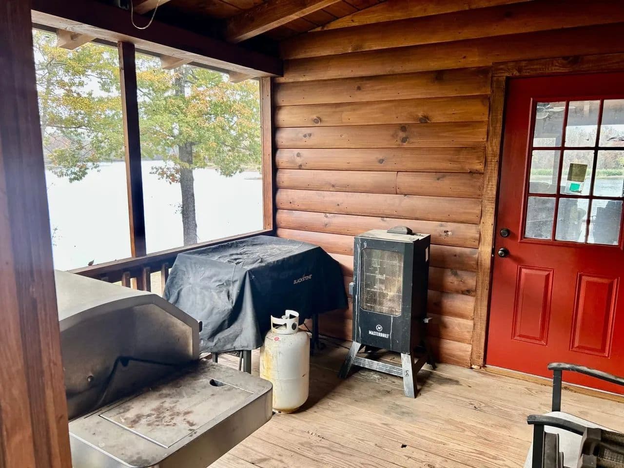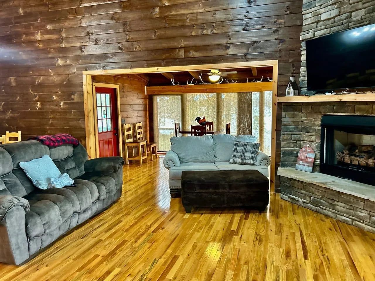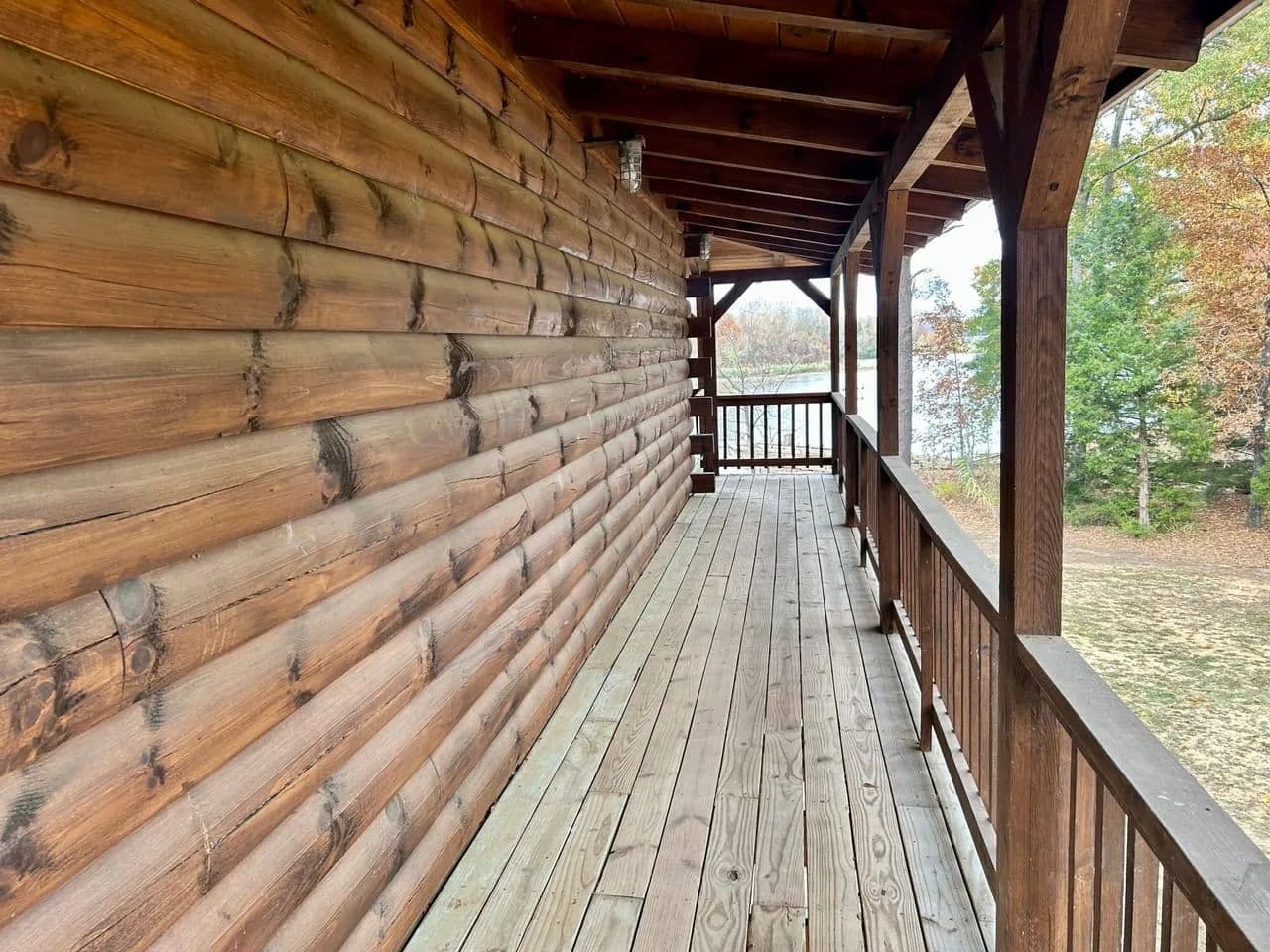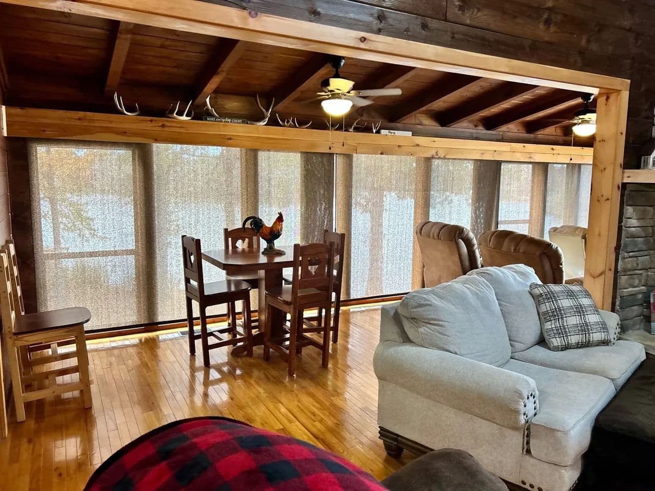 The log home consists of approximately 4100 square feet and is built from white pine logs with a total of 6 bedrooms and 4 1/2 baths. The main living space features 3 bedrooms, 2.5 baths, large great room, kitchen and dining room, sunroom and screened grilling porch.