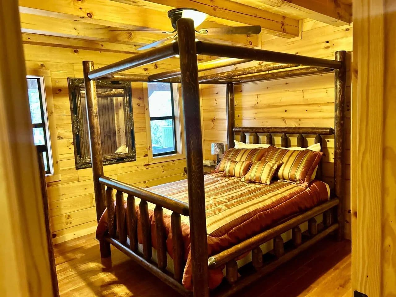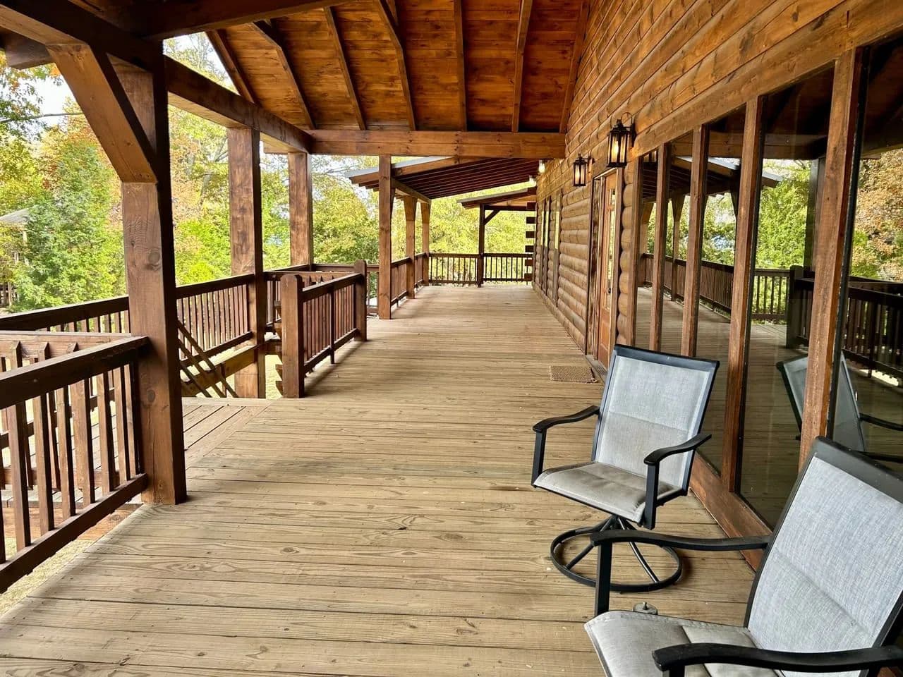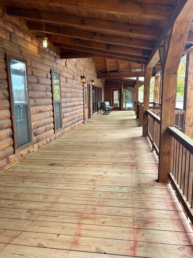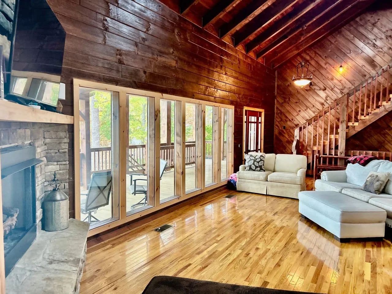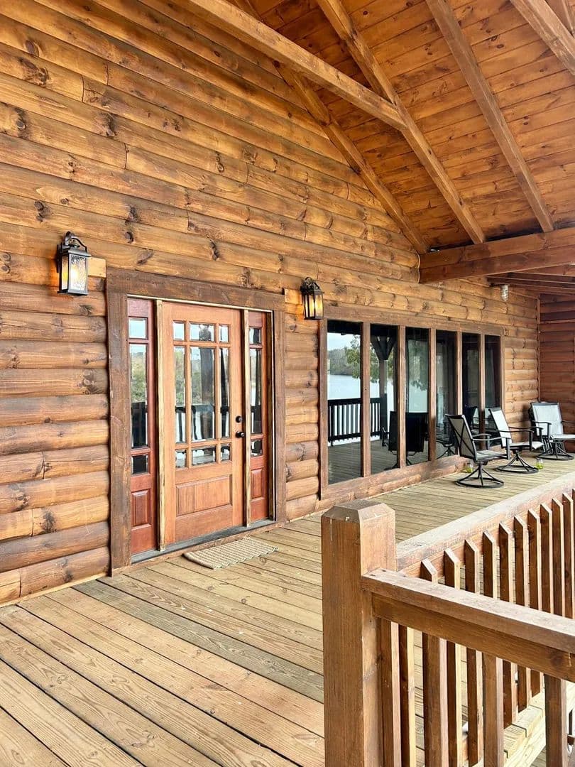 The log home consists of approximately 4100 square feet and is built from white pine logs with a total of 6 bedrooms and 4 1/2 baths. The main living space features 3 bedrooms, 2.5 baths, large great room, kitchen and dining room, sunroom and screened grilling porch.