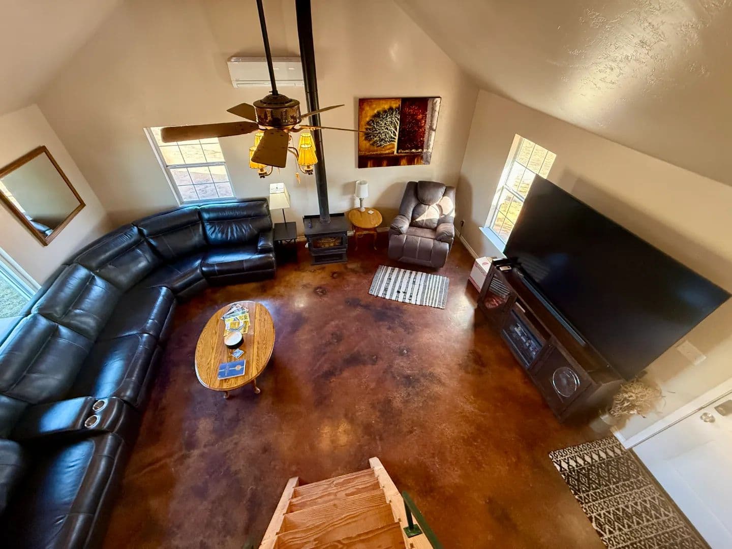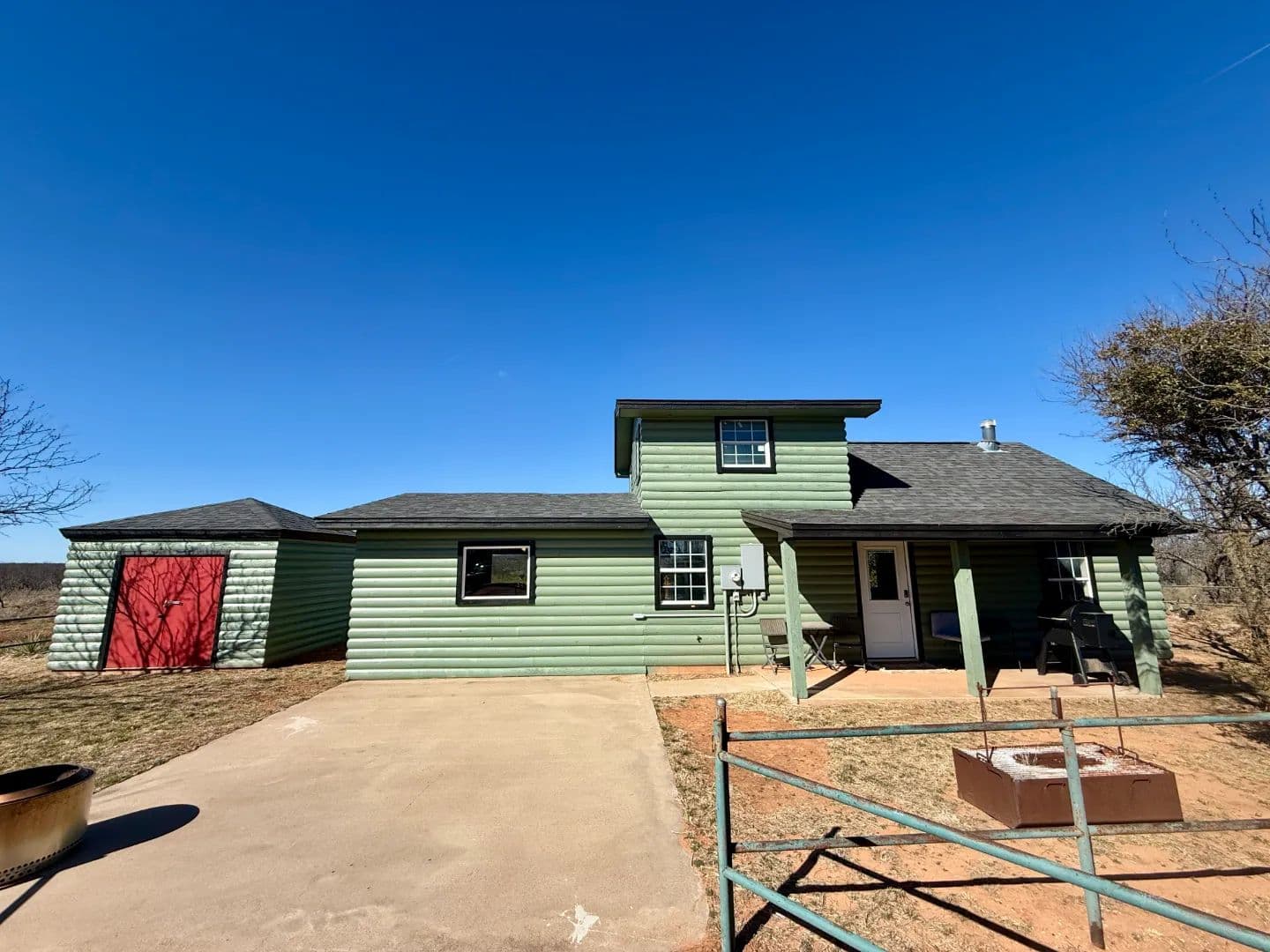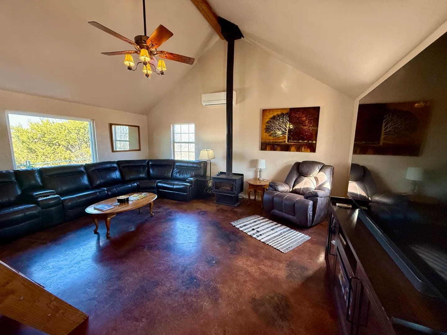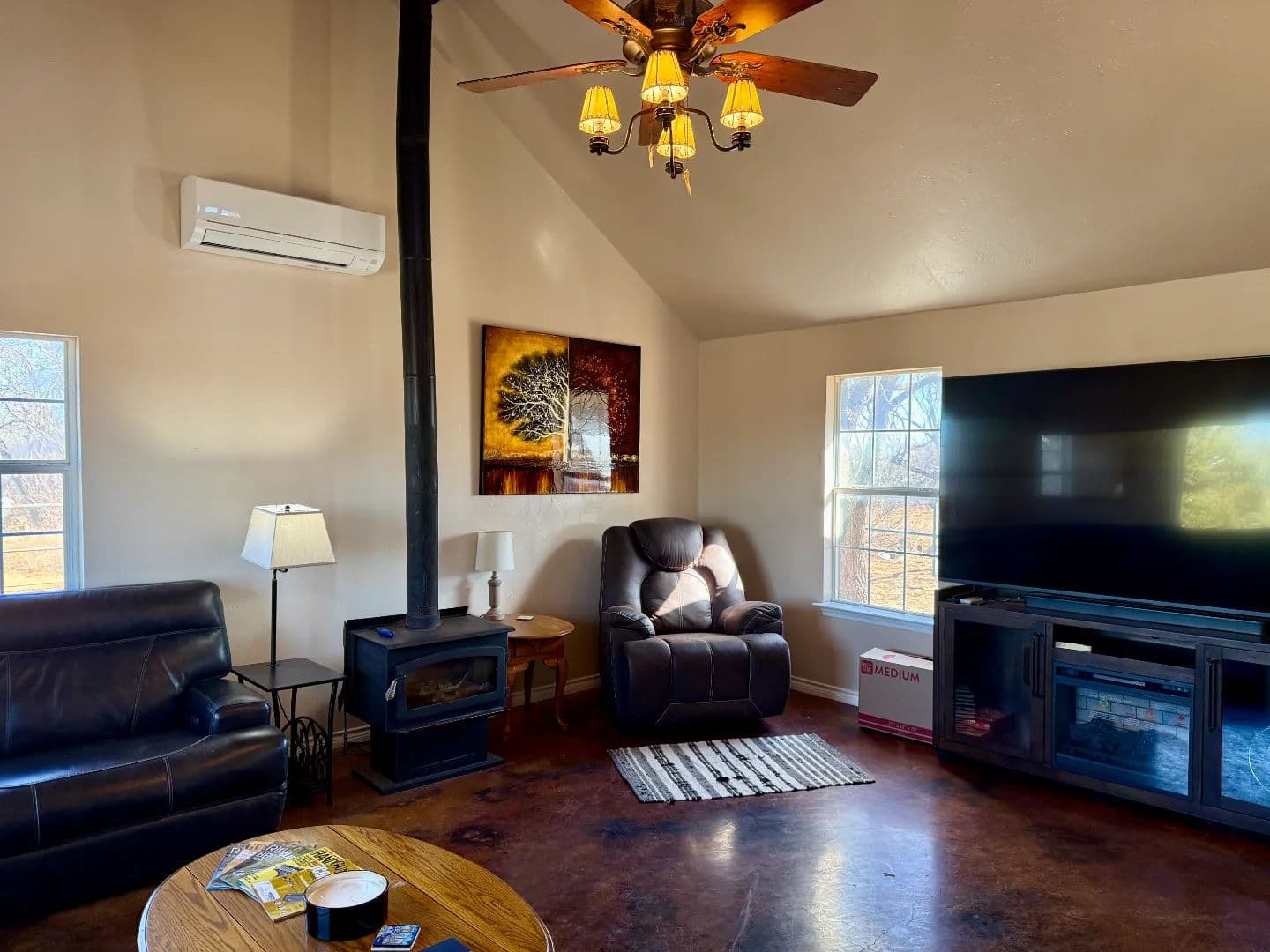 The ranch features a comfortable 1,000 sq. ft. residence offering 2 bedrooms, 1 bath, an open-concept kitchen and living area, and an upstairs loft with two queen-size beds, providing excellent guest accommodations. The spacious living room is centered around a wood-burning stove, with mini-split units providing efficient heating and cooling. The home is electric, with a propane instant hot water heater, and enjoys scenic views of a large stock tank from the back of the house.