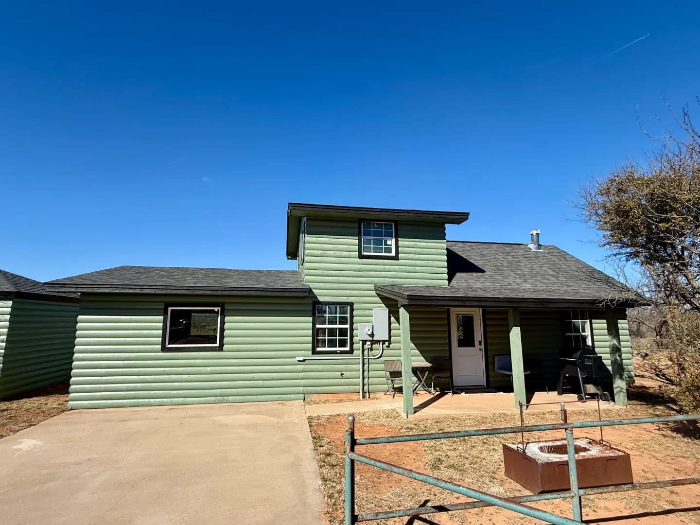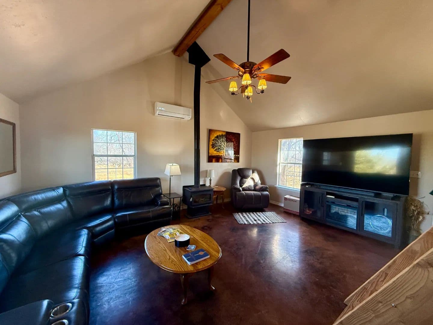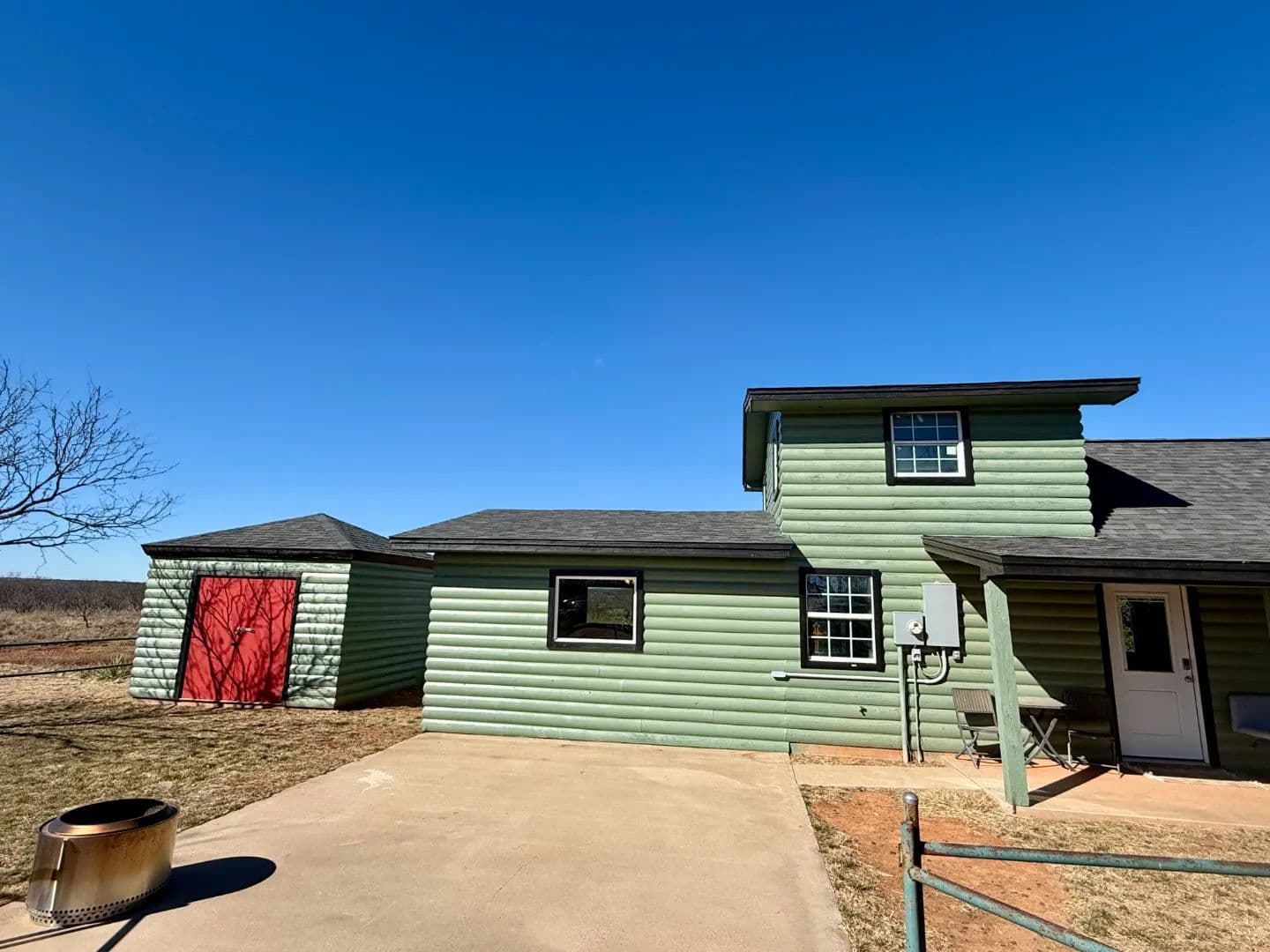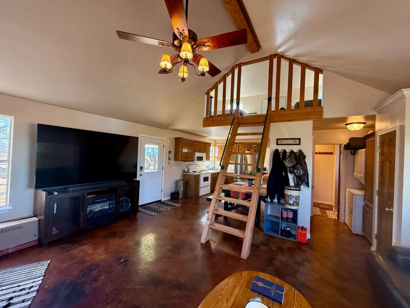 The ranch features a comfortable 1,000 sq. ft. residence offering 2 bedrooms, 1 bath, an open-concept kitchen and living area, and an upstairs loft with two queen-size beds, providing excellent guest accommodations. The spacious living room is centered around a wood-burning stove, with mini-split units providing efficient heating and cooling. The home is electric, with a propane instant hot water heater, and enjoys scenic views of a large stock tank from the back of the house.