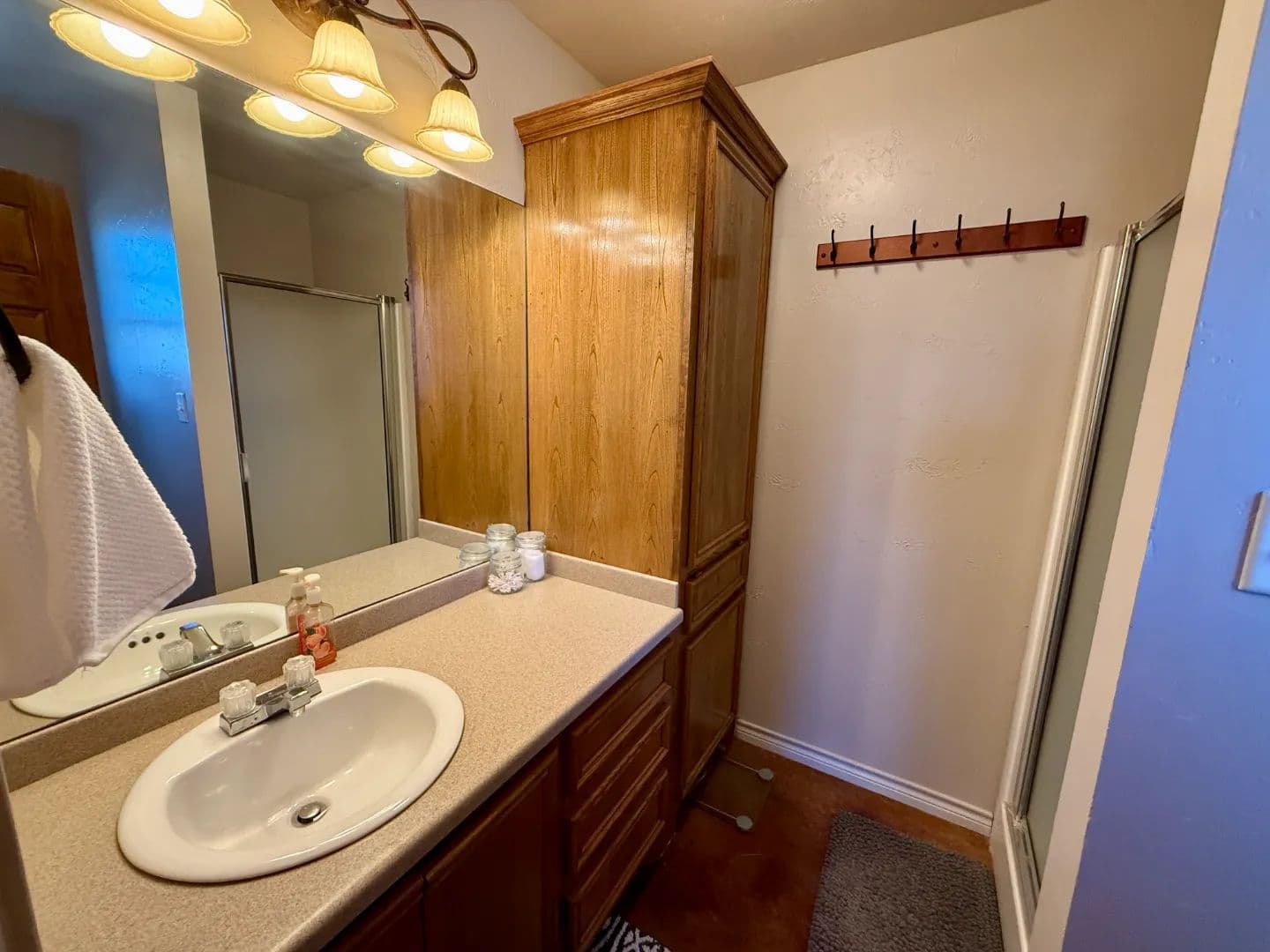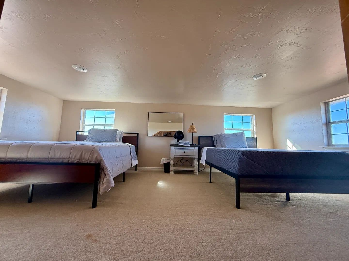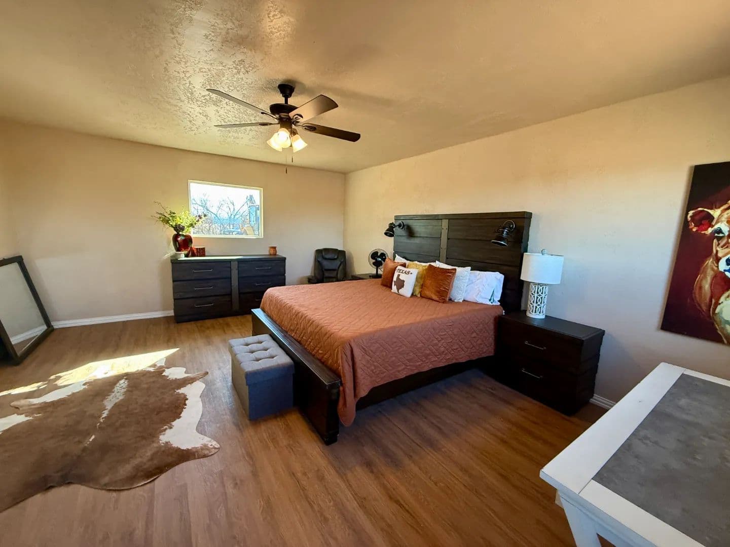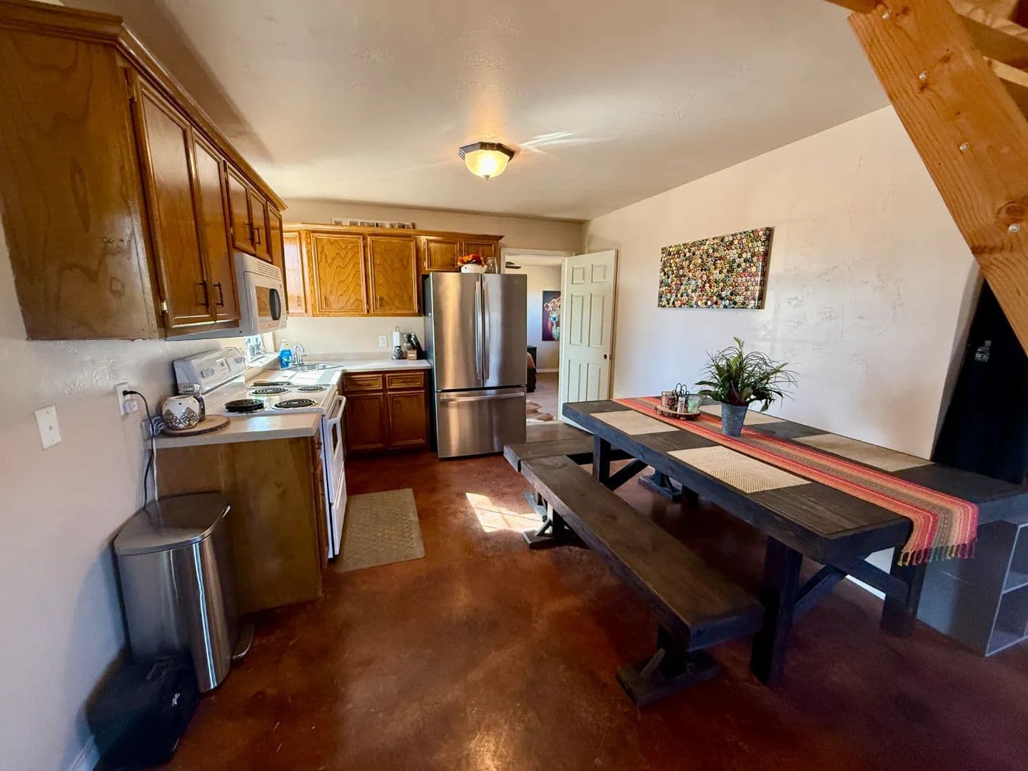 The ranch features a comfortable 1,000 sq. ft. residence offering 2 bedrooms, 1 bath, an open-concept kitchen and living area, and an upstairs loft with two queen-size beds, providing excellent guest accommodations. The spacious living room is centered around a wood-burning stove, with mini-split units providing efficient heating and cooling. The home is electric, with a propane instant hot water heater, and enjoys scenic views of a large stock tank from the back of the house.