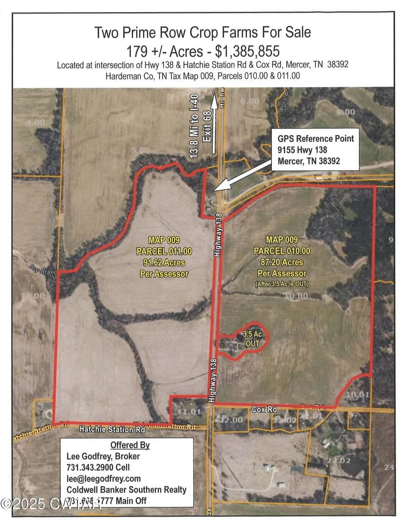 Your opportunity to own two prime row crop farms in Hardeman Co, 13.8 miles of I-40. Tax Maps 009, Parcels 010.00 & 11.00 lying on either side of Hwy 138. Approximately 148 ACRES IN ROW CROP, balance in woods and nonproductive land. Map 009, Pc 010.00 lies on the Northeast corner of Hwy 138 & Cox Rd, Map 009, Pc 011.00 lies on the Northwest corner of Hwy & Hatchie Station Rd. Total of 1.2 Miles (6410+ Ft) of blacktop road frontage. Both farms are currently rented, call listing agent for details. Adjacent owner's GPS address: 9155 Hwy 138, Mercer, TN 38392.