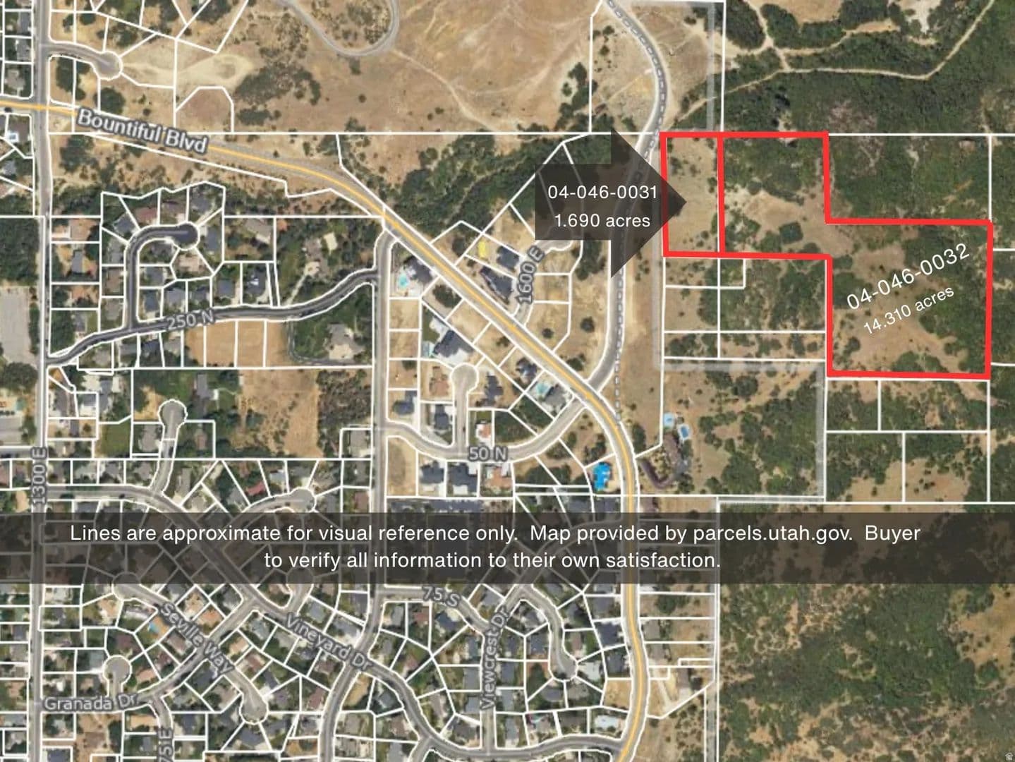 Escape to your own private foothill retreat on this remarkable 16-acre recreational property in Bountiful, Utah. Tucked just steps from the iconic Bonneville Shoreline Trail as it winds along Stone Creek, this land offers a rare blend of seclusion, scenery, and access to endless outdoor adventure. Enjoy breathtaking valley and lake views from multiple vantage points, with dramatic, steep terrain balanced by a flatter area at the top-perfect for soaking in the panoramic vistas. Surrounded by natural scrub oak and native vegetation, the property feels wild and untouched, ideal for recreation, hiking, wildlife watching, and quiet escapes into nature. Located near the Wasatch-Cache National Forest and only a short walk to the Ward Canyon Trailhead, this is a dream setting for outdoor enthusiasts seeking direct access to some of Davis County's most beloved trails and open spaces. A truly special opportunity to own a slice of Utah's foothills with unforgettable views and limitless recreational potential. Due to steep terrain it would be difficult if not impossible to build a structure. Currently there are no utilities services connected to the property.