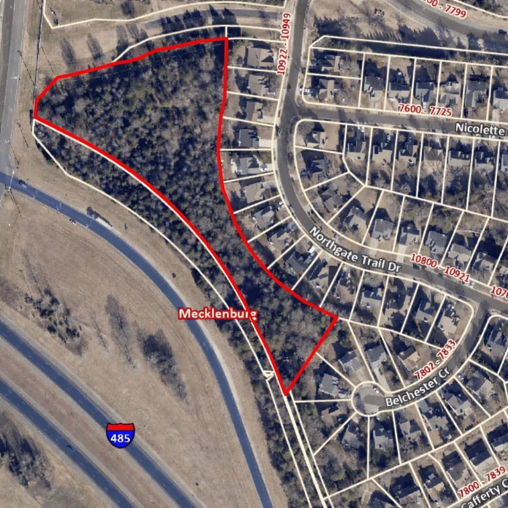 Conveniently located off the Harrisburg Road exit on I-485, this property sits near the intersection of Harrisburg Road and Reedy Creek Road, tucked behind the Northgate Community in Bradfield Farms. Current zoning allows for small single-family residential development.