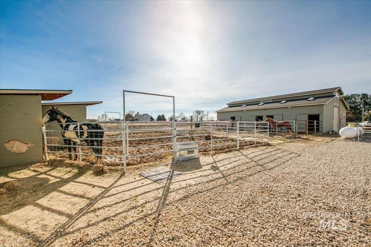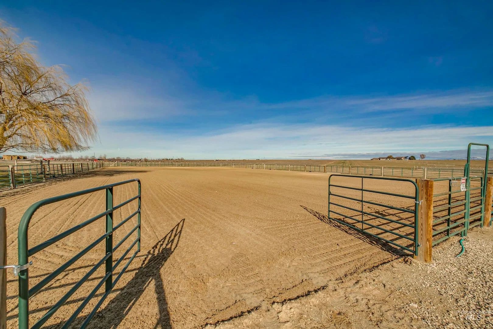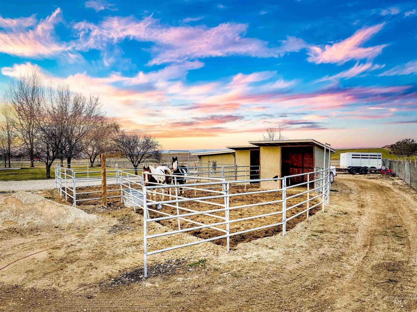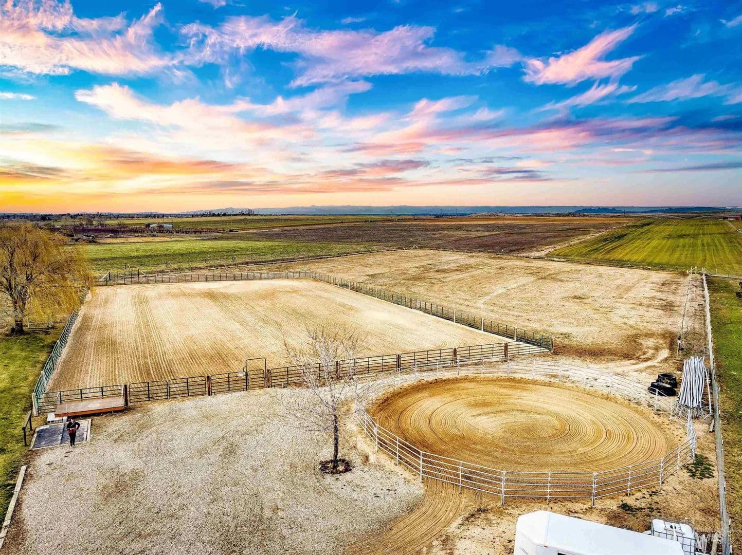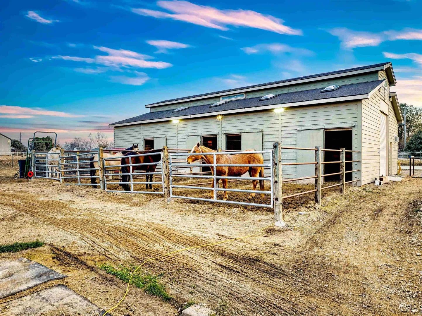 Welcome to your equestrian paradise! This single-story 4-bed, 2.5-bath haven is thoughtfully laid out to provide comfort and privacy. Natural light floods the great room that flows into the dining room & kitchen featuring maple cabinets, granite countertops, and a gas cooktop. Enjoy the spacious primary suite with fireplace, ensuite, and jetted tub. The bonus room upstairs is a versatile space offering a wet bar perfect for entertaining. This sprawling horse property features mature landscaping and a covered patio with majestic views of the Boise foothills. Delight in the equine amenities for riding enthusiasts including a 130x215 arena, covered horse shelters, and sprawling pastures. The property's centerpiece is a 4-stall barn with tack room, hay storage and loft storage plus cozy 1-bed, 1-bath guest quarters. A 30x48 heated RV shop provides ample storage and features 14' automatic garage doors. With no HOA or CC&Rs & conveniently located on the Boise/Kuna border, this is a one-of-a-kind horse property.