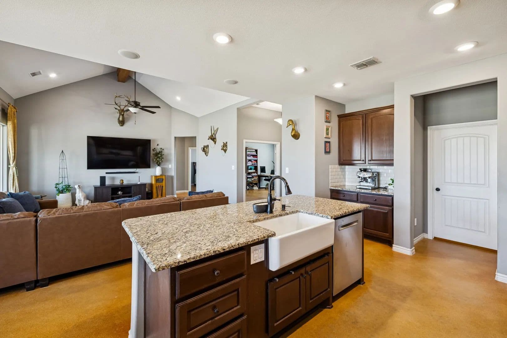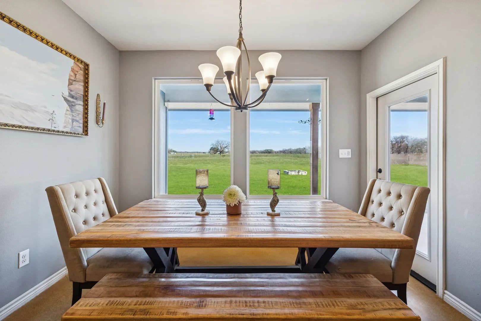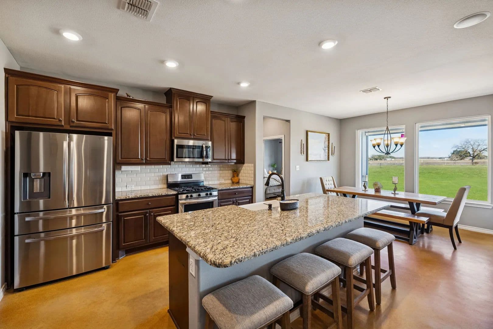 23 acres of Texas land built for hunters, land lovers, and anyone craving space, privacy, and freedom. With seller owned mineral rights, perimeter fencing, and a mix of open pasture and wooded cover, the land naturally supports wildlife, livestock, and wide-open use. Built in 2021, the home complements the lifestyle with durable finishes and thoughtful design. Vaulted, beamed ceilings, expansive windows, and stained concrete floors bring the outdoors in while standing up to real ranch living. The kitchen is built to work, featuring a massive granite island, 6-burner gas range, walk-in pantry, and coffee bar to fuel early starts. Step directly onto the covered back patio, complete with fans, lighting, and speakers—perfect for unwinding while overlooking your land. A 30’ x 20’ metal workshop with tall ceilings and roll-up door provides room for equipment, gear, and projects. The oversized garage and paved driveway handle trucks and trailers with ease, while the insulated well house, owned water treatment system, buried propane tank, and available 3-phase power support long-term functionality. The owner’s suite offers a comfortable retreat with spa-style bath, while a dedicated office and smart storage make everyday living seamless. This isn’t just acreage—it’s a livable ranch setup designed for hunting, livestock, and the kind of Texas lifestyle that’s getting harder to find.
