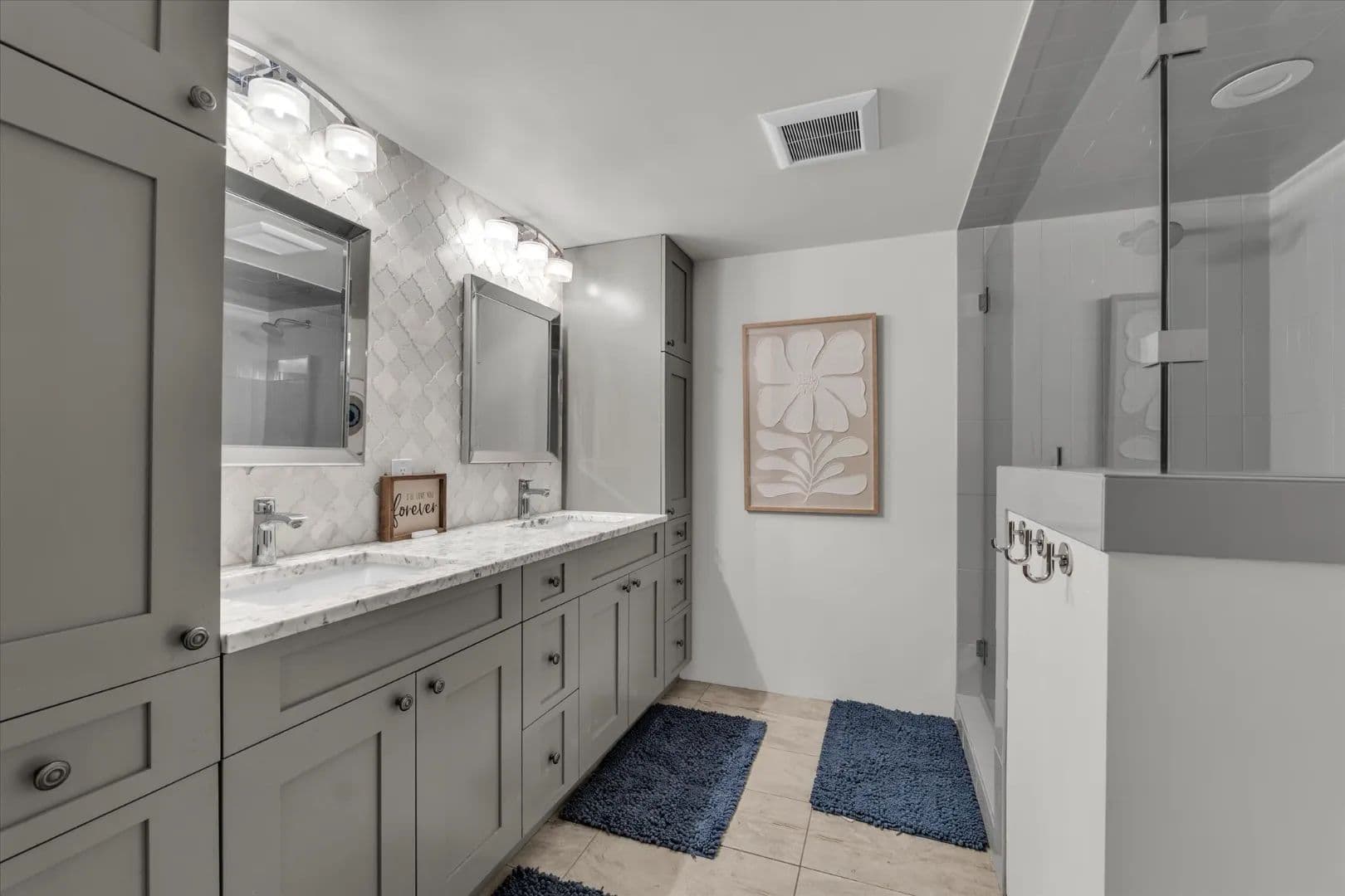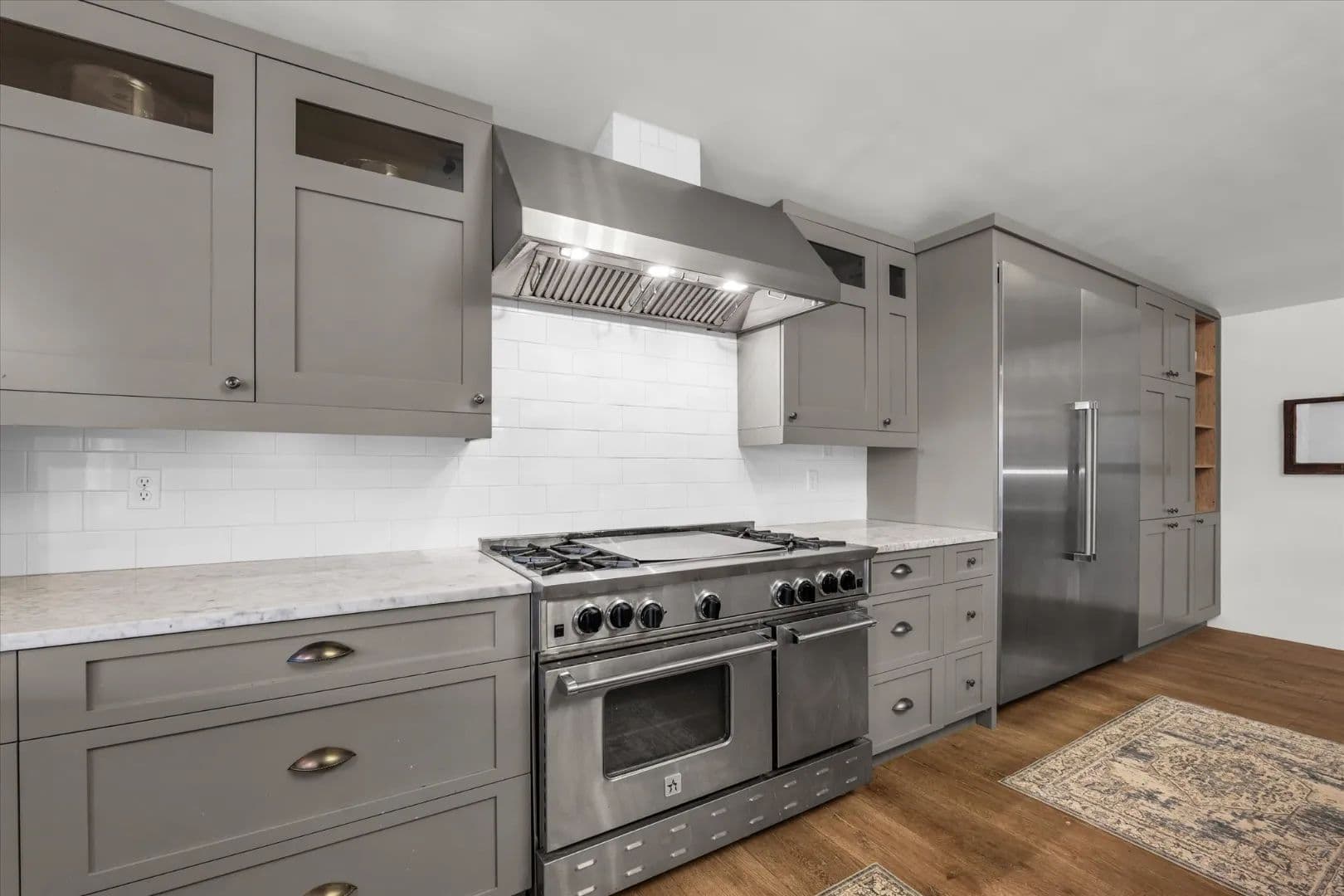 The kitchen serves as the heart of the home, designed for serious cooking and highlighted by a BlueStar gas range, premium appliances, and generous prep space. A thoughtful flow and natural light strengthen the connection between indoor and outdoor living.