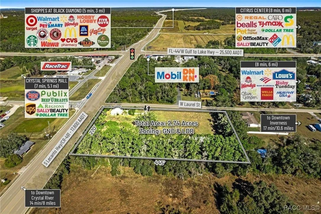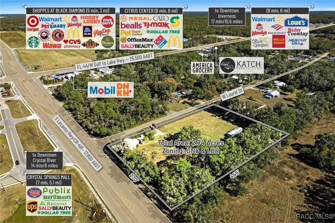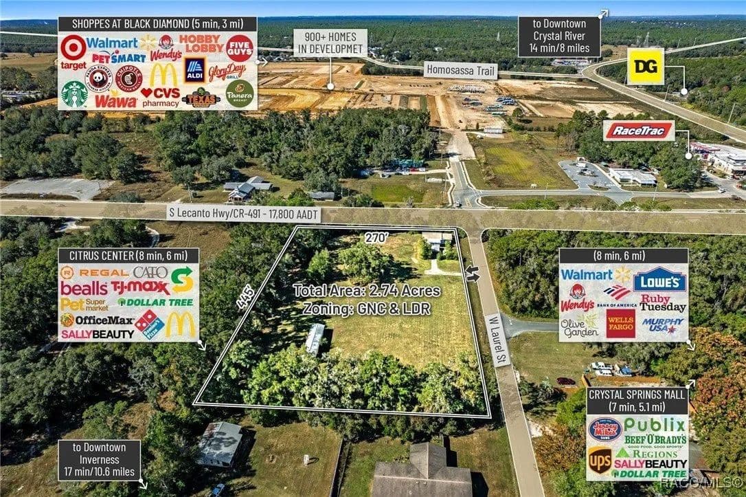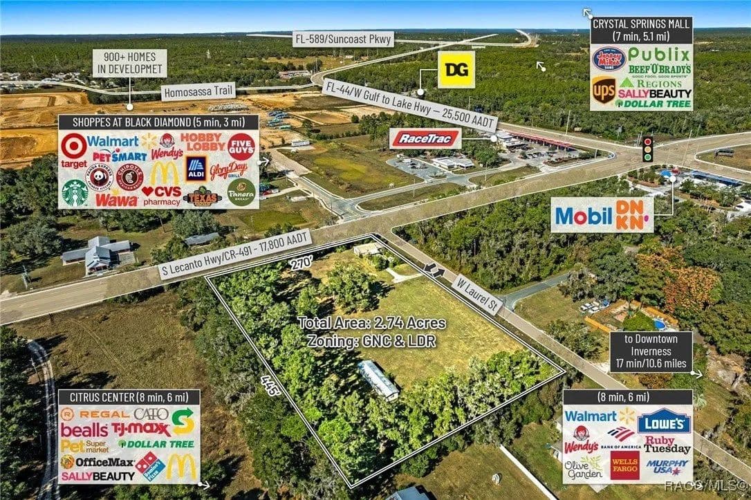Prime 2.74+/- acre commercial corner located in the heart of the rapidly growing Central Ridge District of Citrus County. This cleared, development-ready site offers exceptional visibility with 270' of frontage on CR 491 (Lecanto Hwy - 17,800 AADT) and additional frontage on W Laurel St, just two blocks from the signalized SR 44 intersection (25,500 AADT). Full median access allows unrestricted ingress and egress for north- and southbound traffic. Zoned GNC/LDR, the property supports a wide range of uses including retail, medical office, restaurant with drive-thru, automotive, hotel, multifamily (up to 10 units/acre with PUD), and more. Surrounded by major national retailers such as Target, Walmart, ALDI, McDonald's, Panera, Texas Roadhouse, Starbucks, and Panda Express, this corridor is the epicenter of Lecanto's commercial expansion. Directly across the street, DR Horton is developing 957 new homes and more than 30 acres of planned commercial space. Additional large-scale residential developments-including Metro Development's 4,933-unit master-planned community and Citrus Hills' Davos Reserve-are driving strong demand for retail, services, and medical facilities. Located just one mile from the Suncoast Parkway (589) and 55 miles from Tampa International Airport, the property is positioned for long-term growth within the Tampa-St. Petersburg MSA. Excellent demographics with more than 66,000 residents within 15 minutes. Ideal for developers seeking a high-visibility, high-growth location suitable for a variety of commercial or mixed-use concepts.