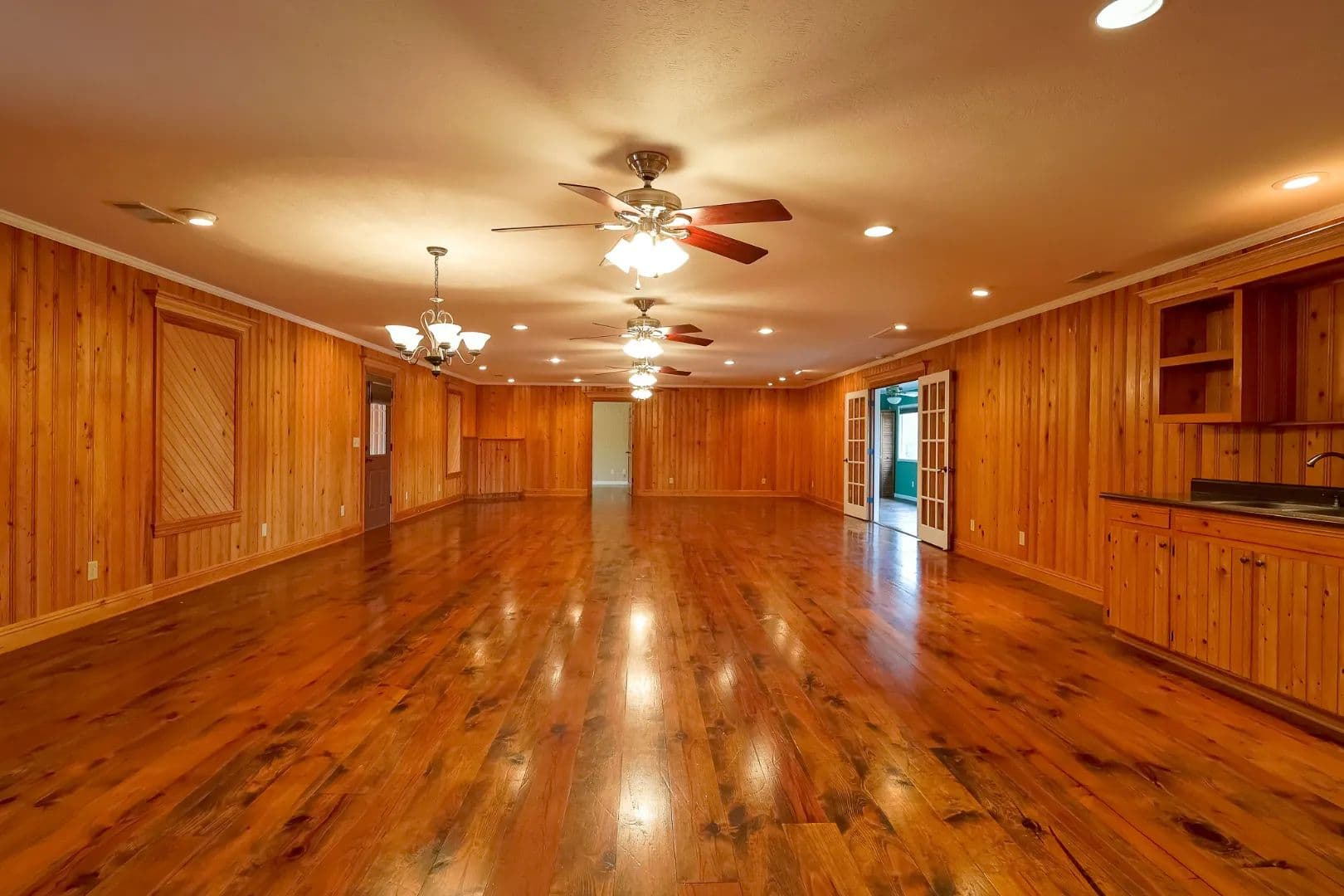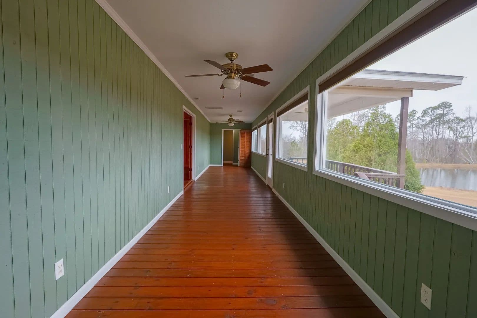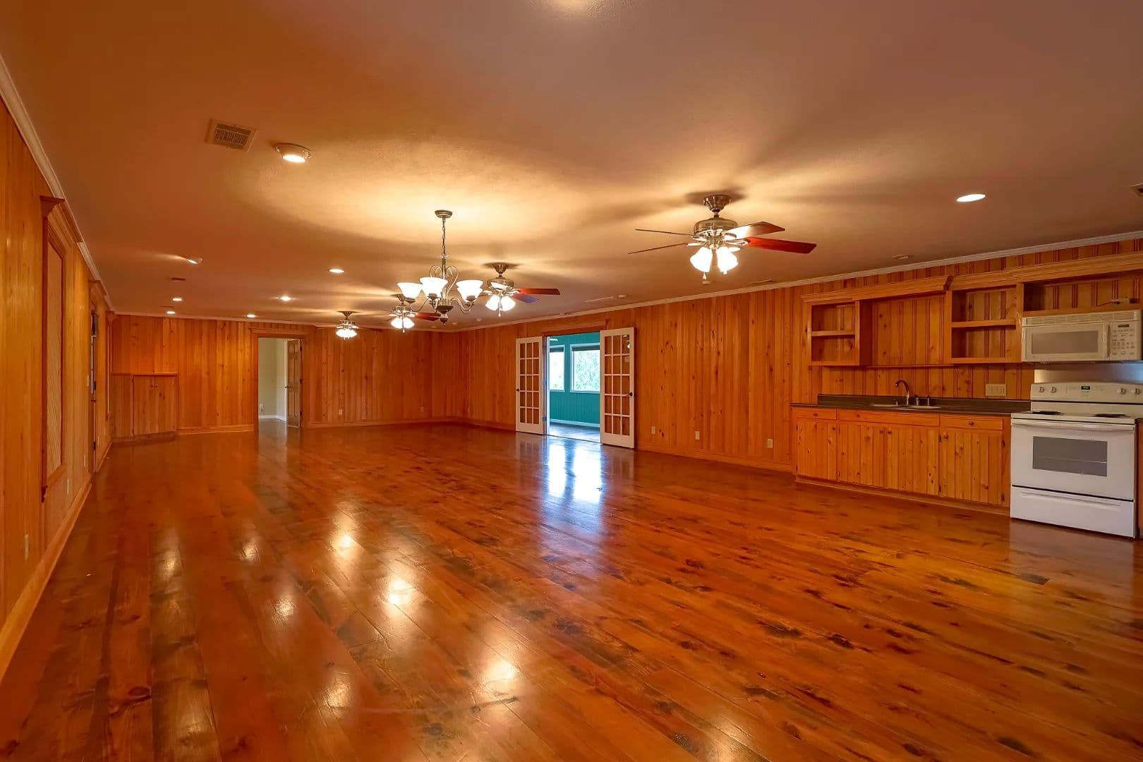 The 2,688-square-foot lodge-style home features one large bedroom, two full bathrooms, and bonus room. The spacious main living area and kitchen are accented by beautiful pine floors and paneling, designed to accommodate large family gatherings. One of the highlights is the climate-controlled sunroom, offering a 1,000-foot vista over the water—the ideal spot for morning coffee while watching the kids fish.