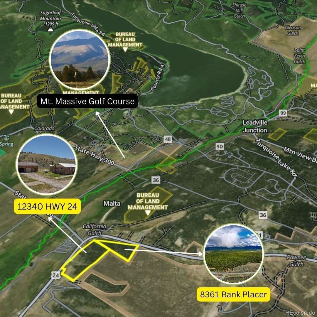 SELLER FINANCING AVAILABLE! Two mountain parcels totaling 123.93 acres nestled in the northern Arkansas Valley, 8361 Bank Placer, Leadville, CO with 38.96 acres and 12340 Hwy 24, Leadville, CO with 84.97 acres and a 2300 sf home are being sold together AND must close simultaneously. These combined properties offer a rare opportunity to own a piece of Colorado's natural splendor. Together, the combined properties boast breathtaking views and abundant potential. The home itself has a total of 2300 square feet and features 3 bedrooms and 1 bathroom. Although currently unfinished, it presents an opportunity for customization to suit your vision of mountain living. With direct access off highway 24, convenience is paired with tranquility, as a convenience store with gas and groceries are only 2 minutes away and the town of Leadville is just 6 minutes away. Ski Cooper ski resort is a short 20-minute drive away, while the trailhead to Mt. Massive, is just 20 minutes away. Enjoy the freedom to ride snowmobiles and ATVs to your heart's content on your own expansive property. Nearby Twin Lakes and Turquoise Lake offer excellent fishing opportunities, while the surrounding area provides the perfect setting for gold panning and exploring Colorado's rich mining history. The property's land is subdividable, offering flexibility for future development or investment opportunities. Whether you seek a private mountain escape or have ambitious development plans, this property promises limitless potential amidst Colorado's stunning natural beauty. These two properties are contingent upon the sale of one another. Seller financing available. Remodel incomplete: Building area total sf is 2300. Above grade unfinished area is 1150 sf and below grade unfinished area is 1150 sf. 12340 HWY 50 is being sold "AS IS WHERE IS." Buyer to verify subdivision opportunities.