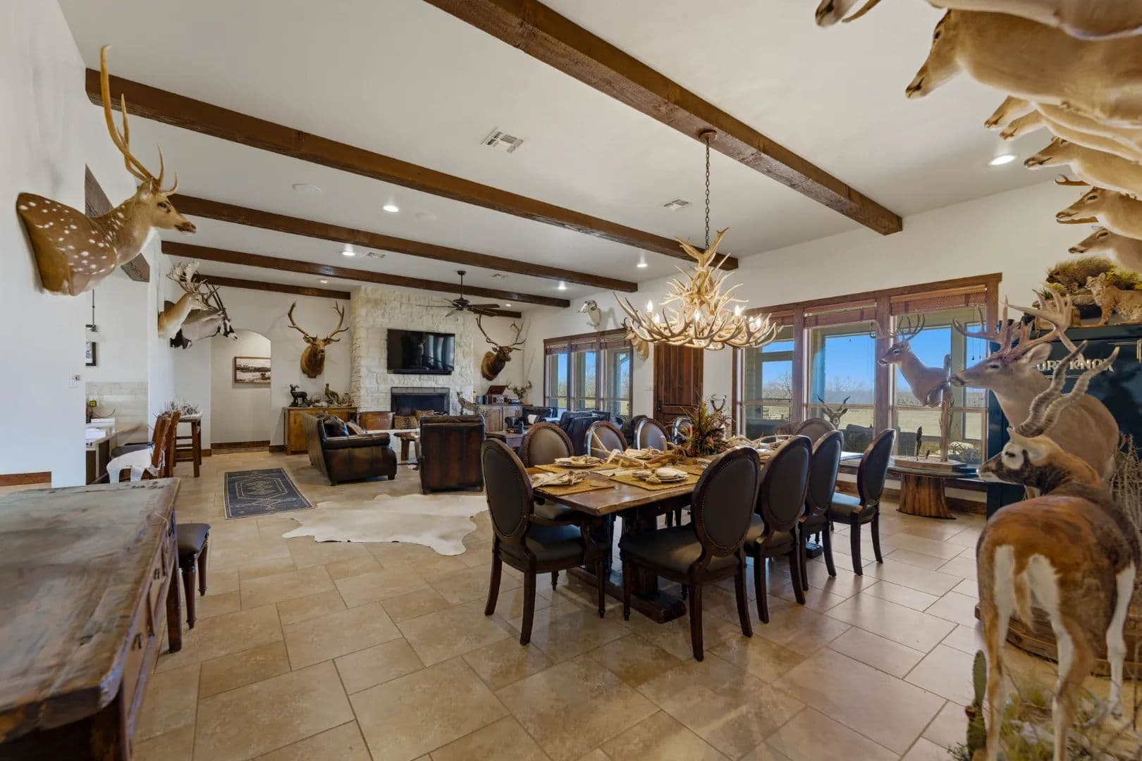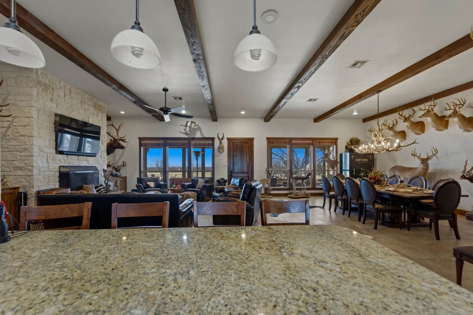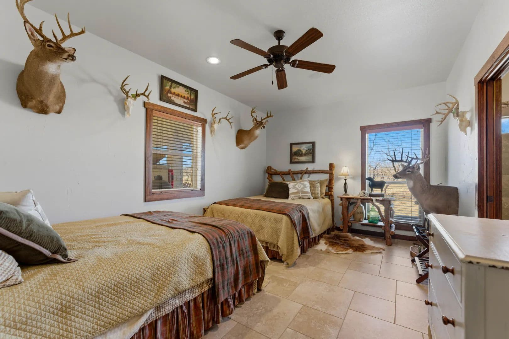 - At the heart of the property sits a beautifully appointed 4-bedroom, 4-bath ranch-style lodge totaling 2,400± square feet.