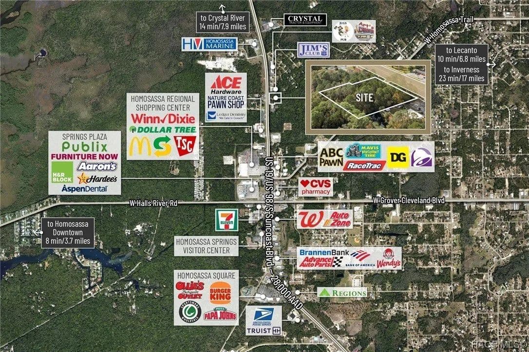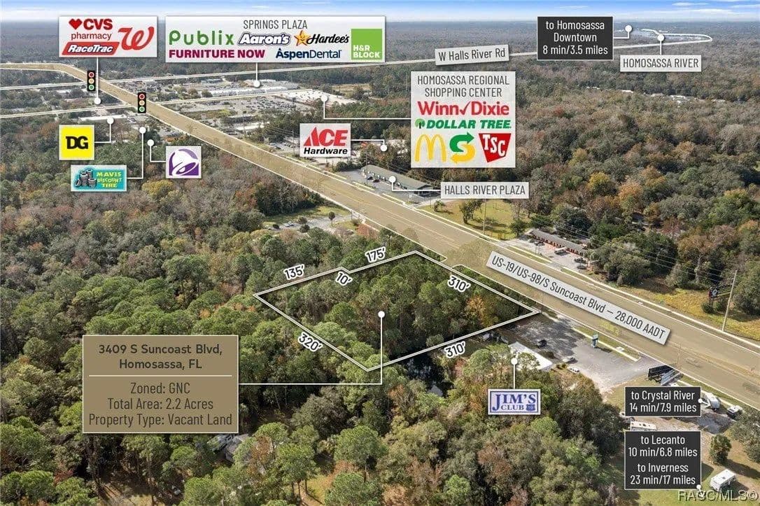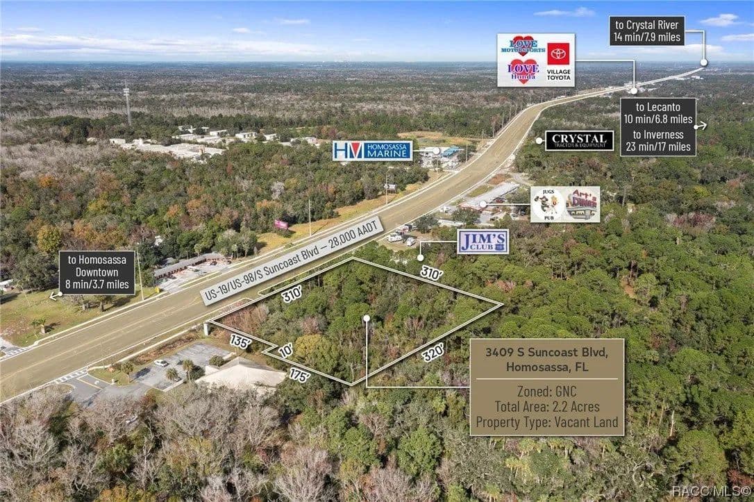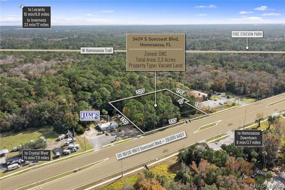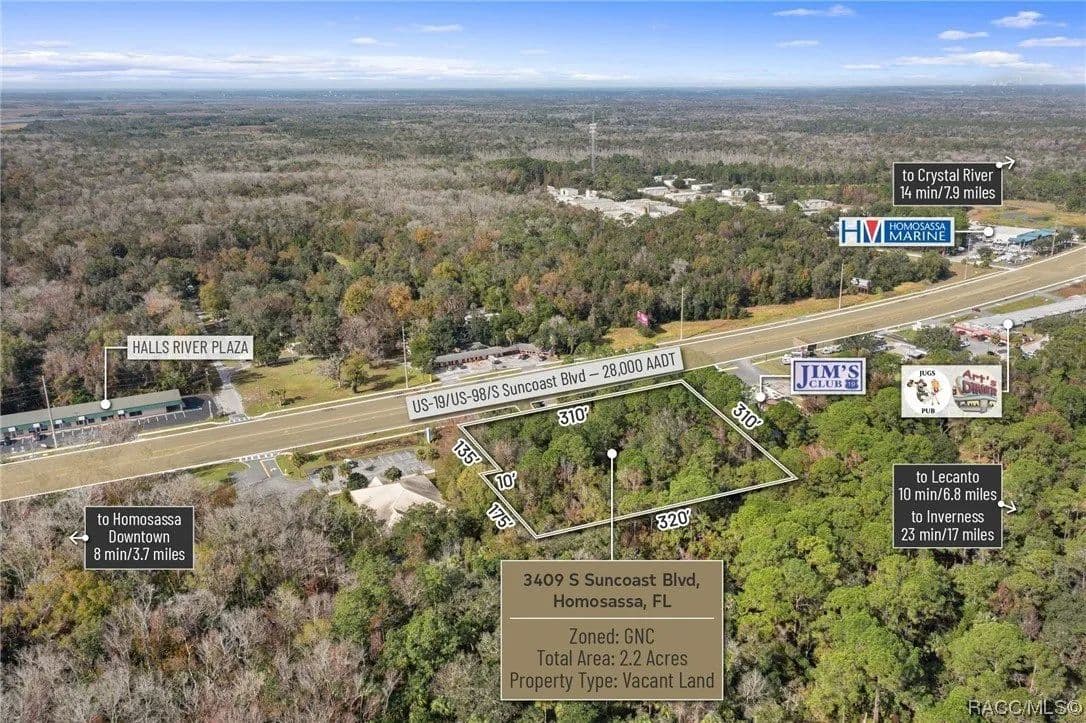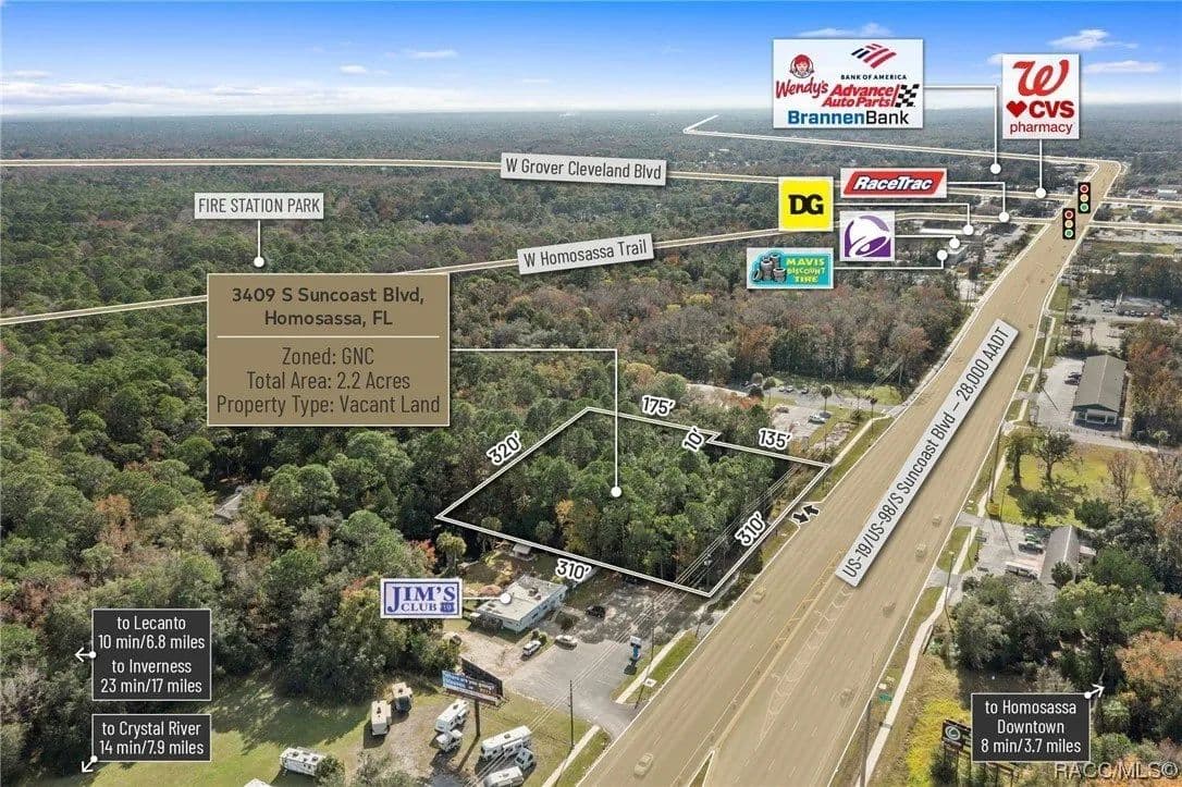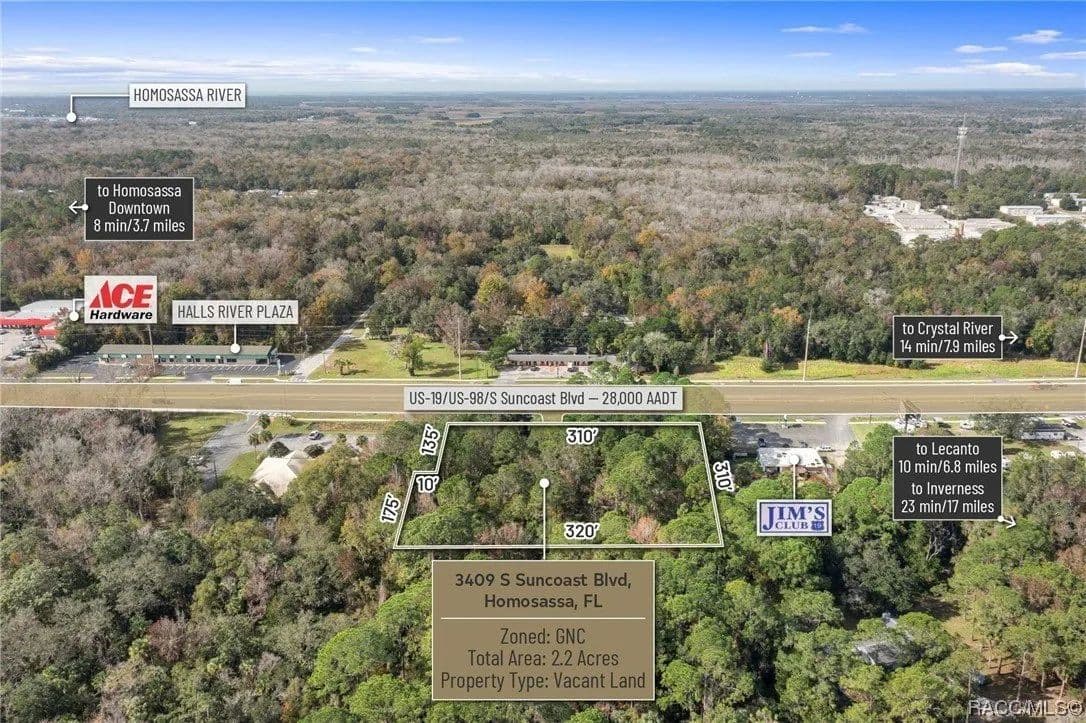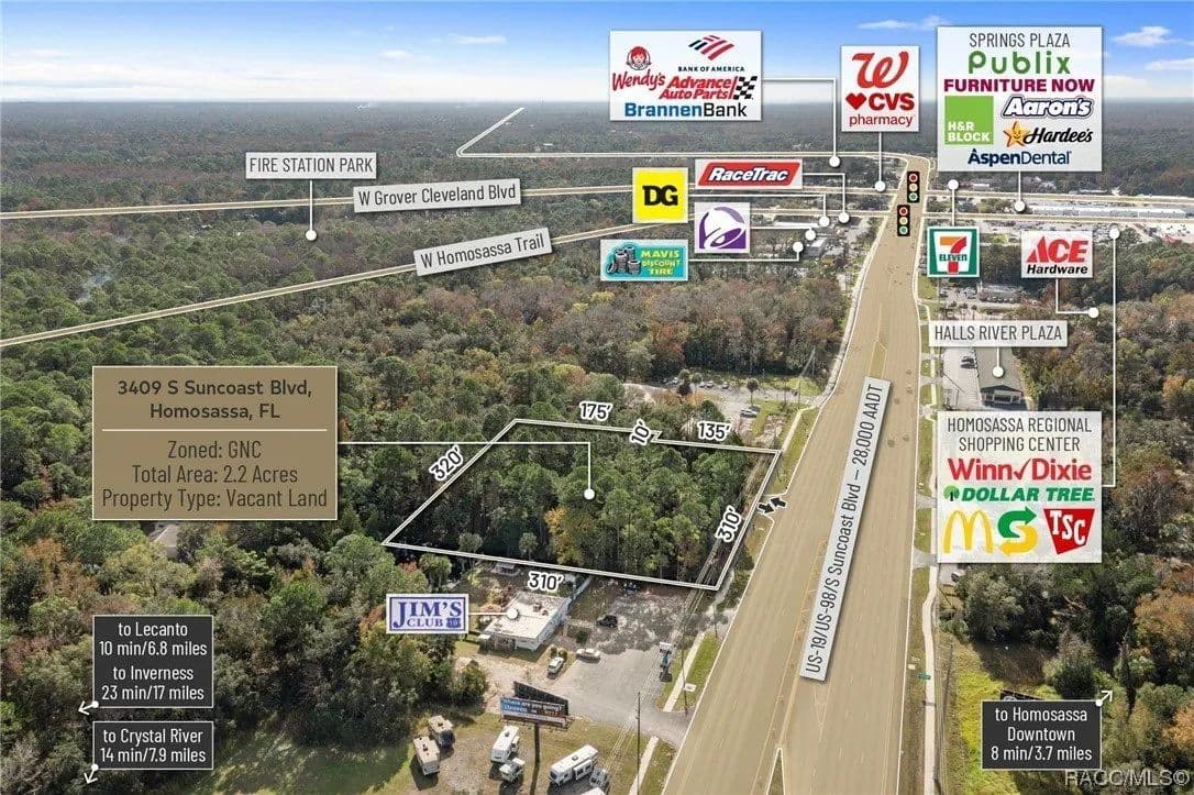 This prime development opportunity, located in Downtown Homosassa, Citrus County, presents a 2.20-acre site zoned as General Neighborhood Commercial. It fronts the bustling 6-laned S Suncoast Blvd (28,000 AADT) with excellent visibility and exposure, boasting 310 feet of frontage and exposure. The property allows full ingress and egress, with access north on US Hwy 19. This prime acreage, zoned as General Neighborhood Commercial, falls under a high-intensity land-use district allowing for a 70% FAR in a wide variety of uses. These include, but are not limited to, Medical/Professional Office, Restaurants, QSR Drive-Thru, Automotive, Shopping Centers/Retail, Hotel/Motel, Convenience Stores, Gas Stations, and Pharmacies. The location is central, surrounded by national retailers. Disclaimer: All information provided herein is for marketing purposes only and is not guaranteed for accuracy. Prospective buyers or tenants are encouraged to conduct their own independent due diligence. The seller, broker, and associated parties make no representations or warranties, expressed or implied, as to the accuracy or completeness of this information. All dimensions, zoning details, financial data, and other property-related facts should be independently verified. Please consult with appropriate licensed professionals before making any investment or purchasing decisions.