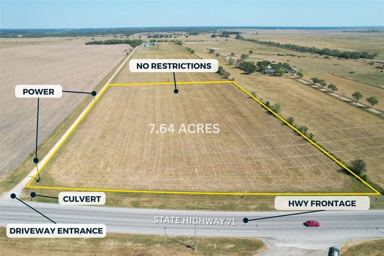 PRIME TEXAS ACREAGE on HWY 71! This high-visibility tract offers over 460 ft of highway frontage and a corner location with dual access from HWY 71 and a gravel side road—a true HARD CORNER opportunity. Currently under Ag Appraisal (LOW TAXES!), this cleared, level, and open land is ready for commercial, residential, or recreational use. Build your dream ranch, business site, or investment property—the possibilities are endless! Electricity available, water well & septic needed, and NO floodplain. The area is experiencing rapid growth and rising land values, making this a rare, high-potential investment along one of Texas’s most traveled rural corridors.