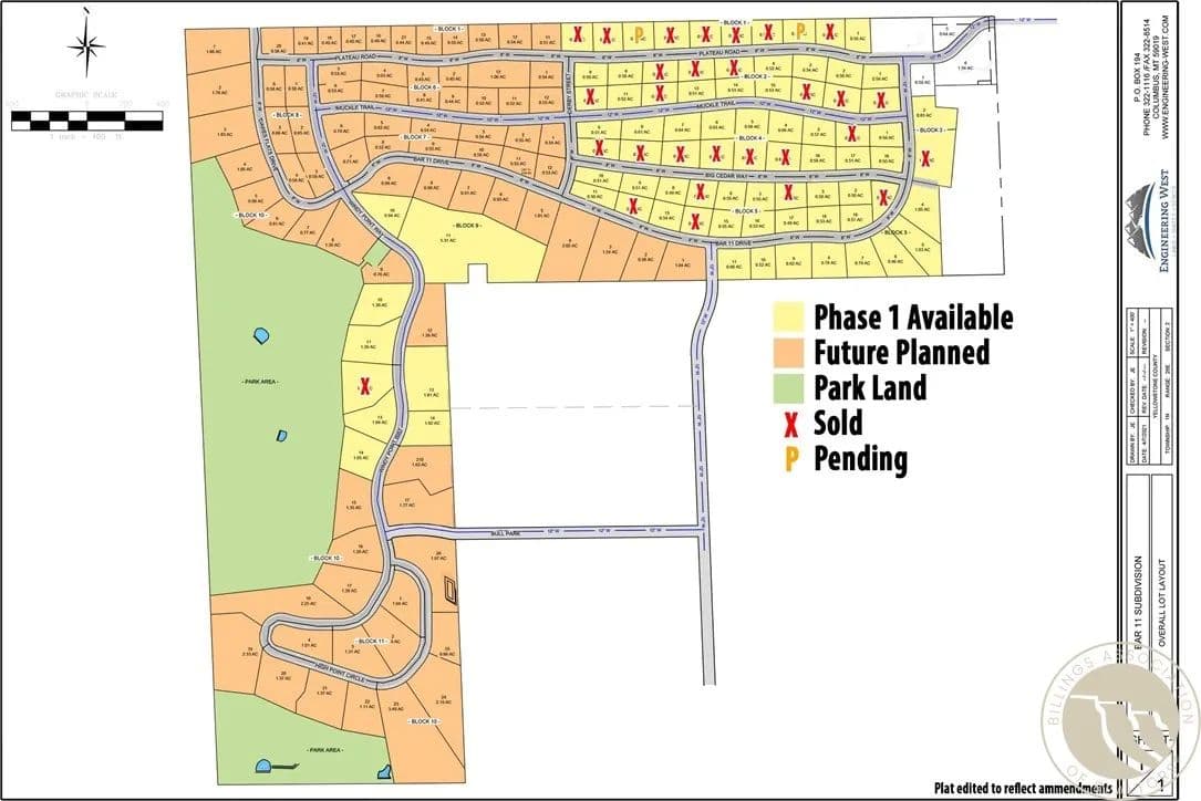 This lot has a foundation in place for an approx. 5,166 Sf house (3,425 sf on main w/ 2 attached 2 car garages - approx. 575 sf & 525 sf, & an additional approximate 210 sf attached greenhouse/or 5th garage and 1,741 sf on the upper floor). Larger very secluded lot with spectacular views! Floor plans available upon purchase of the lot. Bar 11 offers a peaceful lifestyle just 10 minutes from Downtown Billings! Lots range in size from .5 ac to 5+ acres with amenities including City water, MDU Natural Gas, Spectrum Cable/Internet, snow removal, children's park in the near future, solar street lighting, 44 acres of parkland to enjoy, and beautiful views of the Bull Mountains from most lots. All info from 3rd party sources & deemed reliable. Info subject to change & not guaranteed or warranted. Buyer & buyer’s agent to verify all info.
