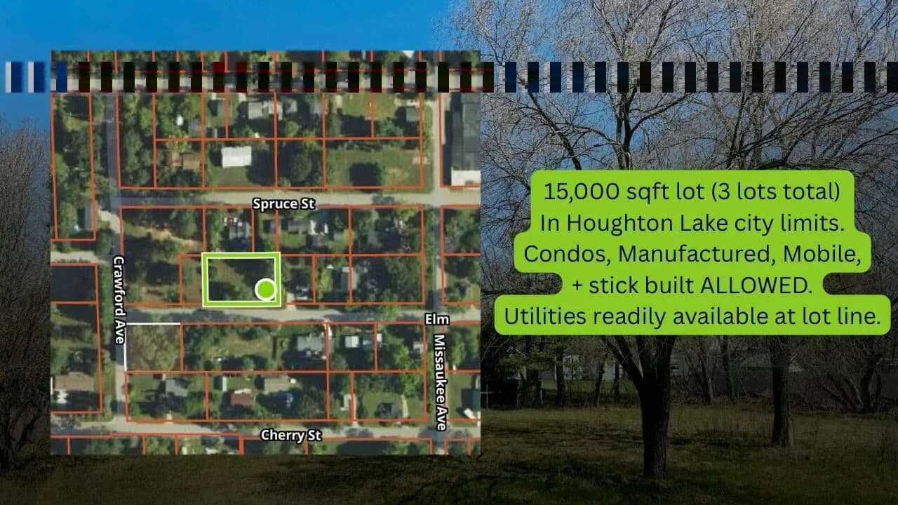 These 3 lots, 0.34 Acres in total, are just a few blocks South of Houghton Lake, including Municipal sewer, and electric to the lot line, providing for the optimal building site of your next home! Condo, manufactured, mobile, and stick built homes are allowed. Sparsely wooded, featuring a few trees for shade and summer greenery. Within city limits, enjoy multiple options for comfort food and shopping sprees. The building site is ready to go, it is only missing your imagination!