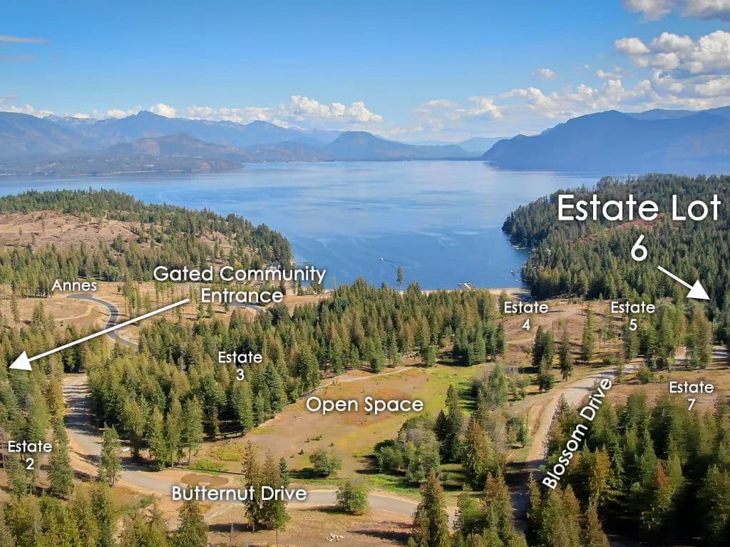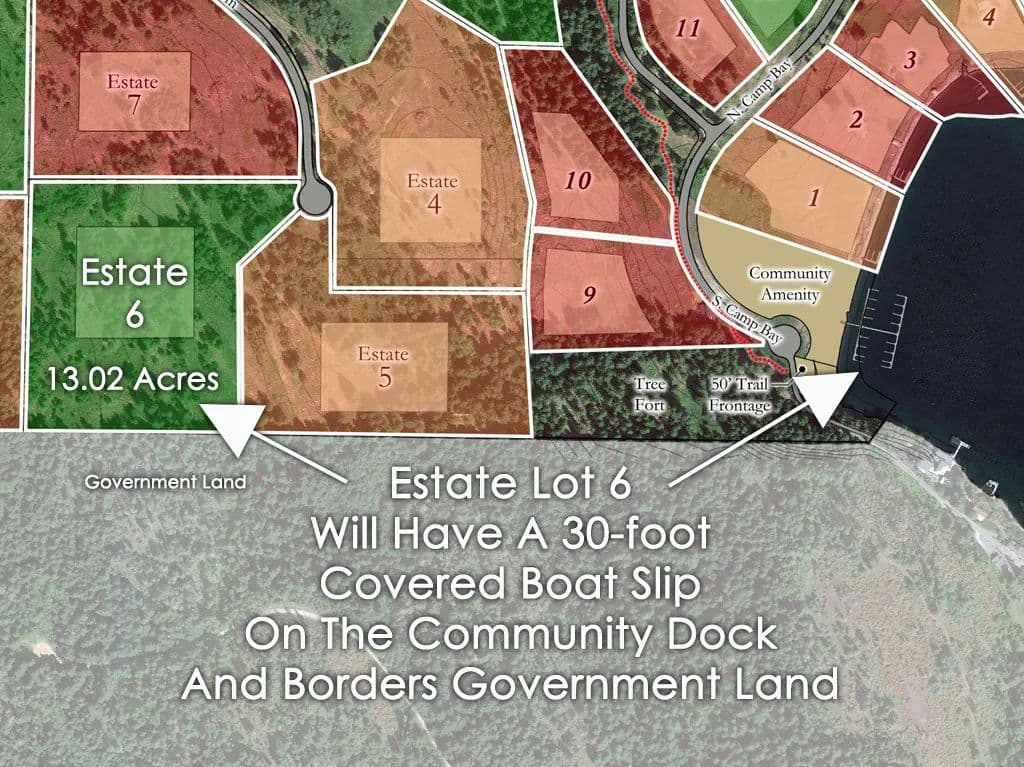 Estate Lot 6 is a 13.01-acre parcel that offers a great mix of treed and open areas and has nice lake views. Located at the end of a cul-de-sac and bordering federal lands to the South, the setting of the property is very private and pristine. A Minimum 5 GPM well is also included as is a covered 30-foot boat slip on the community dock. Camp Bay is a Gated Community that was designed to be a large lot, low density waterfront neighborhood allowing for a lifestyle that appreciates the beautiful shores of such a special lake. With paved roads, trails and open space throughout the community, everything has been thoughtfully considered. Camp Bay is connected to adjacent public lands, allowing for limited further growth in the area, and each lot includes a private well, and high-speed internet and power stubbed to the driveway. Located just 30 minutes from downtown Sandpoint, the home of Schweitzer Mountain Ski Resort! Don’t miss the opportunity to own acreage on famed Lake Pend Oreille.