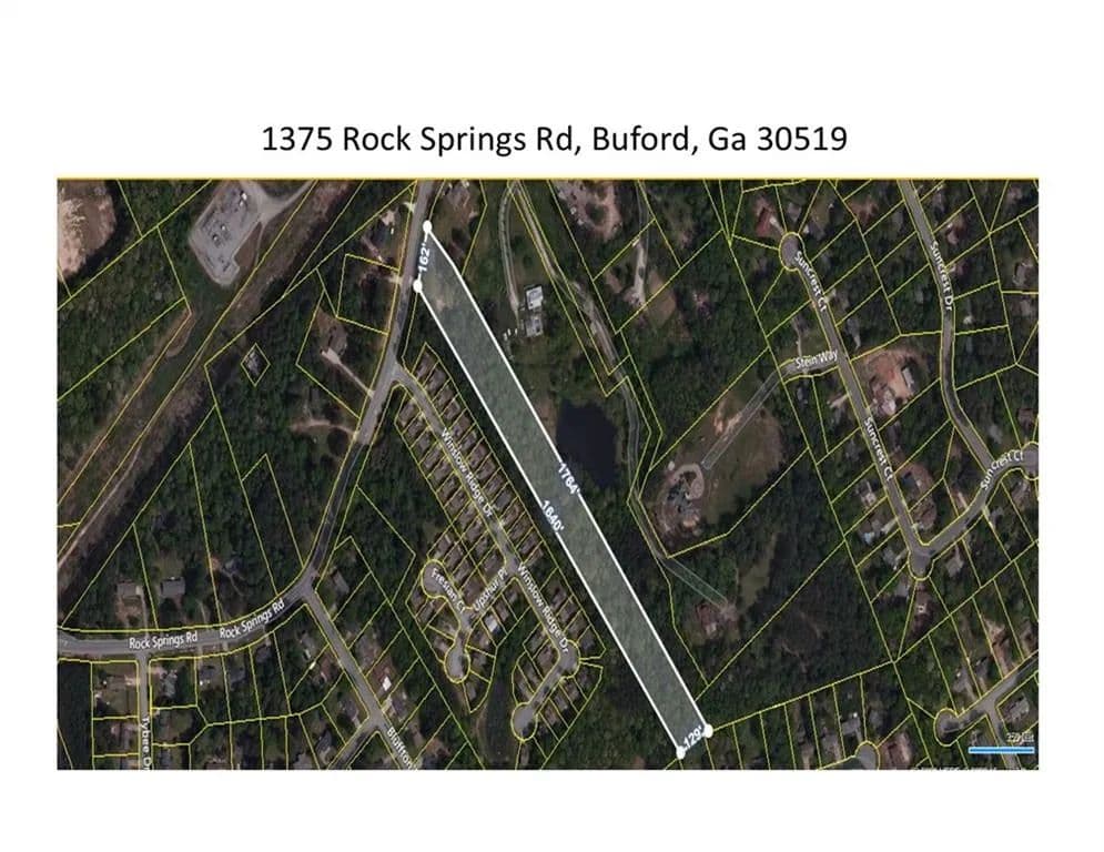 Plus/Minus 15.09 acres Total, Value is in the Land & Location appx 1 mi or less from The Exchange at Gwinnett & Coolray Field (Gwinnett Stadium), Poised to become Gwinnett’s landmark district for live, work & play, Exchange @ Gwinnett combines shopping, food & entertainment w residential flats & office space to create a dynamic destination at the crossroads of I-85 & GA Highway 20. Top Golf, Andretti Racing, Hilton, and MORE!! Tenants on site do not disturb, shown by strict appointment only. 2 parcels totaling +/- 15.09 acres see see 1375 Rock Springs Rd, Buford 4.96 ac w/ 1980 mobile home +/- 1358 sq ft to be sold w 1405 Rock Springs Rd +/-10.13 ac or total +/-15.09 ac 1405 Rock Springs Rd is: +/-10.13 ac w/ 2004 year built +/- 1705 sq ft house Total 15.09 ac includes +/- 4.96 ac 1375 Rock Springs Rd 1405 = Tax ID: R7133-003 +/-10.13 ac 1375 = Tax ID: R7133 014 +/-4.96 ac Total +/- 15.09ac