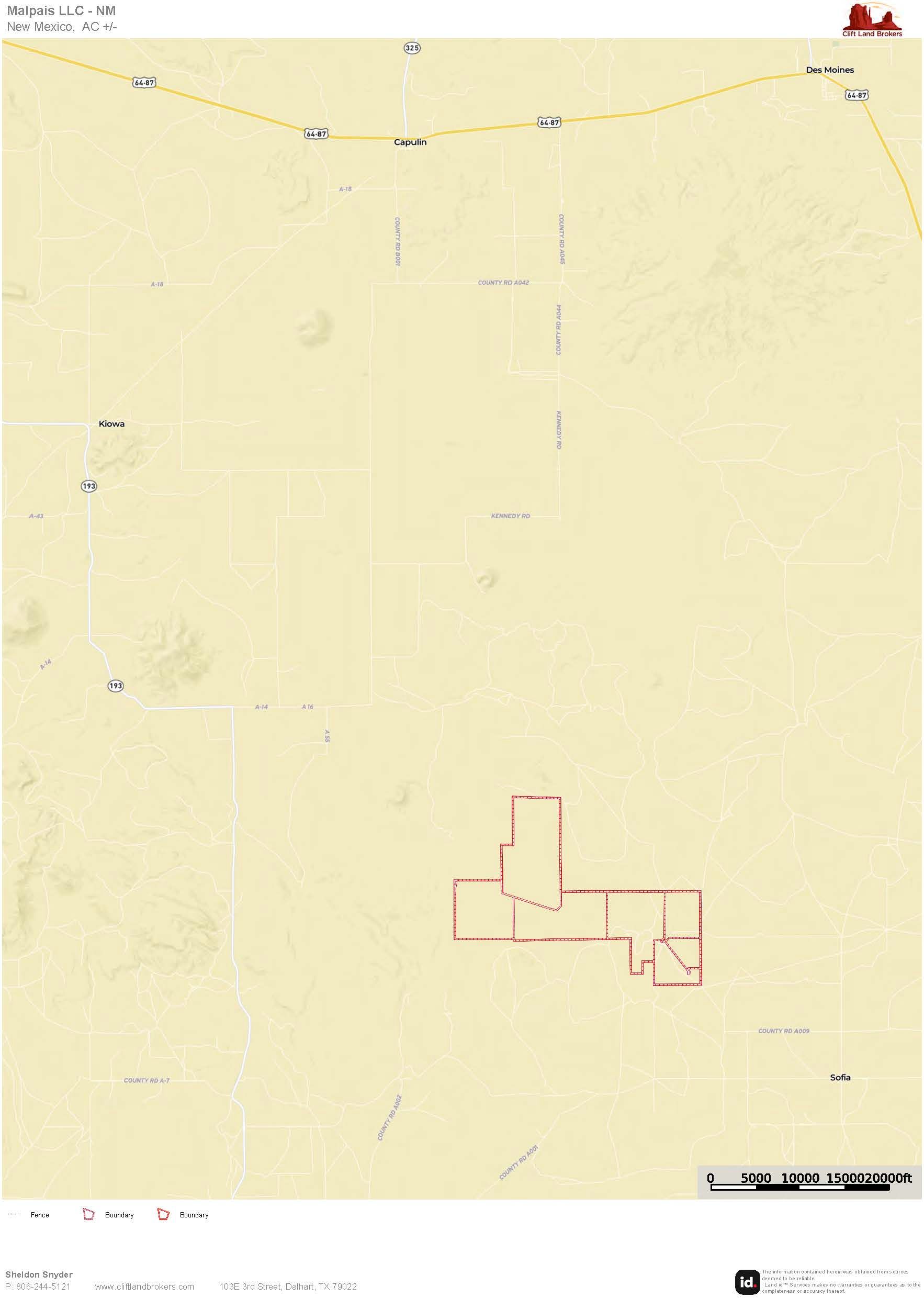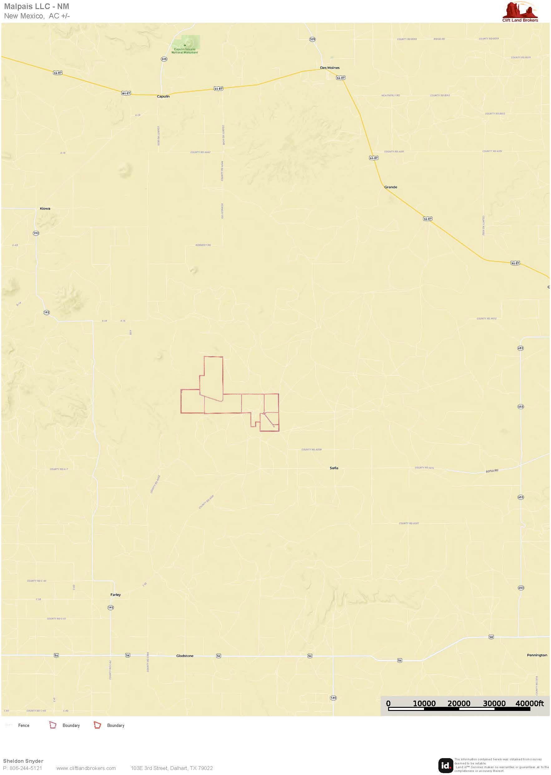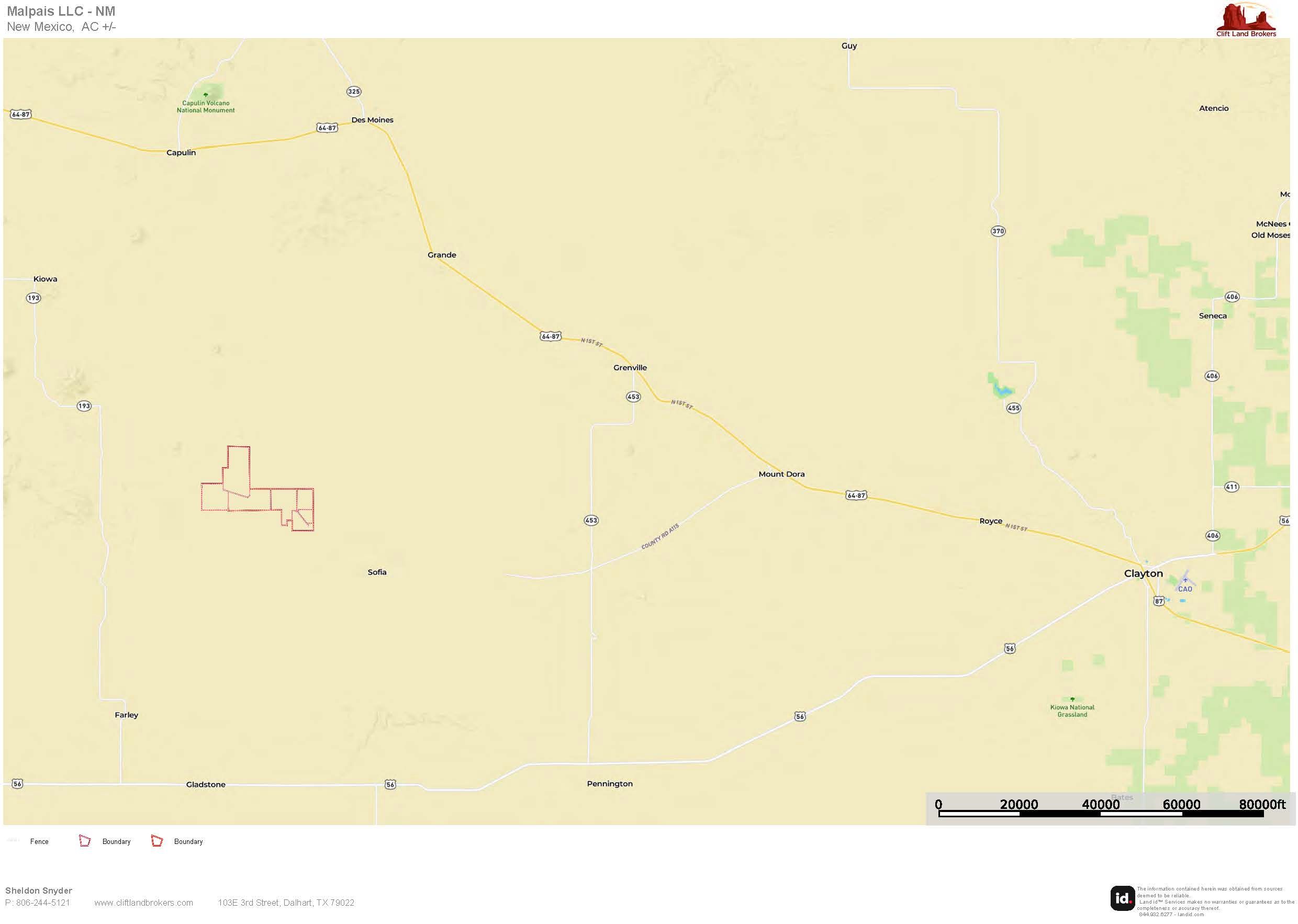 Rancho Malpais is an excellent short-grass ranch set in the heart of Northeast New Mexico, just off the historic Santa Fe Trail. This 5,811± deeded-acre property sits 38 miles west of Clayton and 17 miles south of Des Moines at an average elevation of 6,500’. From nearly every vantage point, the ranch offers sweeping 40-mile views of Sierra Grande, Capulin, the Don Carlos Hills, Barela Mountain, the Seven Sisters (Palo Blanco), Laughlin Peak, and many others notable landmarks.