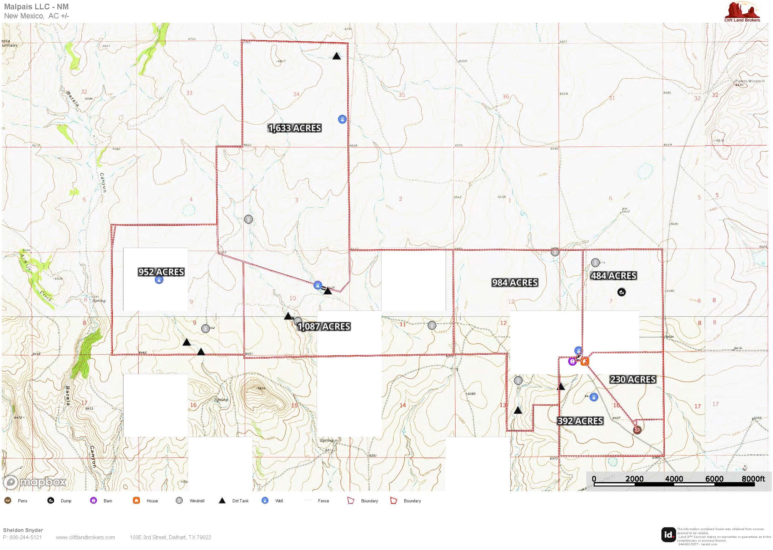 The ranch is divided into five pastures ranging from 950 to 1,650 acres, each with at least two reliable sources of water. Improvements include 7 windmills, 4 solar wells, a submersible well at the house, and 7 dirt tanks that capture runoff.