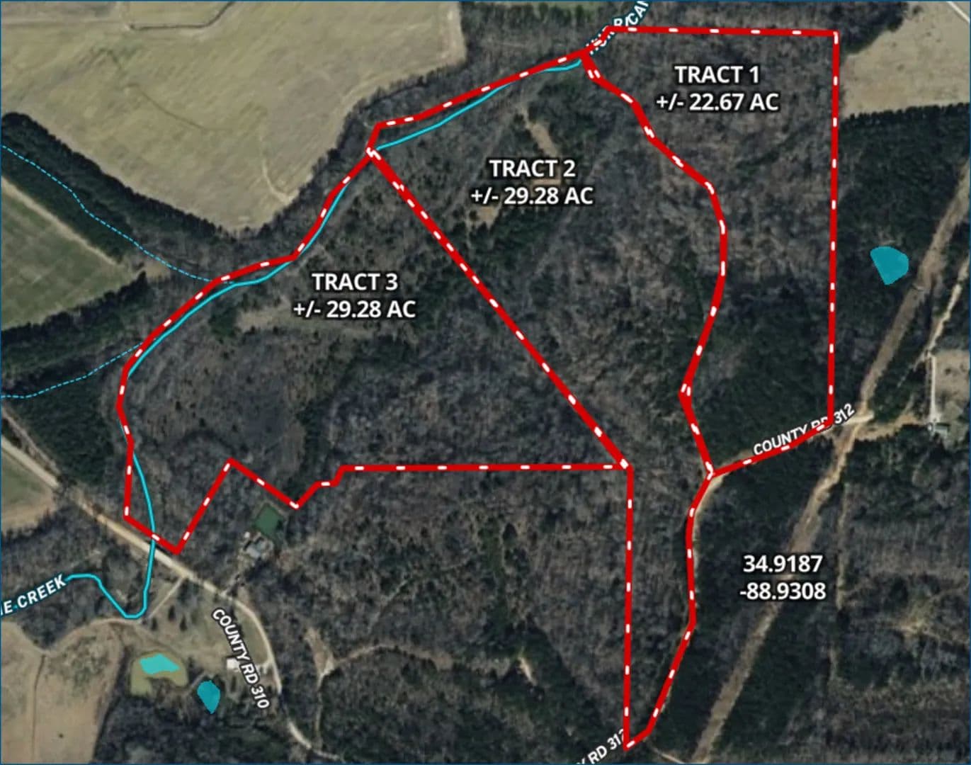 29.28± acre tract of recreational land located on CR 312 in Tippah County. The property consists of mixed pine and hardwood timber of varying ages and some old pasture with the east line being Hurricane Creek creating diverse habitat for deer, turkey and other wildlife. There is frontage along CR 312 interior roads providing excellent access. Utilities available include electricity, community water and natural gas.