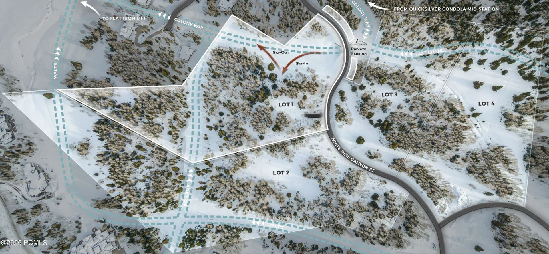 Homestead 1, Bridge Meadow, is easily accessed via a short private driveway from White Pine Canyon Road just uphill from Last Chance's exclusive dedicated parking above Colony Way's turn at the toe of the slope of Pinecone Ridge. This location offers expansive architectural potential along the ski run to create a private but easily accessed alpine oasis. Mature pines encircle the lot but give way to E and NE down-canyon and cross-canyon views. The homestead receives southern exposure along its entry corridor for bright winter days. Quiet enjoyment is guaranteed with just one bordering homestead and ample forest between the two. Last Chance homesteads have been approved to join The Homeowners Association for The Colony at White Pine Canyon, ensuring a seamless blend of exclusivity and community. This will include access to the highly anticipated HOA clubhouse which is currently under construction.