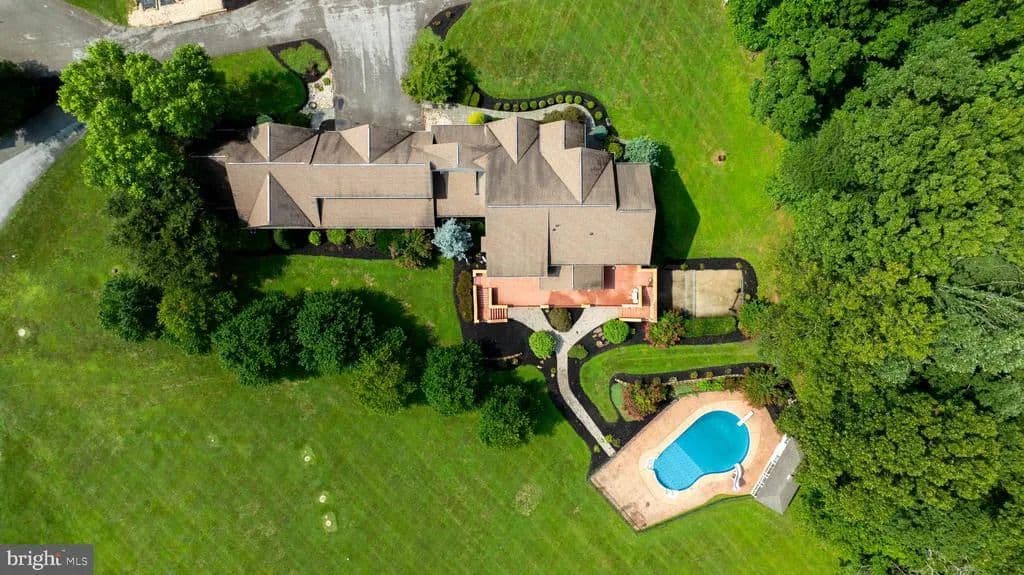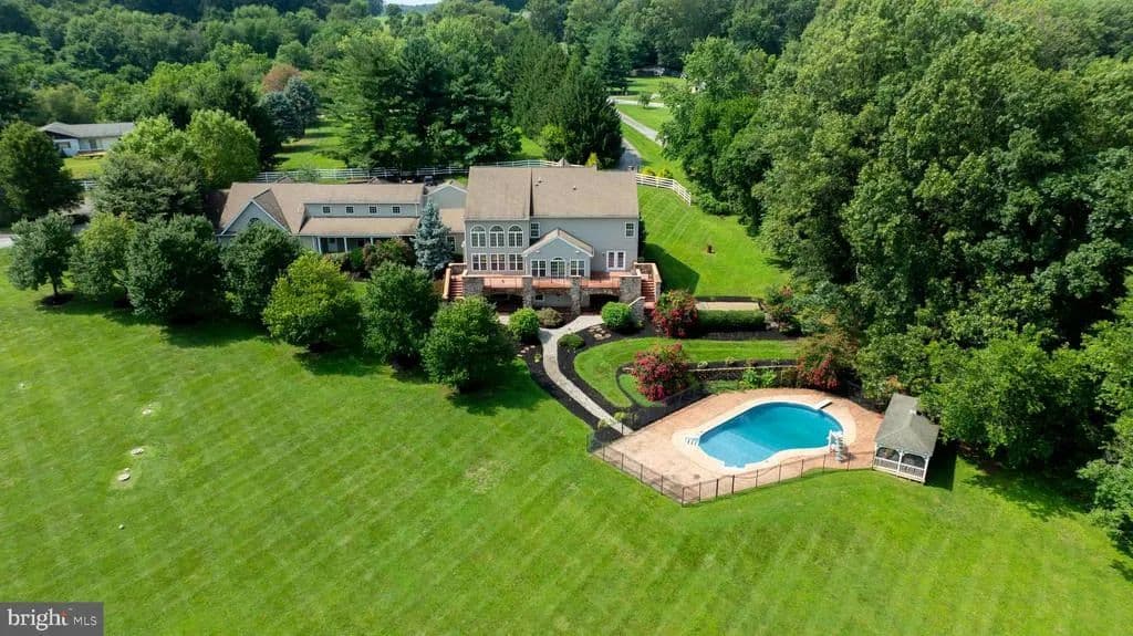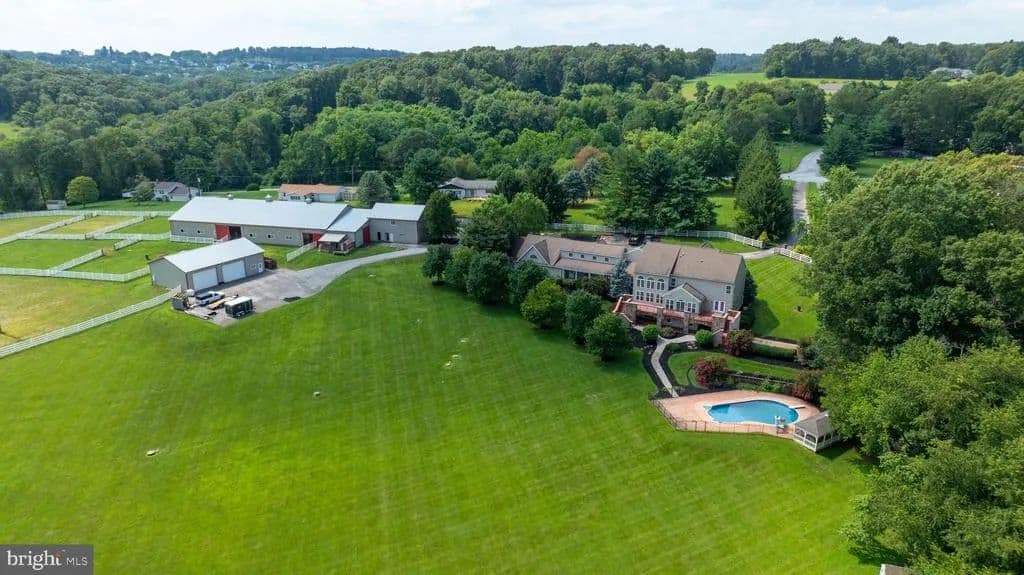 This exceptional 18-acre horse farm features a spacious estate exceeding 9,700 square feet of finished living space, complete with separate accommodations for in-laws. Nestled in a private setting, the property includes fenced pastures with a run-in shed, a 140’ x 70’ barn housing a 120’ x 70’ indoor riding arena and ten horse stalls, as well as a 60’ x 40’ shop and a 27’ x 32’ woodshop to support agricultural activities. The outdoor space boasts a large patio, an in-ground swimming pool with a pool house and gazebo area, and offers stunning views of lush greenery alongside a creek. This well-equipped property not only facilitates daily farm operations but also provides a move-in ready home with ample family space and luxurious features. The main level showcases beautiful hardwood flooring, a private office, and a great room with a cathedral ceiling, while the gourmet kitchen is equipped with a double oven, granite countertops, a breakfast area, and a center island. The upper level includes a master suite featuring herringbone hardwood flooring, a walk-in closet, and a luxurious bath designed for a spa-like experience, complete with a jetted tub and a dual-sided walk-in shower. The fully finished lower level offers a recreation room with a wet bar and pool table, a movie room, four additional bedrooms, and a full bath, creating a complete separate living area. An attached three-car garage connects the main residence to the in-law quarters, which includes a full kitchen, living and dining areas, two bedrooms, a walk-in closet with laundry hookups, and a handicap-accessible full bath, making this property a comprehensive and desirable estate