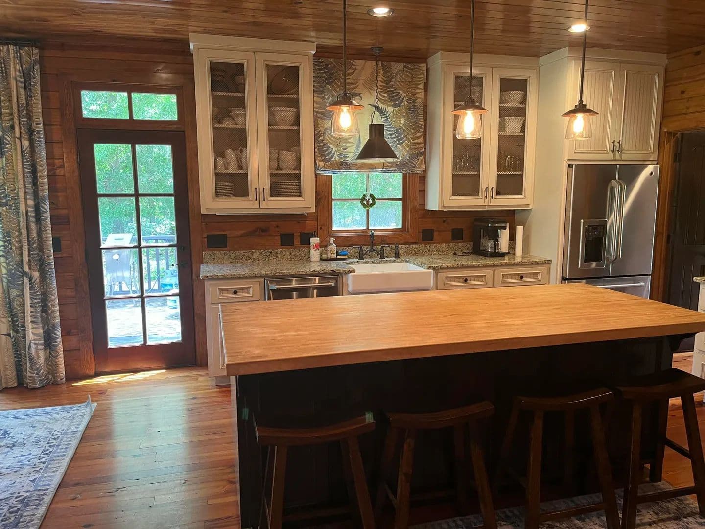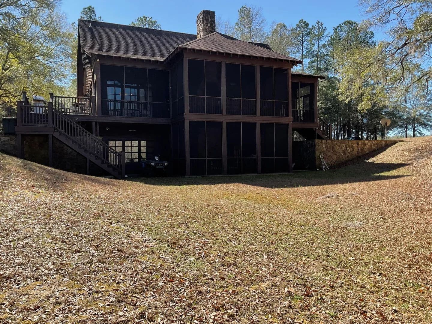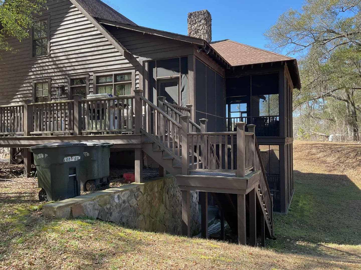 Main Level: A spacious kitchen with custom-designed cabinets and a large island seating four, an inviting family room, a luxurious master suite, a half bath, and a grand stone fireplace adorned with beautiful deer chandeliers, enhancing the home's hunting lodge ambiance. Step onto the screened-in deck, complete with a second fireplace, and take in breathtaking river views.