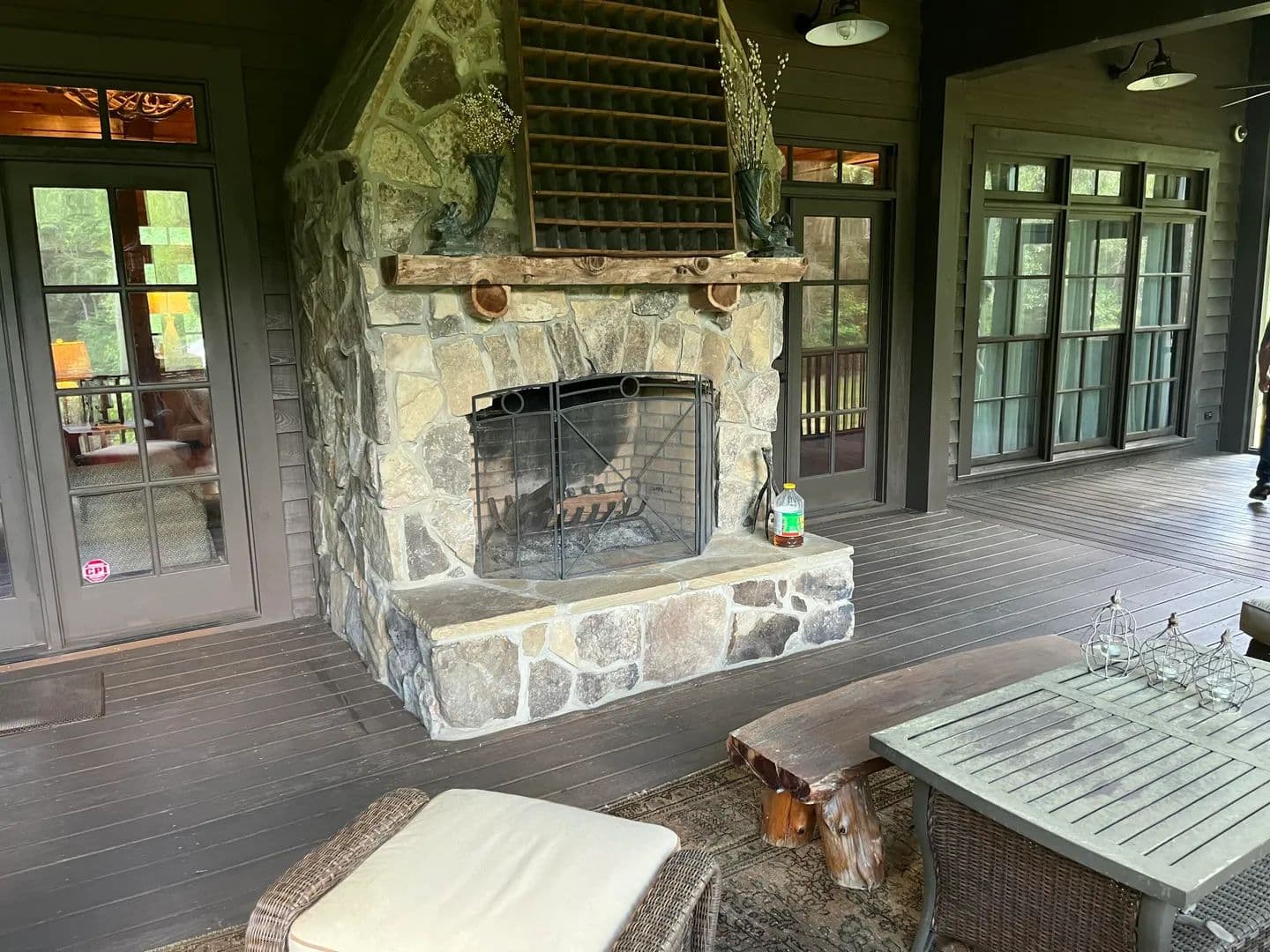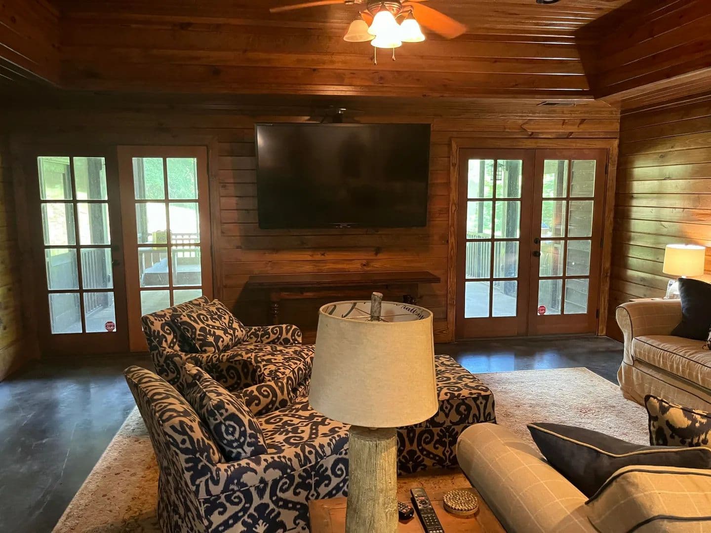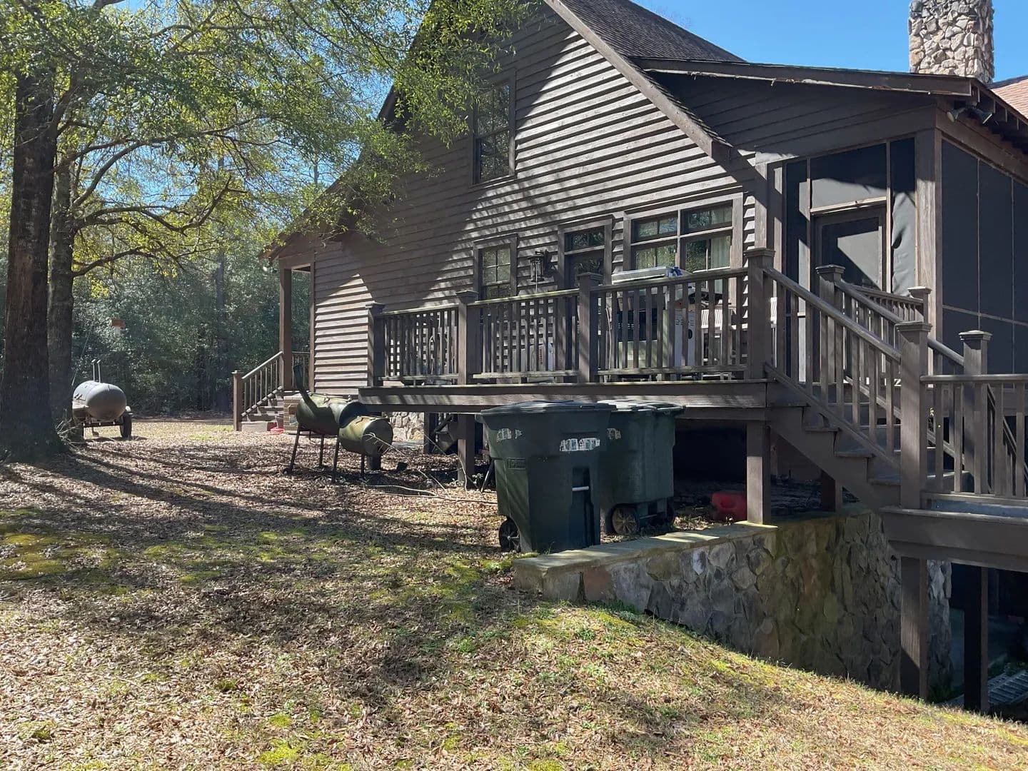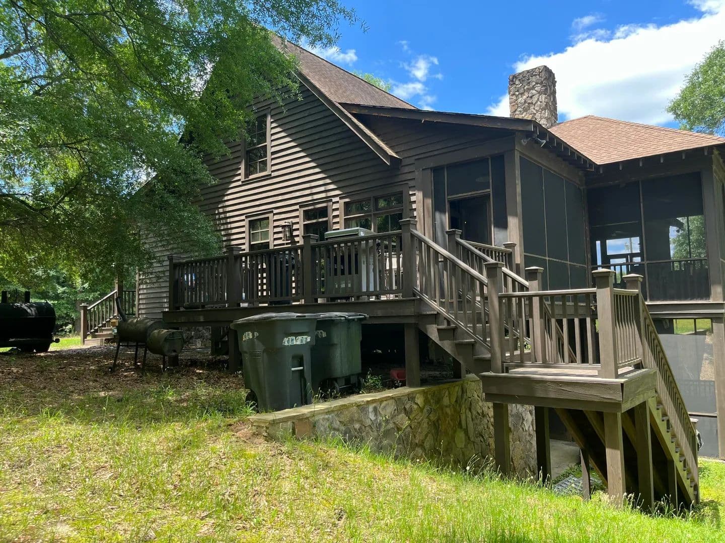 Main Level: A spacious kitchen with custom-designed cabinets and a large island seating four, an inviting family room, a luxurious master suite, a half bath, and a grand stone fireplace adorned with beautiful deer chandeliers, enhancing the home's hunting lodge ambiance. Step onto the screened-in deck, complete with a second fireplace, and take in breathtaking river views.