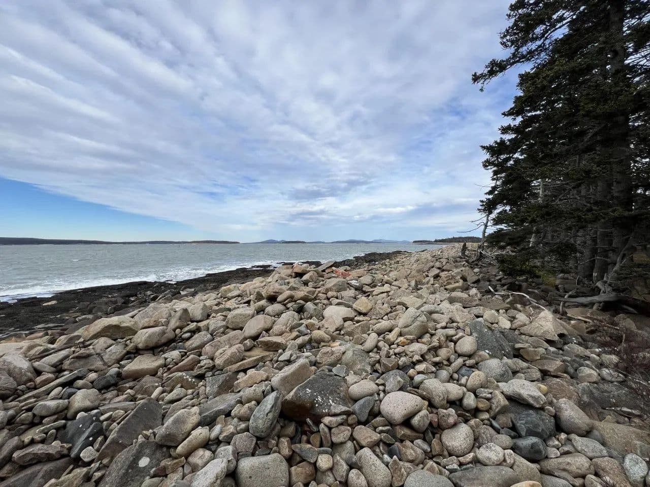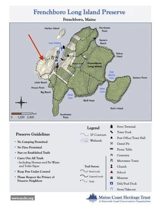 Large bold oceanfront parcel on the west facing shore of Frenchboro looking out to open ocean with western views. Tumbled rock and ledge shoreline with gradual elevation up to the main road with moss covered woods and ledges for beautiful and very private house setting to watch sunsets over Swans Island and beyond. The property connects on to the hiking trails for the entire island trail system right from your property