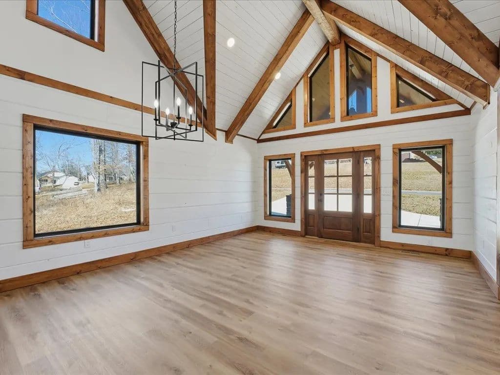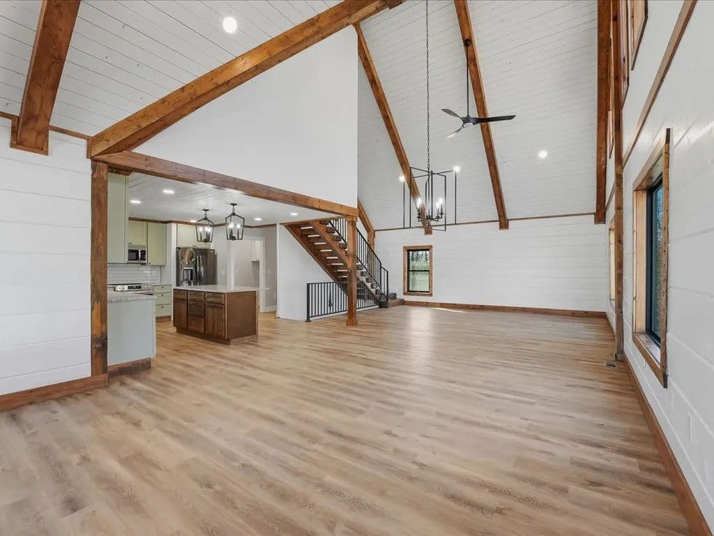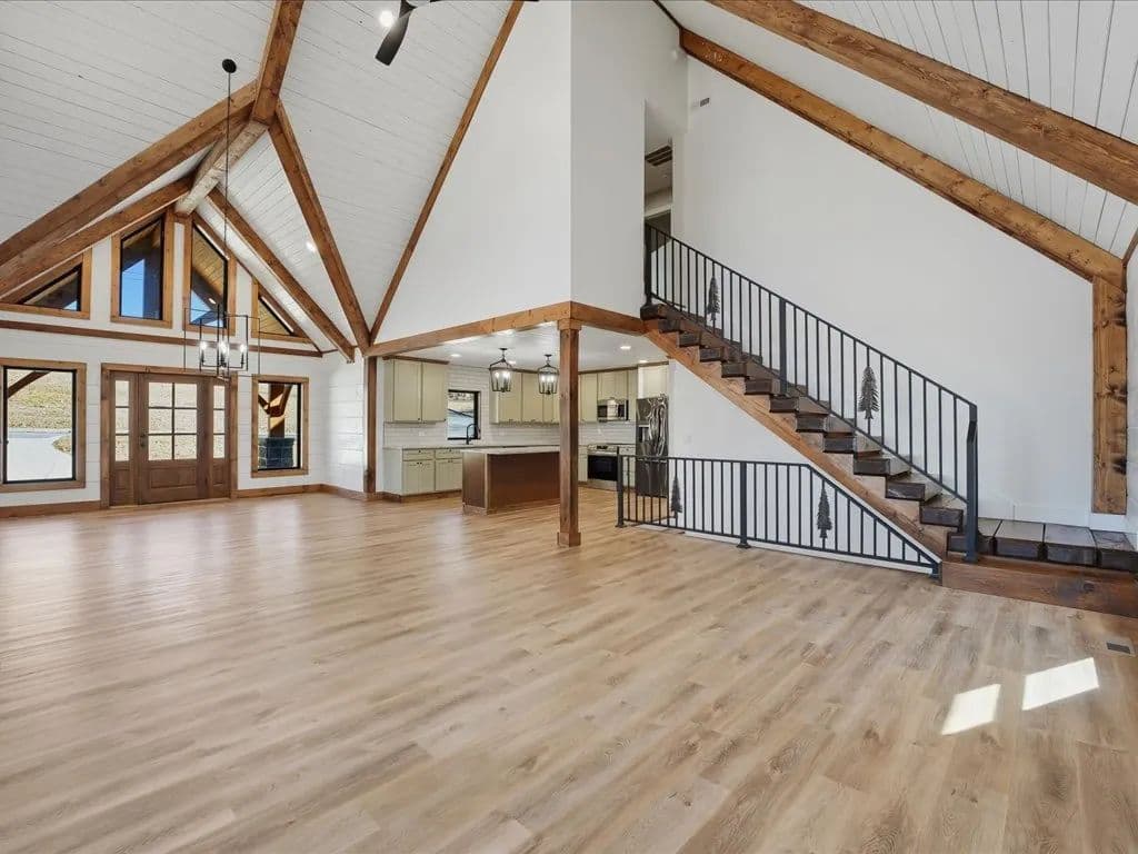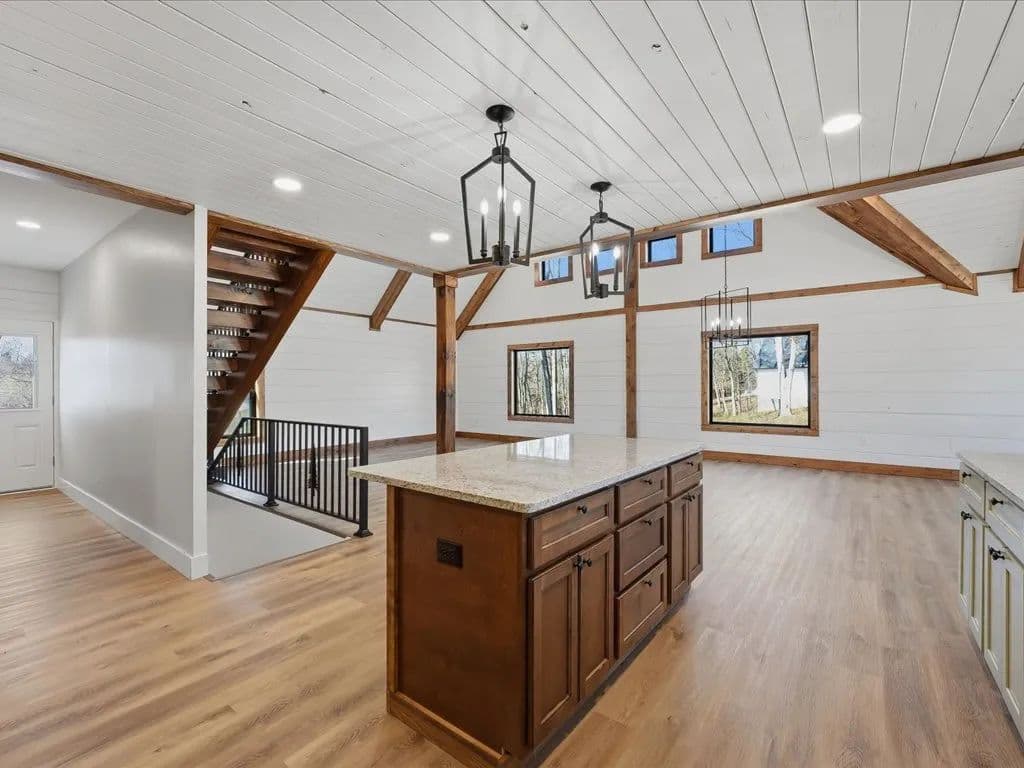 When you walk through the front door, the first thing you notice is the openness. The ceilings rise above you, framed with warm wood beams and shiplap walls that give the home character without feeling heavy. Natural light pours in, and the entire main living area flows together in a way that makes everyday life easy. Whether you are cooking dinner, hosting friends, or just enjoying a quiet evening, everything feels connected.