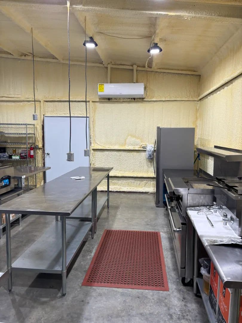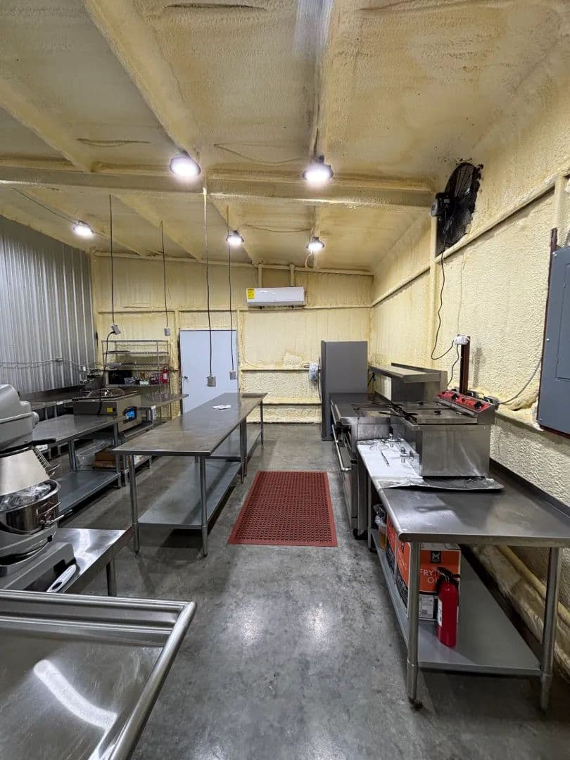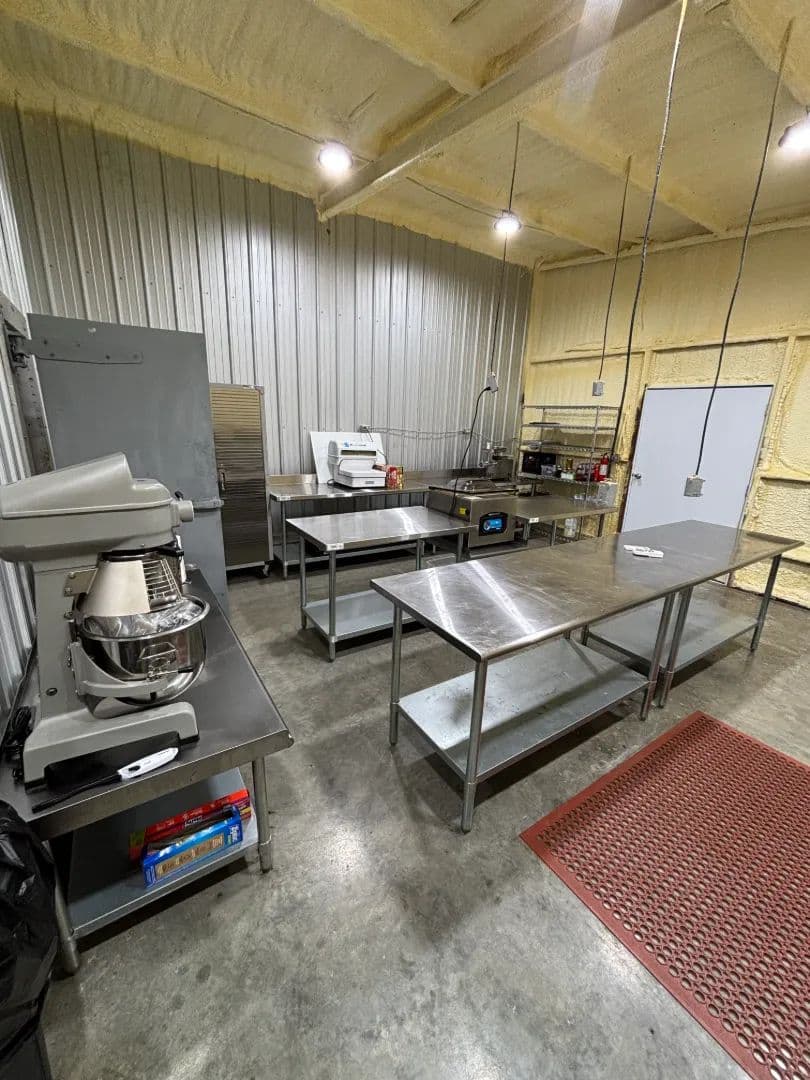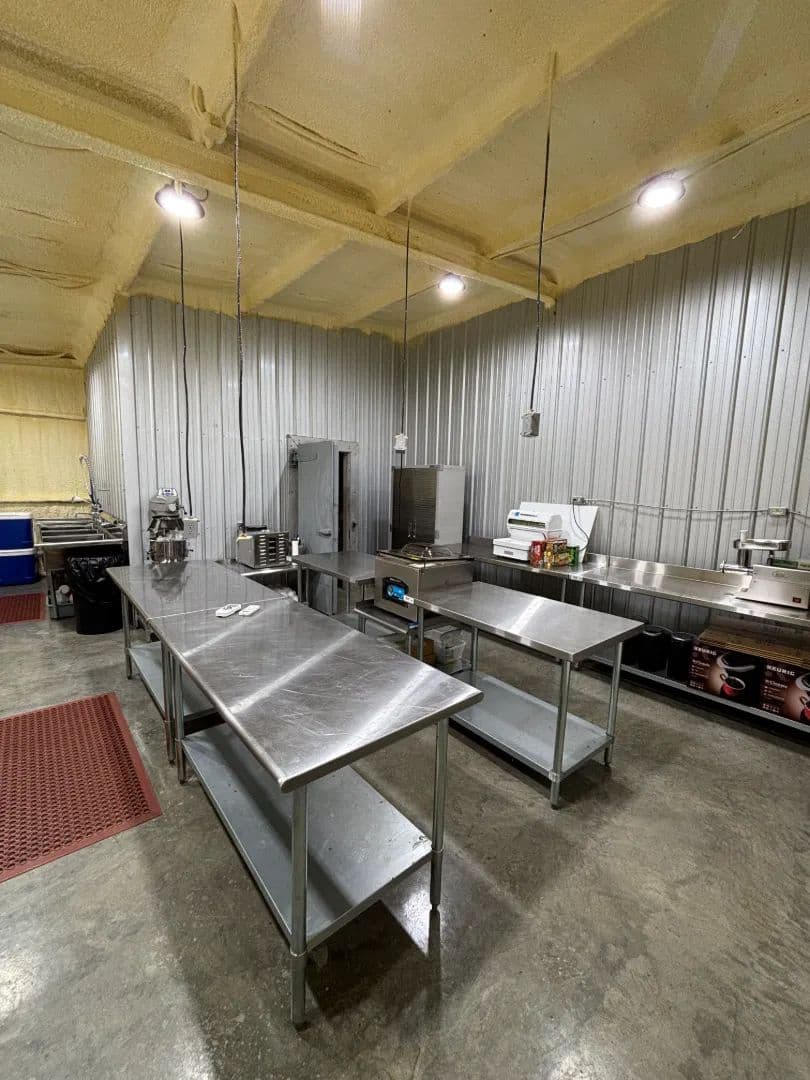 At the heart of the 45± acre property sits a fully renovated 2,750± square foot main home, warm and inviting with its blue and white pine walls, granite countertops, and spacious dual living areas. Just steps away, a climate-controlled commercial kitchen stands ready for family meals or large gatherings, complete with stainless surfaces, top-tier appliances, and a walk-in cooler
