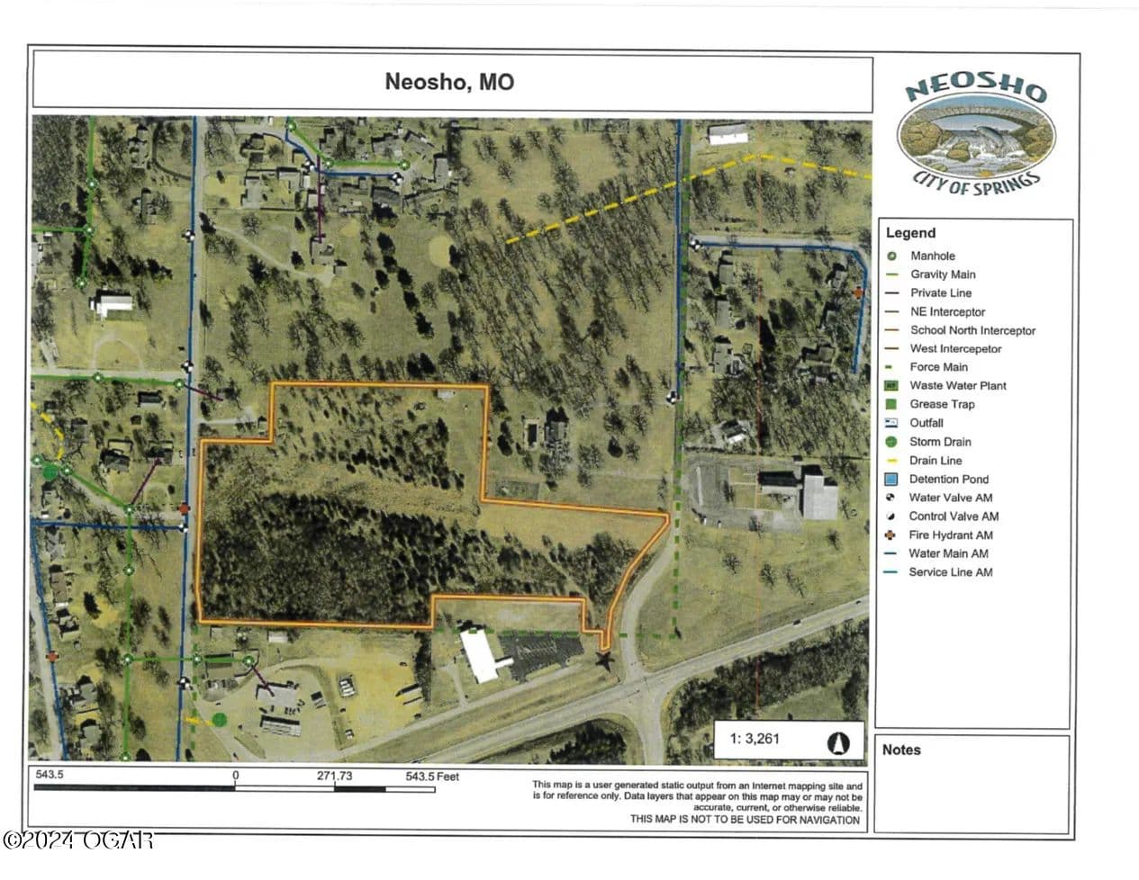 Gorgeous rolling 13.41 acres inside city limits. Mature trees. Several excellent building sites. Large storage building with 3 garage doors and metal roof wired for electricity. 501 feet of road frontage on Oak Ridge Drive and goes all the way to South High Street.. City water and sewer are shown on Neosho, MO aerial