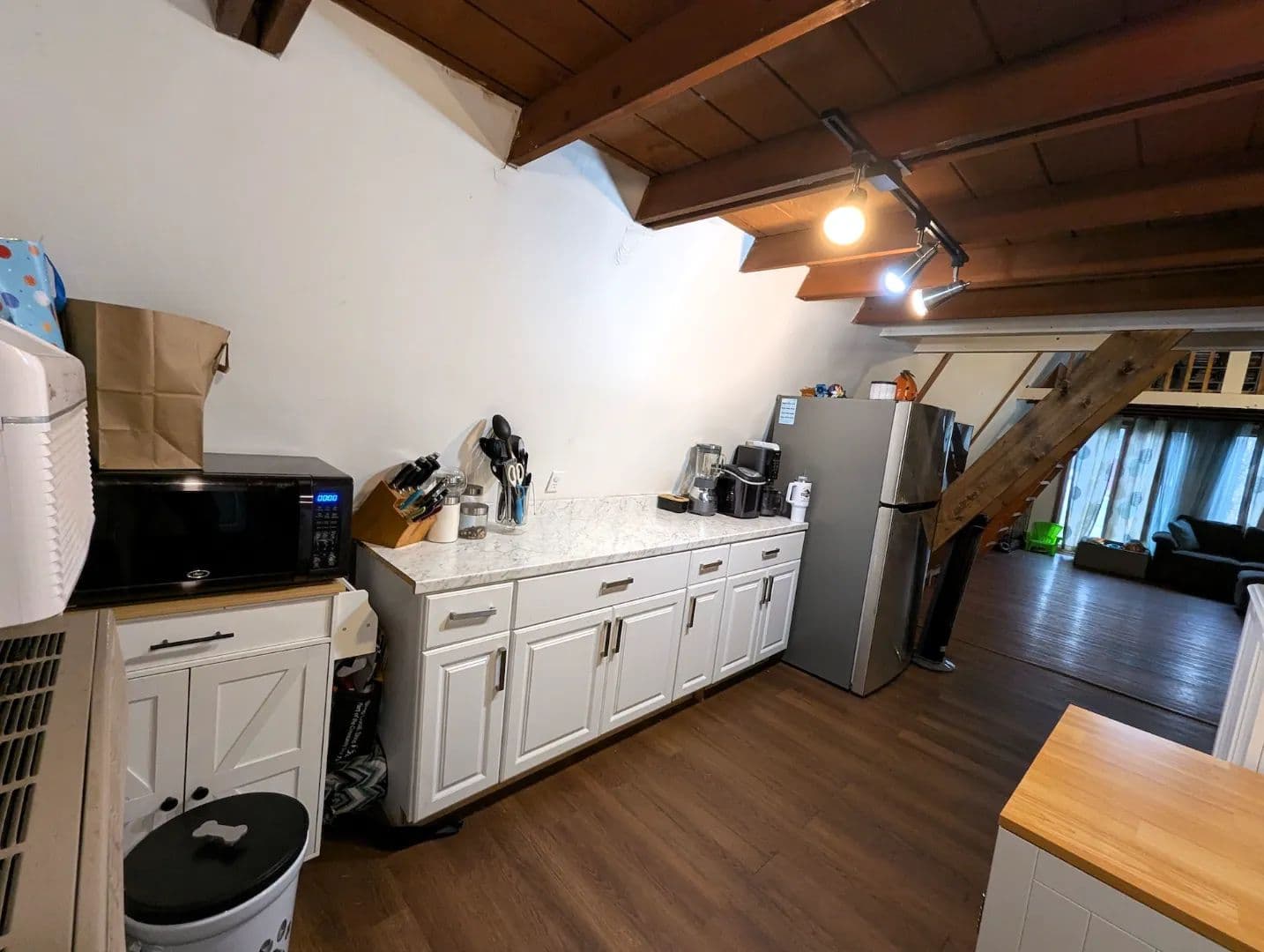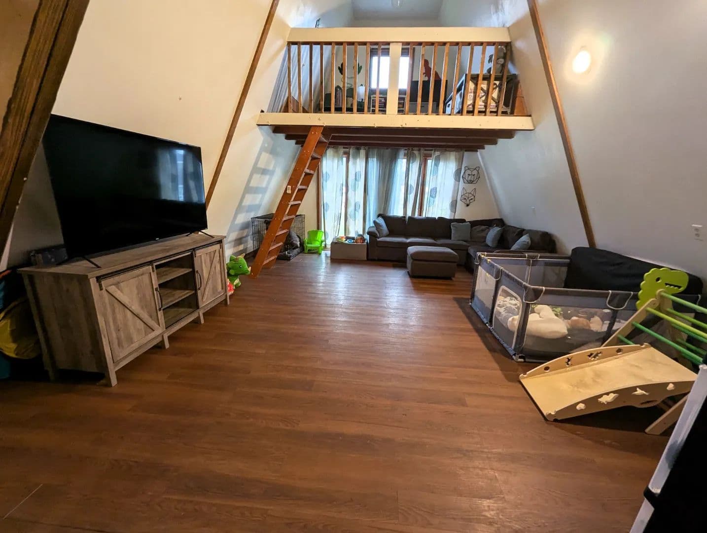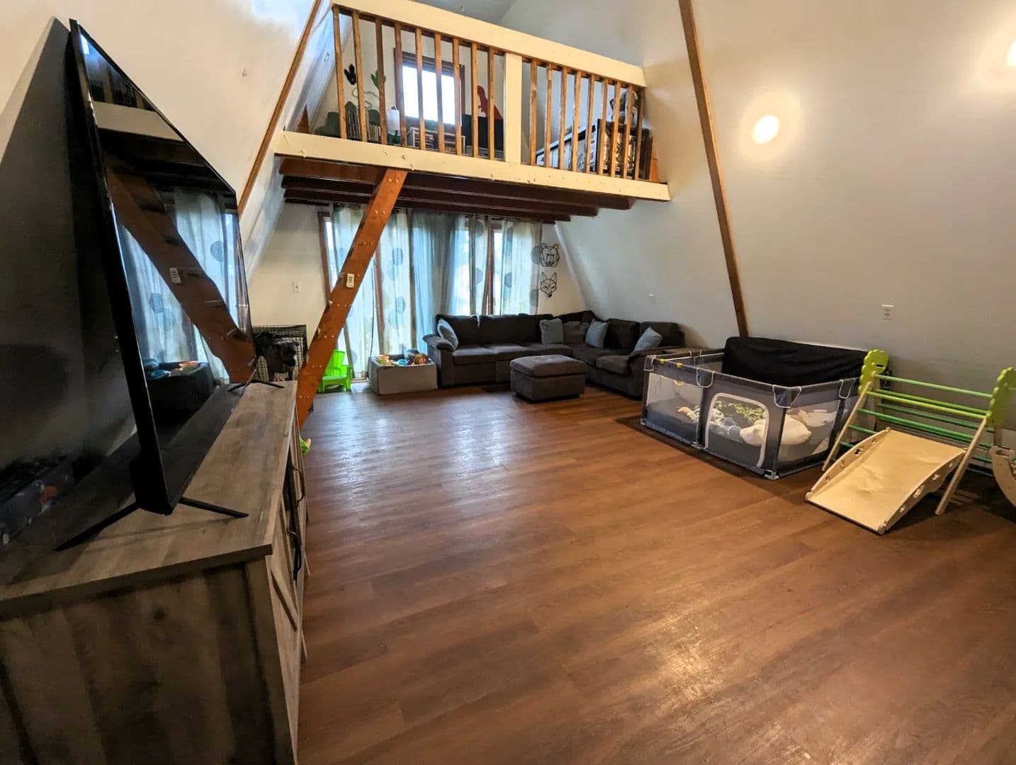 The inviting living room features vaulted ceilings and plank flooring creating a warm and comfortable space. On each end of the living room are steps leading to two separate loft spaces currently utilized as bedrooms providing a unique and efficient use of space.
