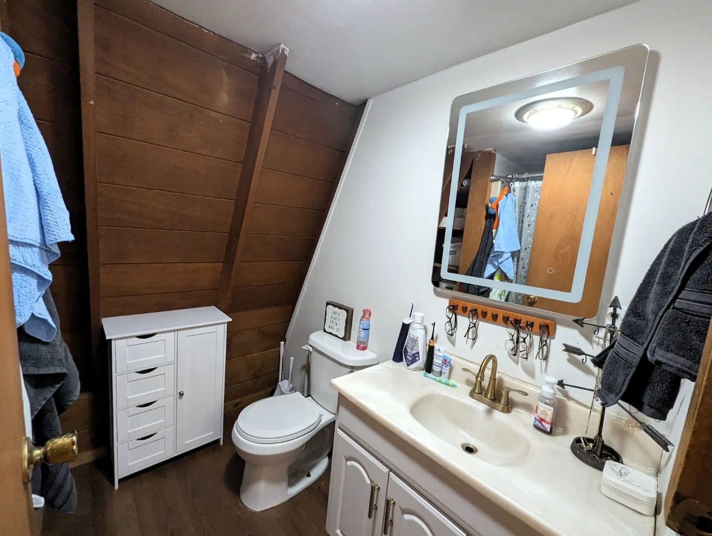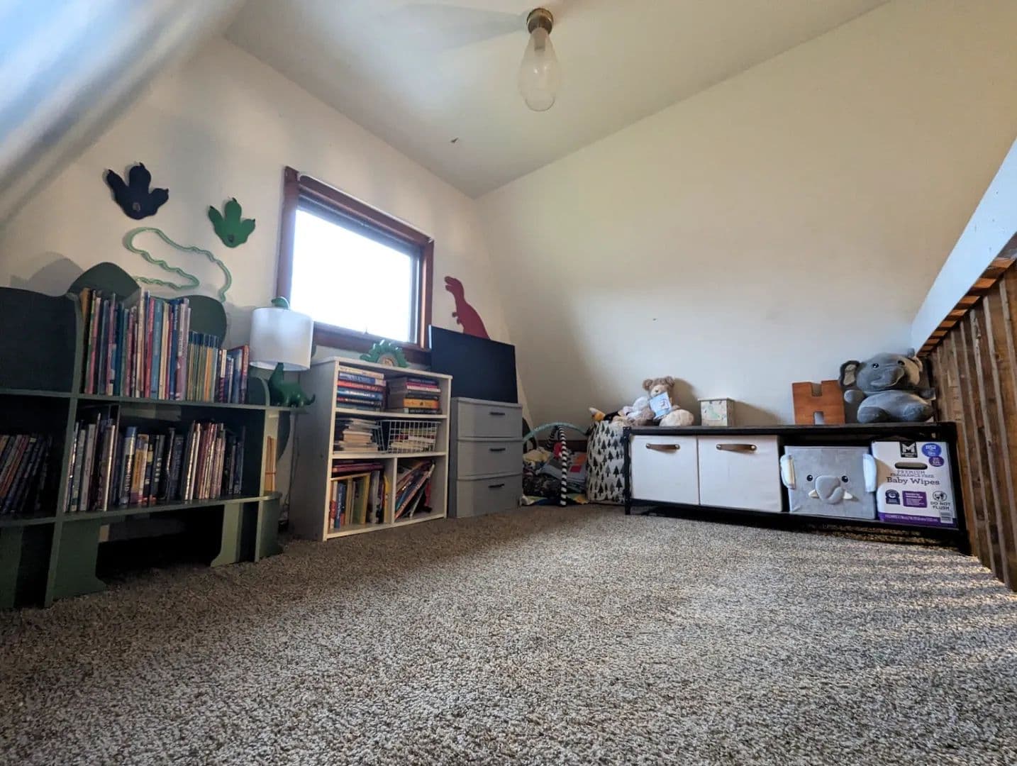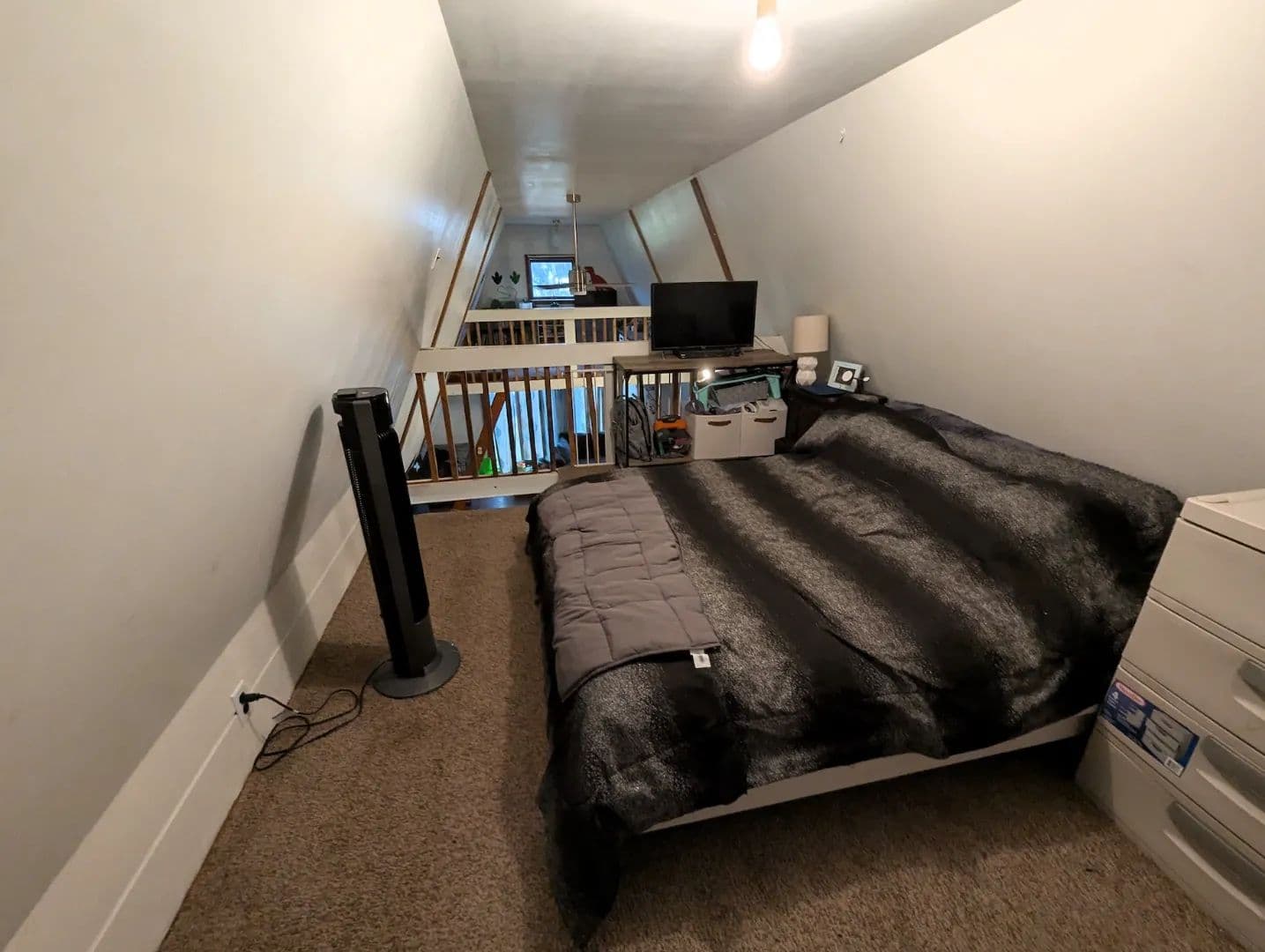The inviting living room features vaulted ceilings and plank flooring creating a warm and comfortable space. On each end of the living room are steps leading to two separate loft spaces currently utilized as bedrooms providing a unique and efficient use of space.