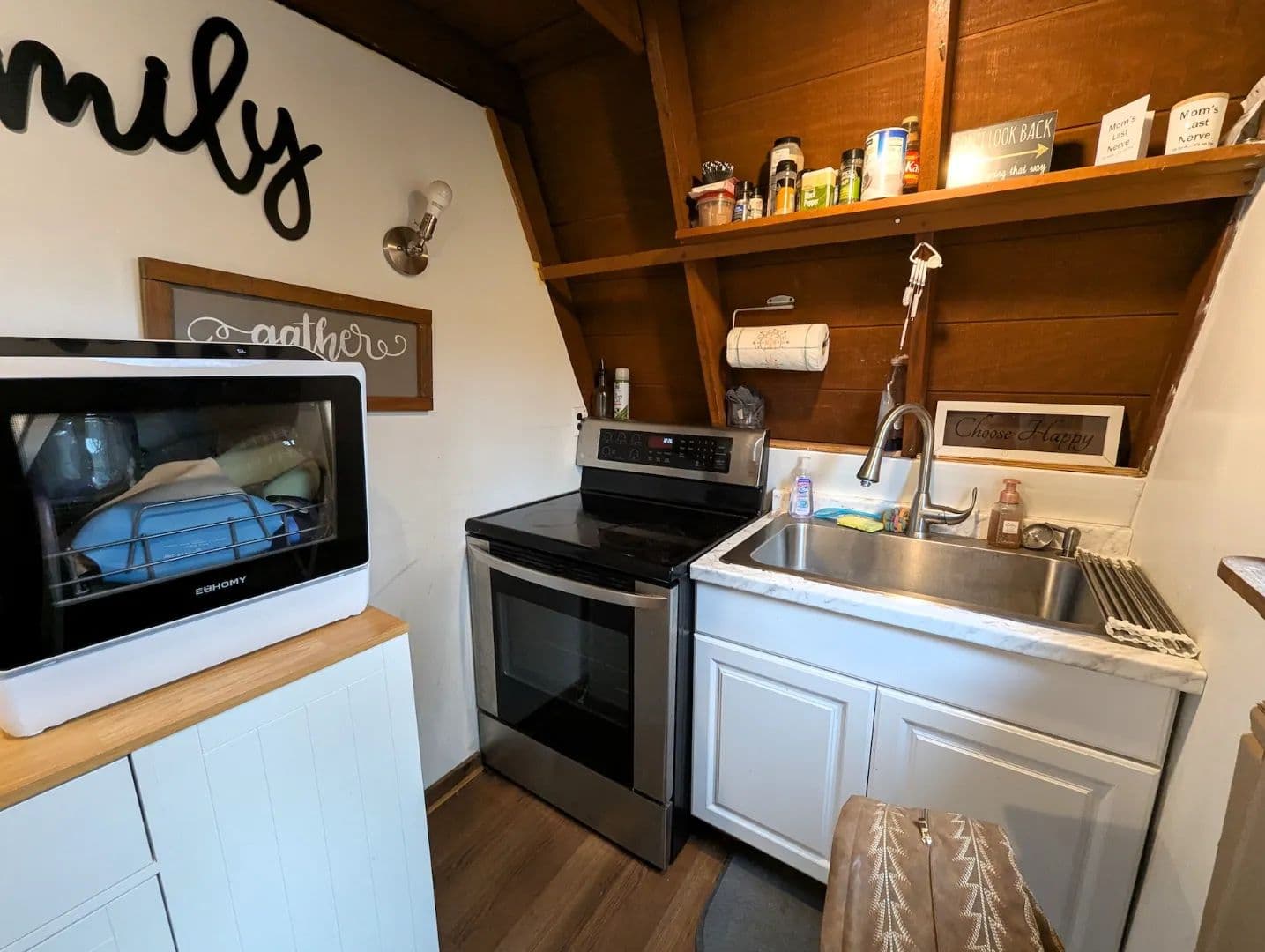 Tucked back off the road is this cozy A-frame style home set on a 36 x 20 block foundation that serves as a garage. Exterior steps lead to the main level of the home where you’ll enter from the back porch into a functional kitchen that overlooks the open living space.
