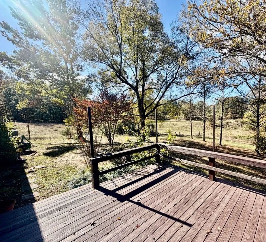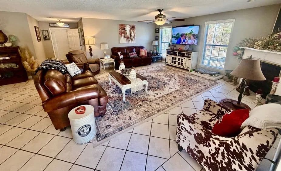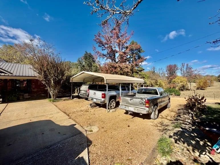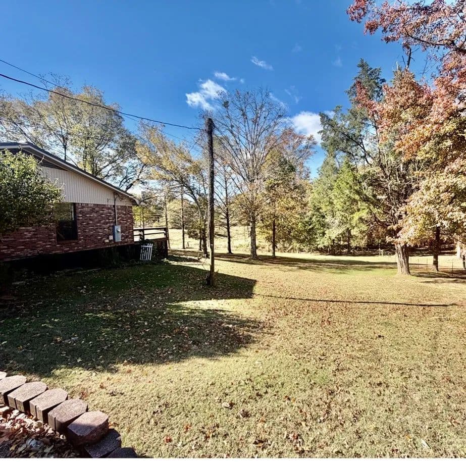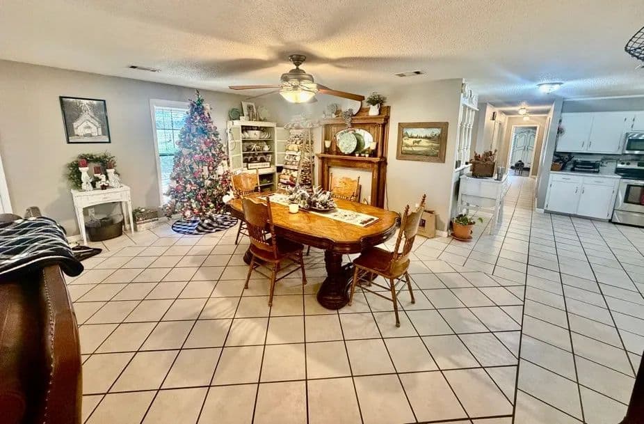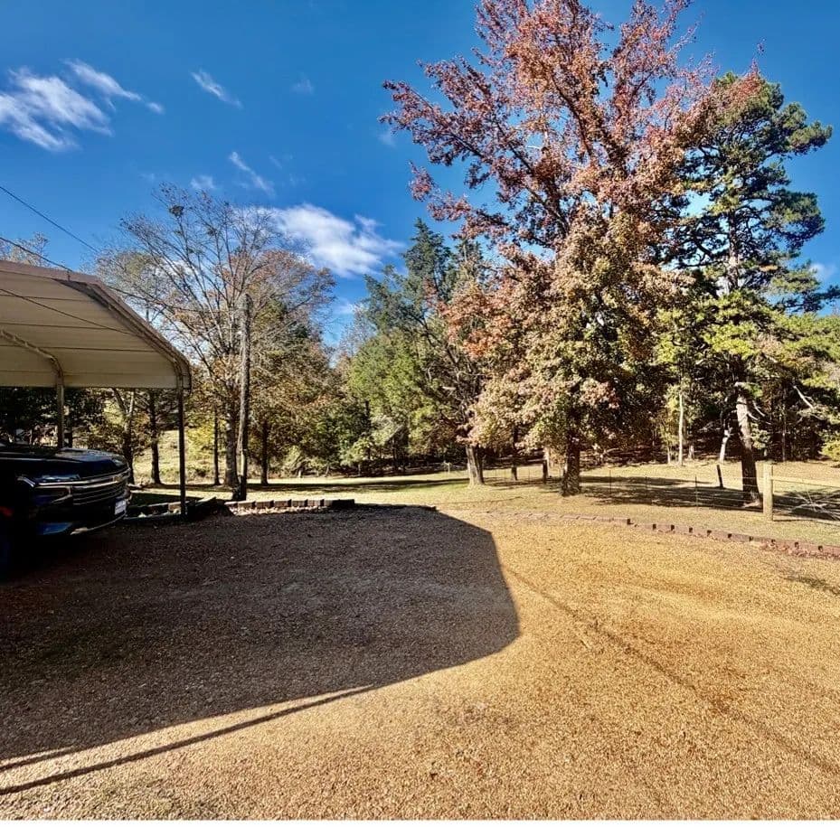 This charming, renovated brick home sits on 1± acre in a peaceful countryside setting and features a covered 2-car carport. The property has been updated, featuring an extension that adds a large living room and storage room, as well as a stained deck overlooking a spacious backyard. The home offers 2,338 square feet of heated and cooled living space, three bedrooms and two bathrooms, with an open floor plan connecting the kitchen to the living room. The kitchen is equipped with a walk-in pantry, microwave, electric stove, dishwasher, refrigerator, and a large stainless-steel sink. A convenient laundry closet is also located in the kitchen, complete with a large white metal shelf. The living room is cozy, featuring a gas fireplace and lots of space for family gatherings. The primary bedroom and bathroom, which were part of the addition, include a bay window, custom cabinets, and a walk-in closet. The home has ceramic tile flooring throughout, with the primary bedroom featuring stained concrete, while the two guest bedrooms have vinyl plank flooring.