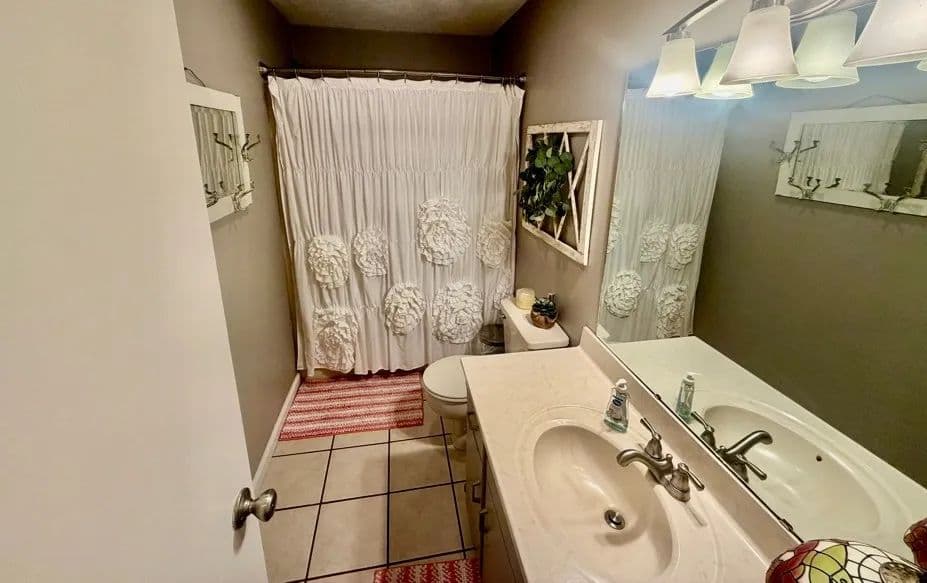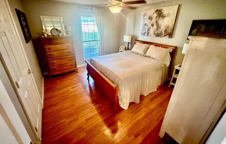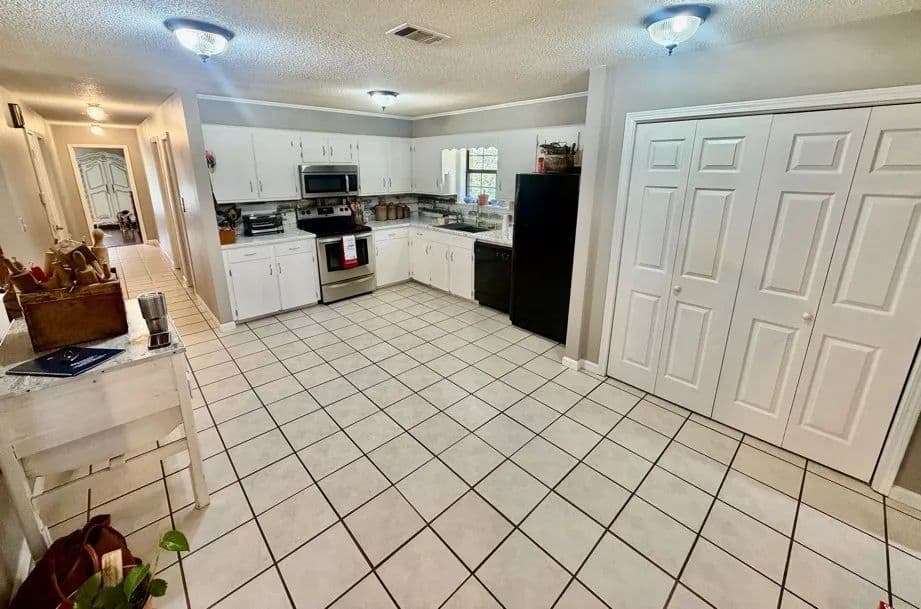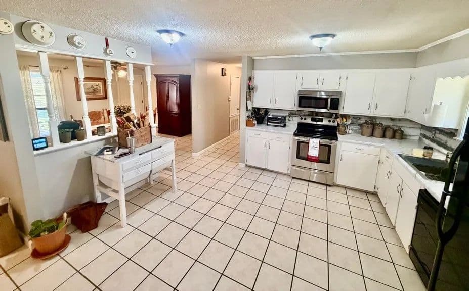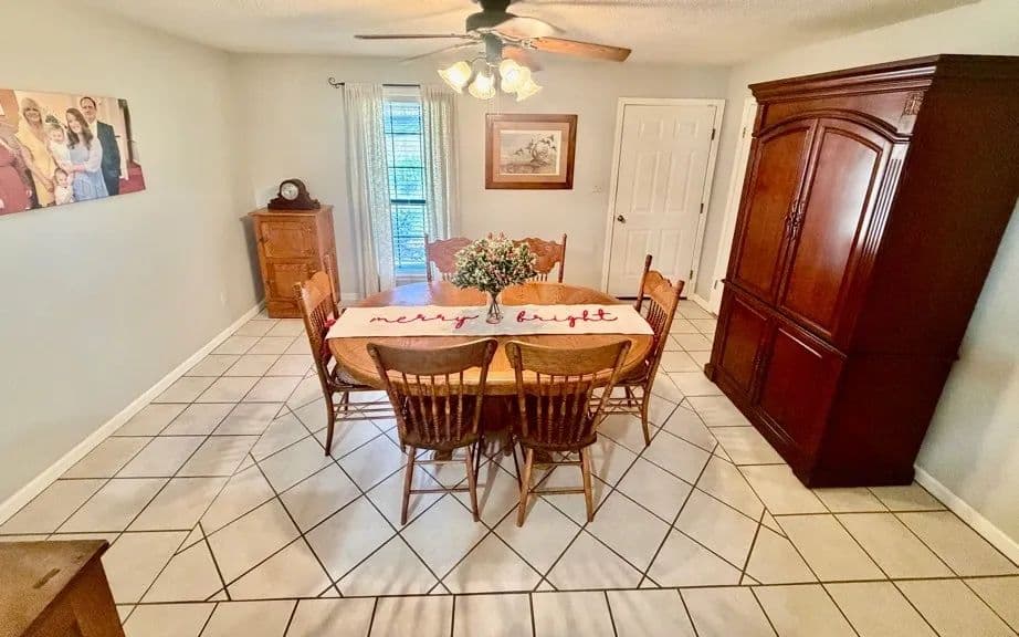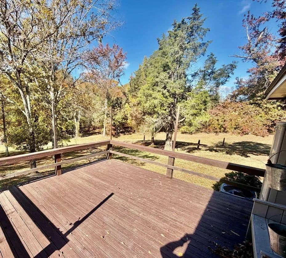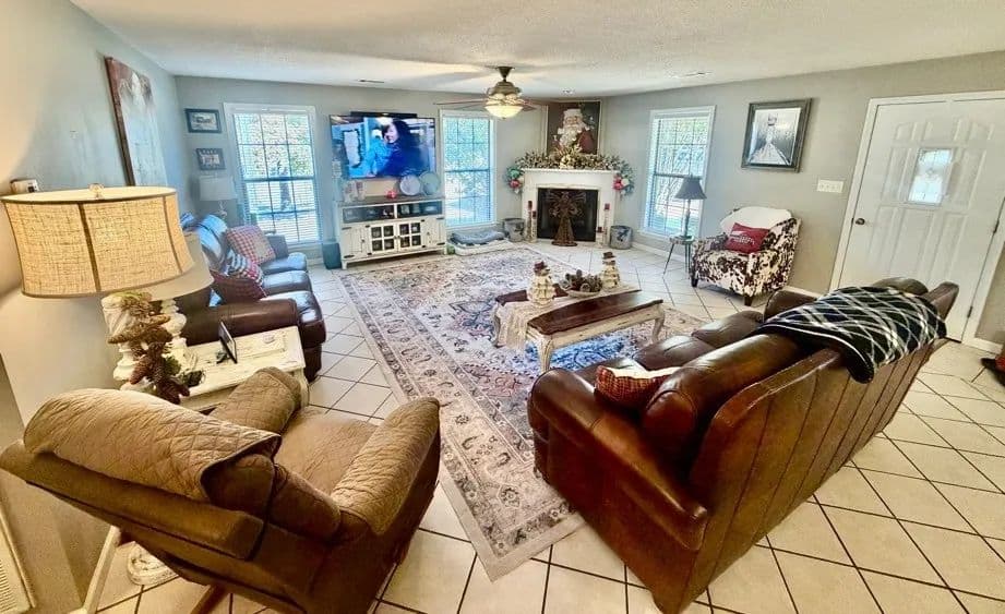 This charming, renovated brick home sits on 1± acre in a peaceful countryside setting and features a covered 2-car carport. The property has been updated, featuring an extension that adds a large living room and storage room, as well as a stained deck overlooking a spacious backyard. The home offers 2,338 square feet of heated and cooled living space, three bedrooms and two bathrooms, with an open floor plan connecting the kitchen to the living room. The kitchen is equipped with a walk-in pantry, microwave, electric stove, dishwasher, refrigerator, and a large stainless-steel sink. A convenient laundry closet is also located in the kitchen, complete with a large white metal shelf. The living room is cozy, featuring a gas fireplace and lots of space for family gatherings. The primary bedroom and bathroom, which were part of the addition, include a bay window, custom cabinets, and a walk-in closet. The home has ceramic tile flooring throughout, with the primary bedroom featuring stained concrete, while the two guest bedrooms have vinyl plank flooring.