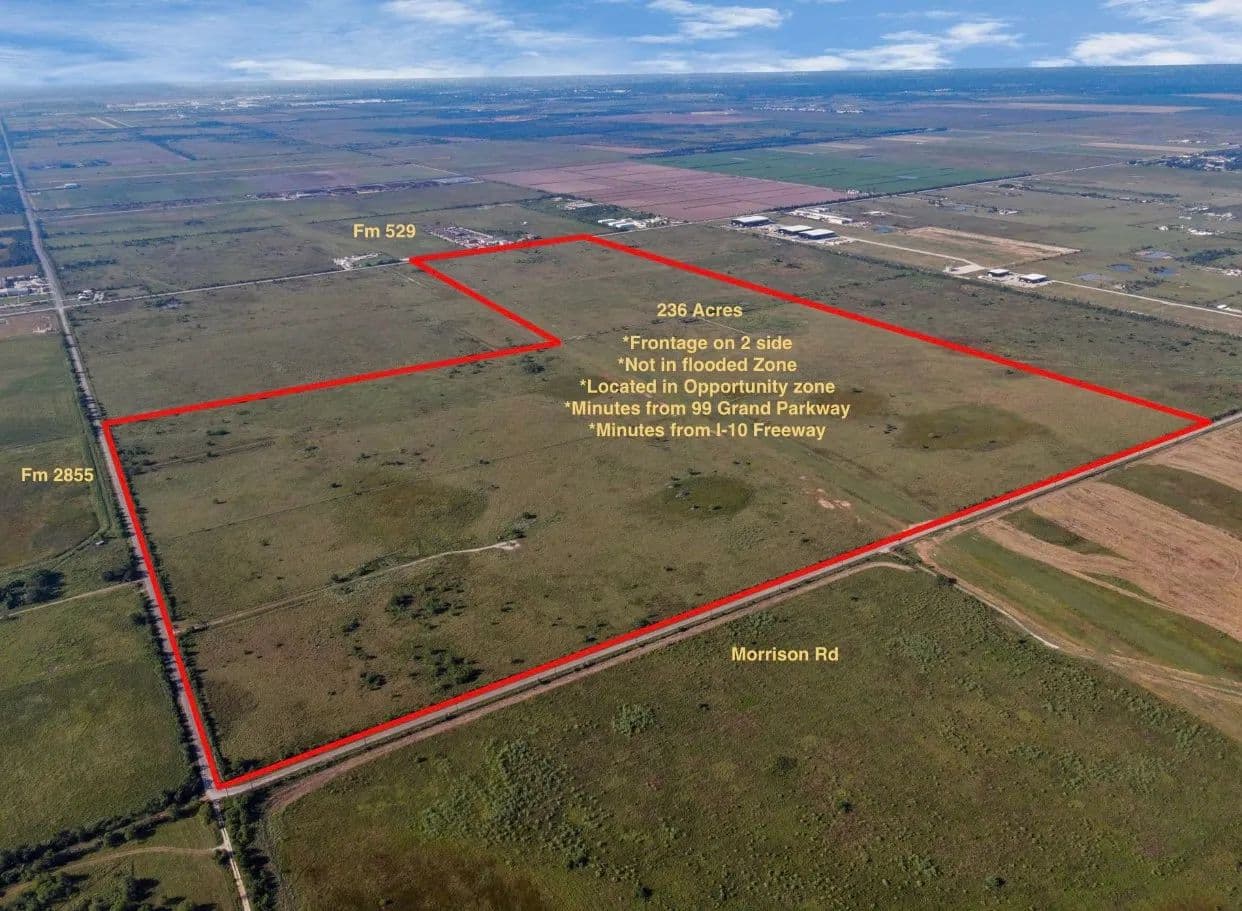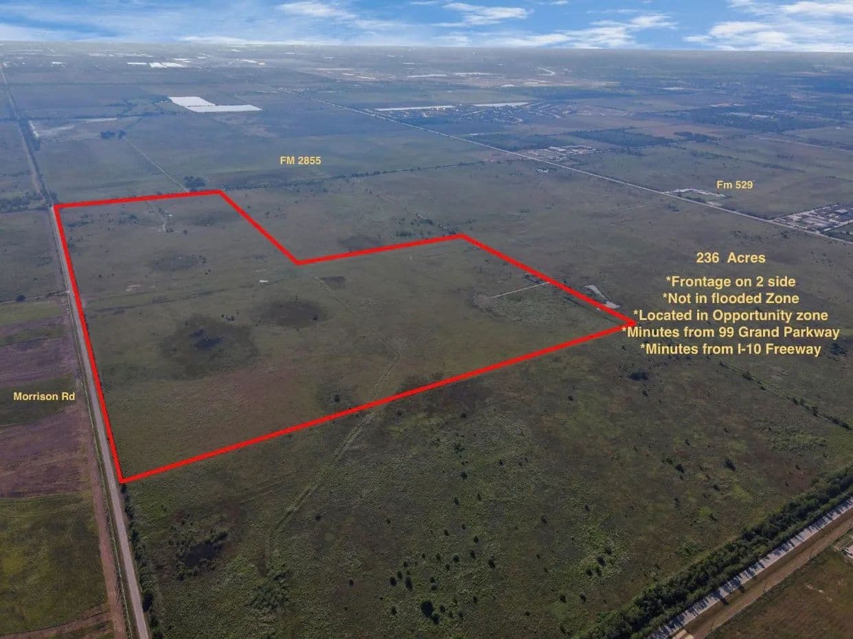 PRIME LOCATION!!! 236 acres of excellent land in a growth-oriented area, 99 Grand Parkway and 1-10 are minutes away! Katy is fifteen minutes away, fast expanding region with several developments located within two miles of each other. The property is level and perfect for development. Since the property has an extensive amount of road frontage on both FM 2855 and Morrison RD. Outstanding possibilities for the development of a residential or commercial. AG EXEMPT; PERIMETER FENCED; CURRENTLY USED FOR CATTLE GRAZING. THE LAND IS PART OF KATY POLE LINE CURRENTLY USED FOR CATTLE GRAZING CURRENTLY.