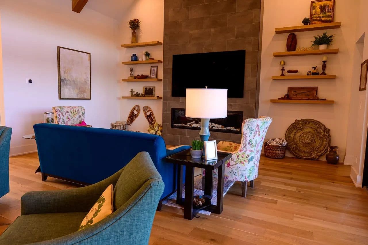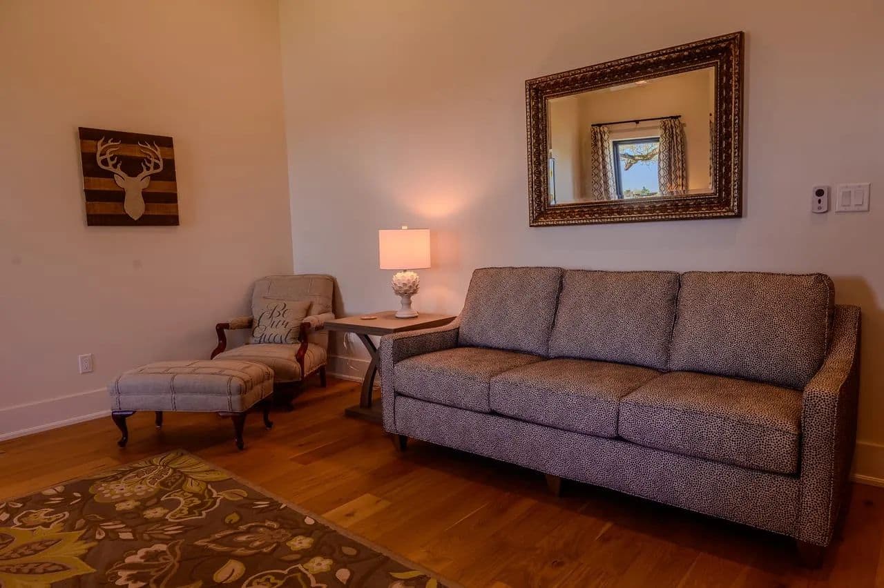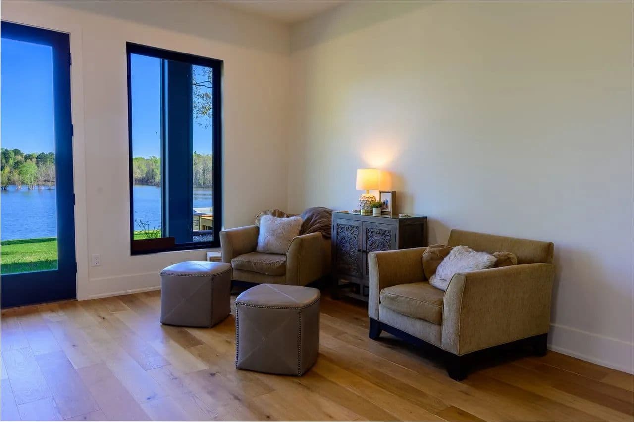 The second home is 1800 sq. ft. with 3 bedrooms and 2 1/2 baths. On the first level you'll find a half bath, the living room as well as the kitchen and eating area. The master bedroom is also on this level with its own master bath. The views from here are just as spectacular as the main home. Big windows line the back wall giving you lots of light and endless views. When you get upstairs you'll find a nice sitting area between the two bedrooms on either end of the floor. In the middle is a beautiful full bath with tub and a seperate shower. There is a two car garage as well.