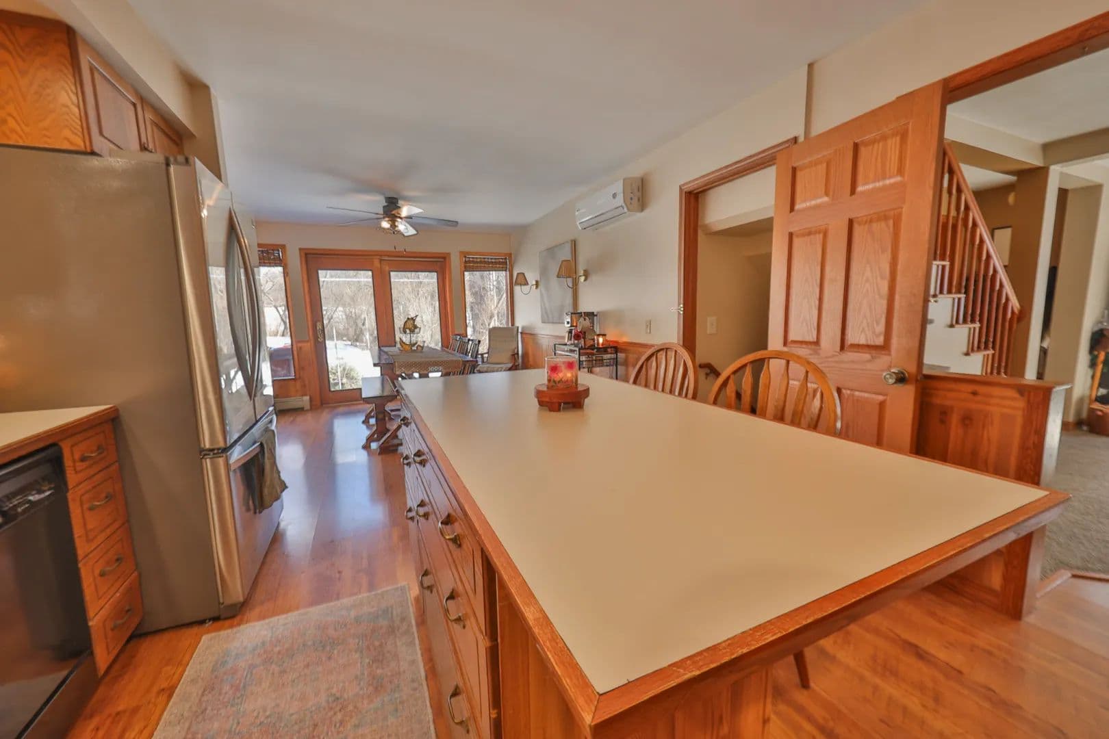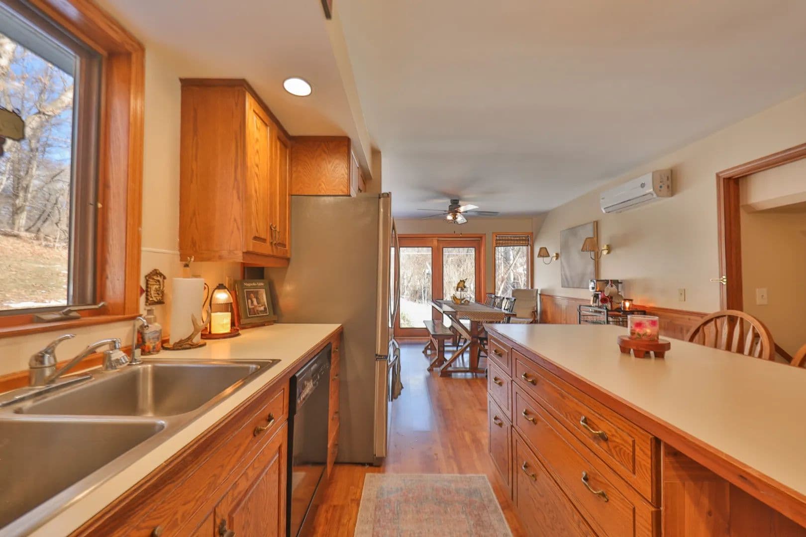 Upstairs, the main floor opens into a generous kitchen with island seating, flowing effortlessly into a bright dining room surrounded by oversized picture windows. Natural light pours in from every direction. A spacious bathroom with dual sinks sits just off the living area, while the primary bedroom suite features its own full bath. The upper level includes a secondary bedroom currently used as a dual children’s retreat — cozy, practical, and full of character.