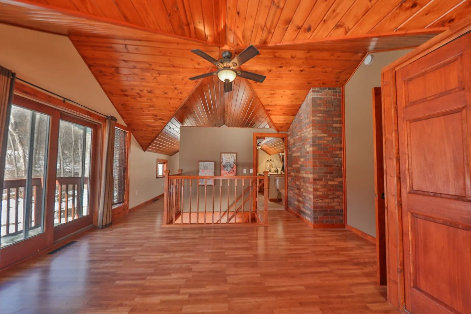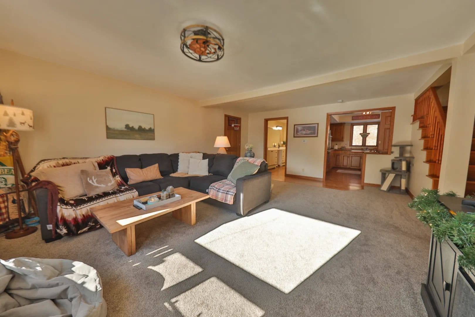Accessed from the deck, the West wing showcases warm woodwork and vaulted ceilings that create an inviting lodge-like atmosphere. A comfortable living room with abundant windows anchors the main floor, accompanied by a half bath and bright eat-in kitchen.