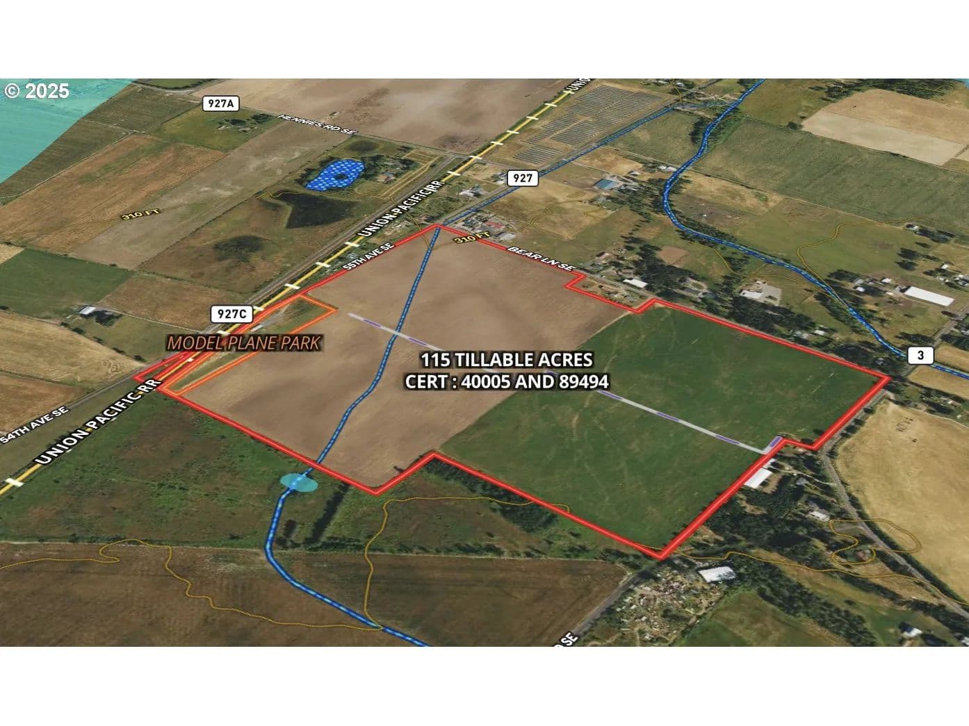 This 122-acre parcel with 115 tillable acres and zoned EFU (Exclusive Farm Use), providing a strong foundation for your next farm/ranch activities. Currently planted in grass seed, the land is well-maintained and productive, making it an ideal investment. The property has an irrigation well with 220 power. Two water rights equalling 124 acres cover the property. The outbuilding is leased to a model airplane race track