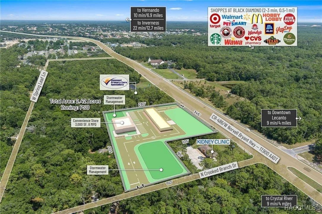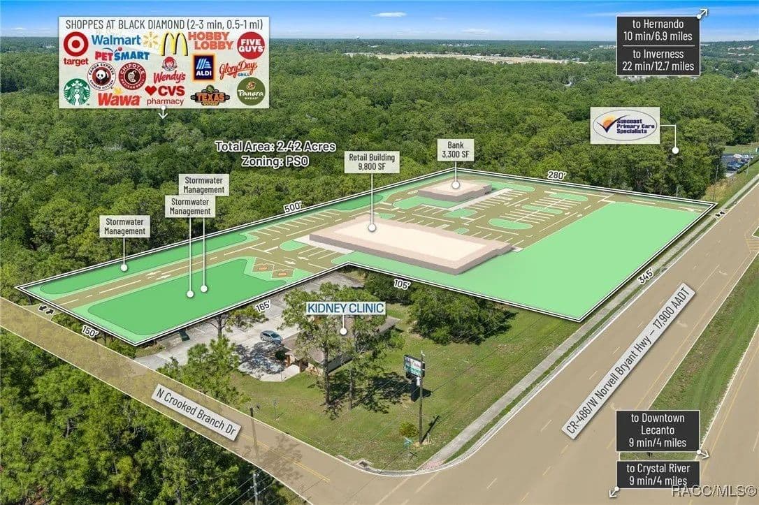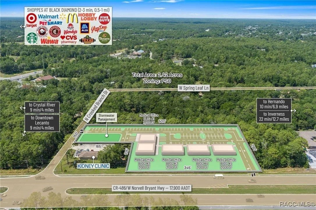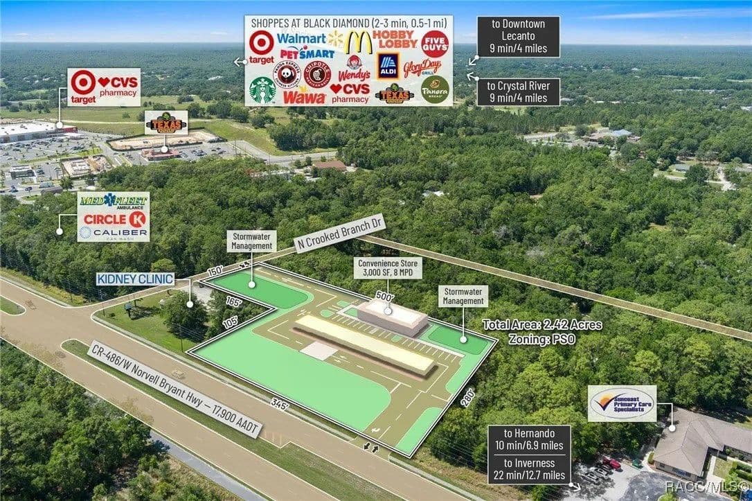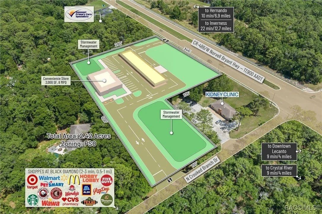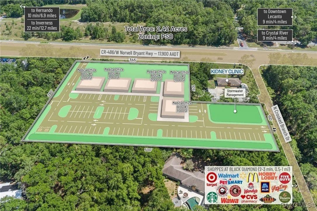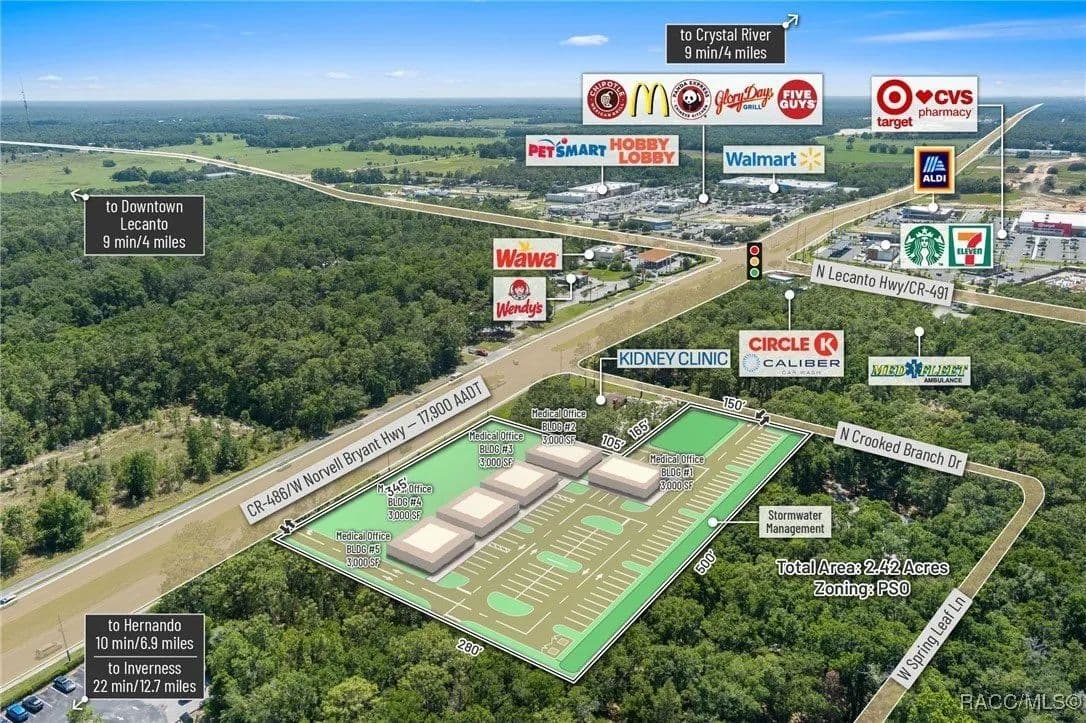 This highly strategic 2.43-acre assemblage presents a rare multi-parcel development opportunity at the northeast corner of E Norvell Bryant Hwy (CR 486) and Crooked Branch Drive, directly across from Citrus County's most active commercial expansion zone. Offering over 352 feet of prime frontage along CR 486, the site boasts dual road exposure and wraps the intersection with full median-cut access, ensuring seamless ingress and egress along one of the county's most visible corridors. E Norvell Bryant Hwy supports an Annual Average Daily Traffic (AADT) of approximately 22,000 vehicles, making it one of the highest-trafficked arteries in the region-ideal for high-exposure commercial, medical, or mixed-use development. The property features gently rolling terrain with elevations ranging from 76 to 103 feet and well-drained Arredondo fine sand soils, with average slopes of 7-16%. Situated entirely within Flood Zone X, it poses no floodplain development restrictions and offers favorable drainage conditions, reducing site preparation costs and simplifying the grading process. County water is available at the frontage, while sewer service is accessible nearby within the utility district, subject to standard connection and assessment approvals. The dual-corner configuration, combined with clean topography, allows for exceptional design flexibility-accommodating multiple building pads, ample parking, and efficient circulation patterns. Located just two parcels east of the signalized intersection of CR 486 and CR 491, the site is surrounded by top-tier national retailers, including Walmart, Target, ALDI, Panera Bread, and Texas Roadhouse-positioning it at the heart of Citrus County's most dynamic medical and retail corridor. Located in the heart of Citrus County's Central Ridge, this property serves 66,000+ residents within 5 miles, with a median age of 60 and household income exceeding $65,000.