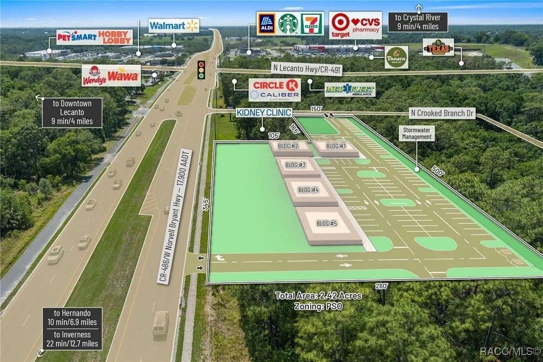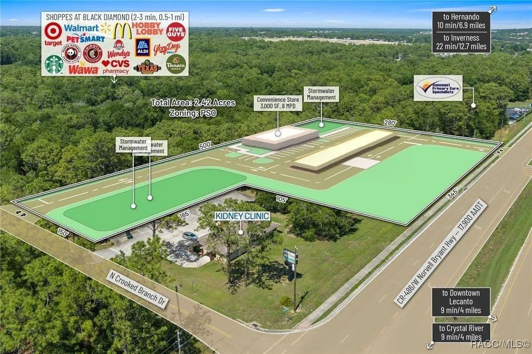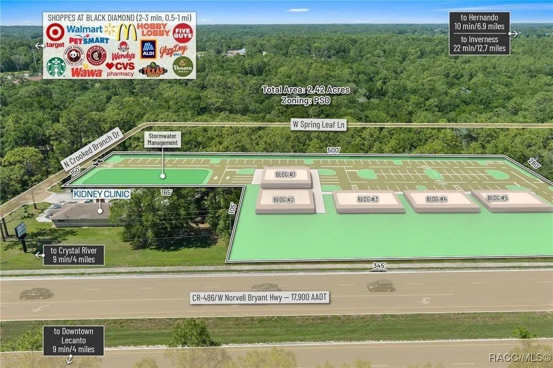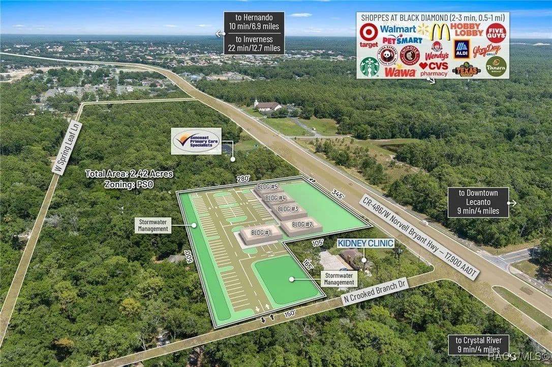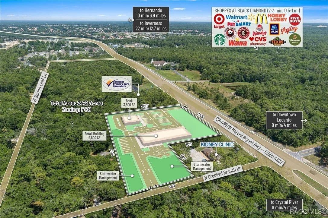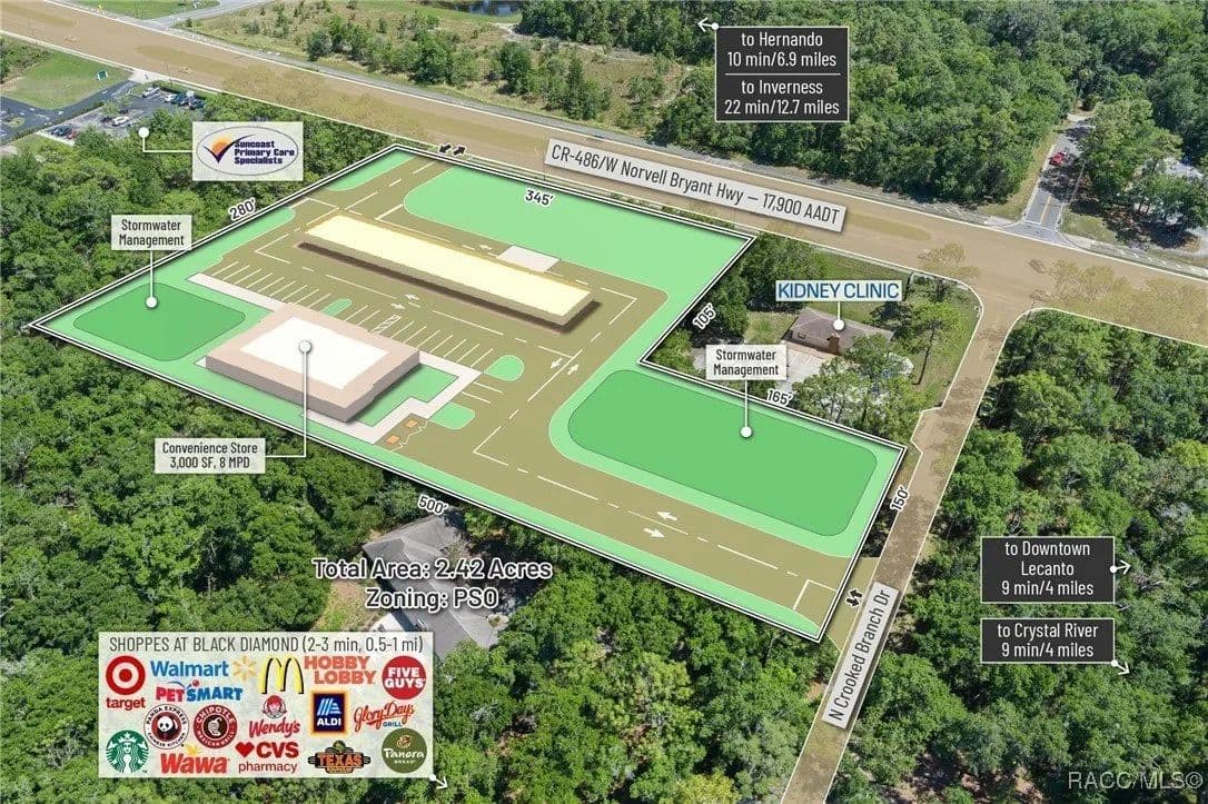 This highly strategic 2.43-acre assemblage presents a rare multi-parcel development opportunity at the northeast corner of E Norvell Bryant Hwy (CR 486) and Crooked Branch Drive, directly across from Citrus County's most active commercial expansion zone. Offering over 352 feet of prime frontage along CR 486, the site boasts dual road exposure and wraps the intersection with full median-cut access, ensuring seamless ingress and egress along one of the county's most visible corridors. E Norvell Bryant Hwy supports an Annual Average Daily Traffic (AADT) of approximately 22,000 vehicles, making it one of the highest-trafficked arteries in the region-ideal for high-exposure commercial, medical, or mixed-use development. The property features gently rolling terrain with elevations ranging from 76 to 103 feet and well-drained Arredondo fine sand soils, with average slopes of 7-16%. Situated entirely within Flood Zone X, it poses no floodplain development restrictions and offers favorable drainage conditions, reducing site preparation costs and simplifying the grading process. County water is available at the frontage, while sewer service is accessible nearby within the utility district, subject to standard connection and assessment approvals. The dual-corner configuration, combined with clean topography, allows for exceptional design flexibility-accommodating multiple building pads, ample parking, and efficient circulation patterns. Located just two parcels east of the signalized intersection of CR 486 and CR 491, the site is surrounded by top-tier national retailers, including Walmart, Target, ALDI, Panera Bread, and Texas Roadhouse-positioning it at the heart of Citrus County's most dynamic medical and retail corridor. Located in the heart of Citrus County's Central Ridge, this property serves 66,000+ residents within 5 miles, with a median age of 60 and household income exceeding $65,000.