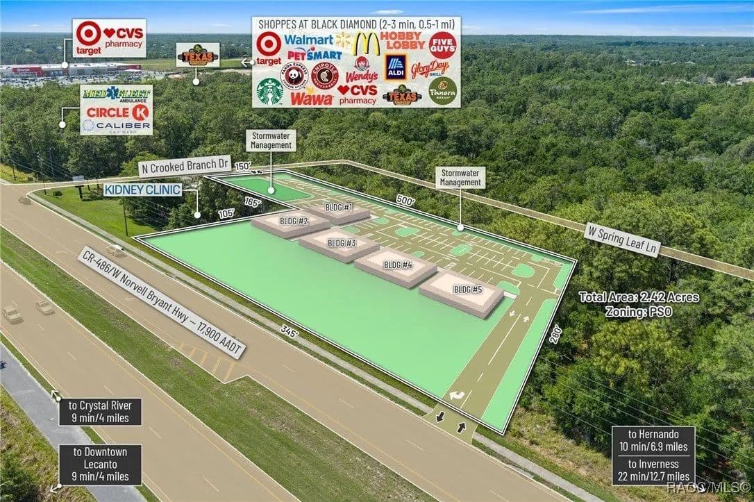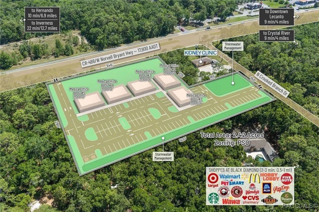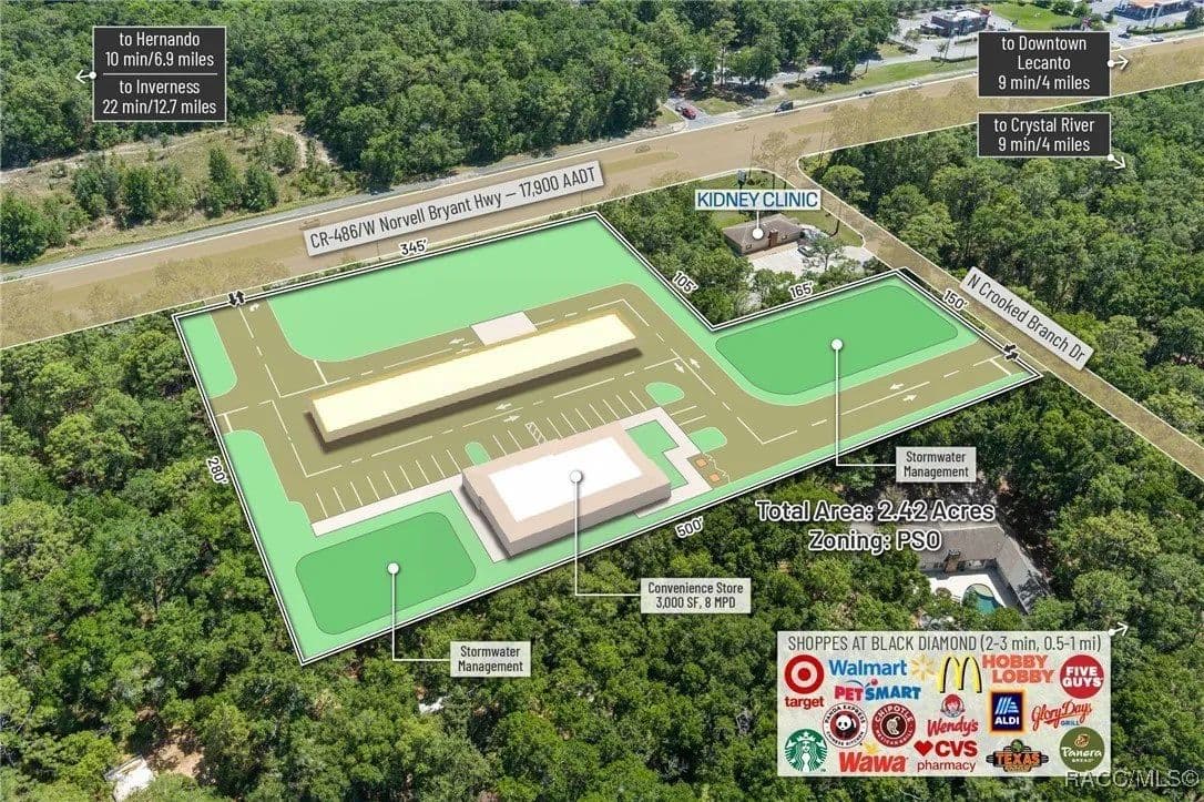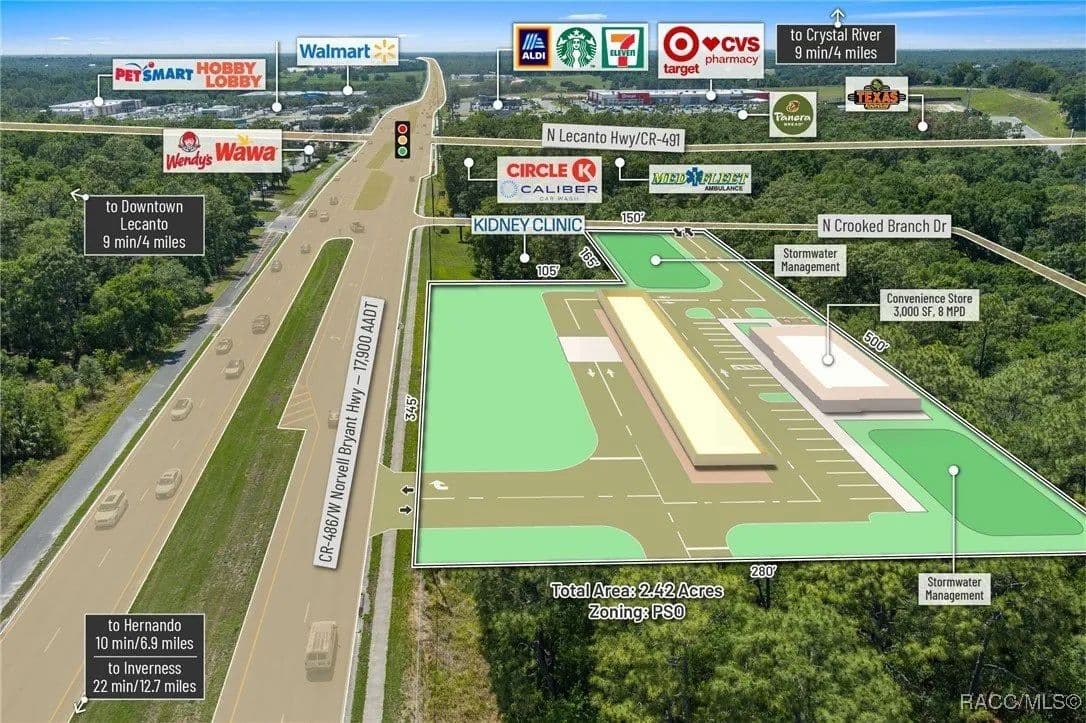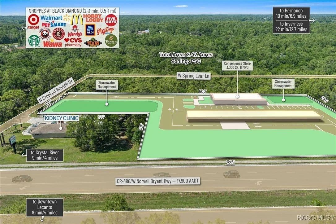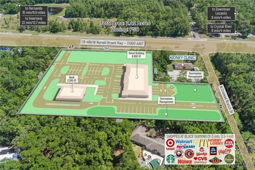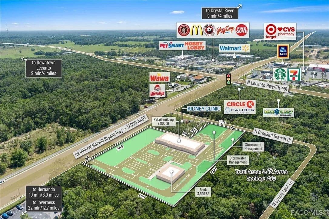 This highly strategic 2.43-acre assemblage presents a rare multi-parcel development opportunity at the northeast corner of E Norvell Bryant Hwy (CR 486) and Crooked Branch Drive, directly across from Citrus County's most active commercial expansion zone. Offering over 352 feet of prime frontage along CR 486, the site boasts dual road exposure and wraps the intersection with full median-cut access, ensuring seamless ingress and egress along one of the county's most visible corridors. E Norvell Bryant Hwy supports an Annual Average Daily Traffic (AADT) of approximately 22,000 vehicles, making it one of the highest-trafficked arteries in the region-ideal for high-exposure commercial, medical, or mixed-use development. The property features gently rolling terrain with elevations ranging from 76 to 103 feet and well-drained Arredondo fine sand soils, with average slopes of 7-16%. Situated entirely within Flood Zone X, it poses no floodplain development restrictions and offers favorable drainage conditions, reducing site preparation costs and simplifying the grading process. County water is available at the frontage, while sewer service is accessible nearby within the utility district, subject to standard connection and assessment approvals. The dual-corner configuration, combined with clean topography, allows for exceptional design flexibility-accommodating multiple building pads, ample parking, and efficient circulation patterns. Located just two parcels east of the signalized intersection of CR 486 and CR 491, the site is surrounded by top-tier national retailers, including Walmart, Target, ALDI, Panera Bread, and Texas Roadhouse-positioning it at the heart of Citrus County's most dynamic medical and retail corridor. Located in the heart of Citrus County's Central Ridge, this property serves 66,000+ residents within 5 miles, with a median age of 60 and household income exceeding $65,000.
