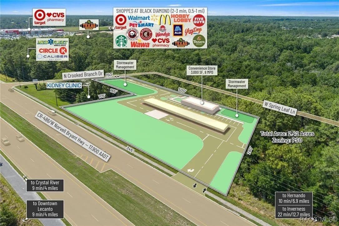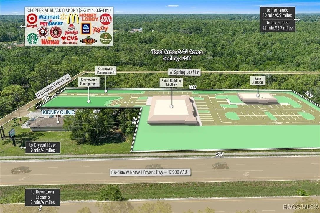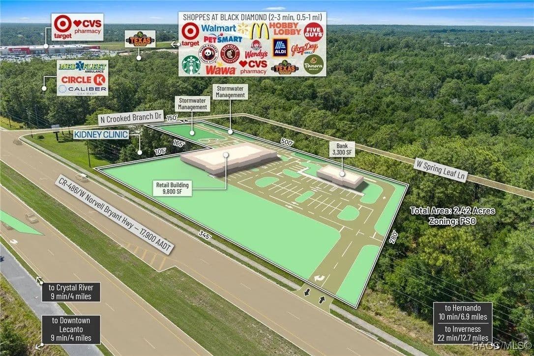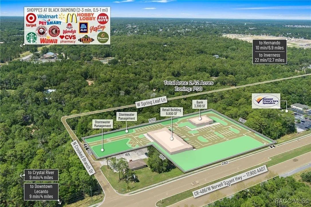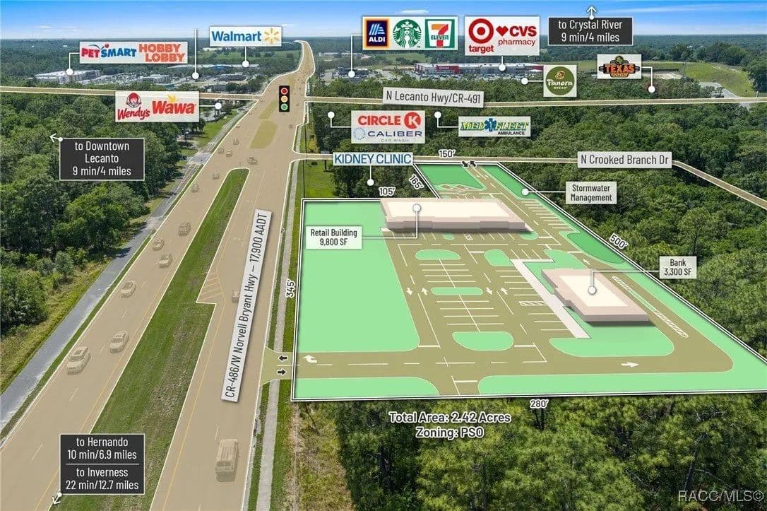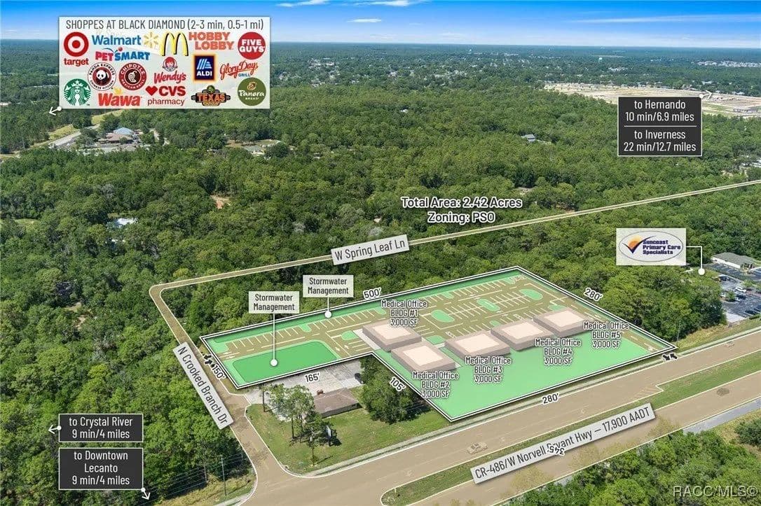 This highly strategic 2.43-acre assemblage presents a rare multi-parcel development opportunity at the northeast corner of E Norvell Bryant Hwy (CR 486) and Crooked Branch Drive, directly across from Citrus County's most active commercial expansion zone. Offering over 352 feet of prime frontage along CR 486, the site boasts dual road exposure and wraps the intersection with full median-cut access, ensuring seamless ingress and egress along one of the county's most visible corridors. E Norvell Bryant Hwy supports an Annual Average Daily Traffic (AADT) of approximately 22,000 vehicles, making it one of the highest-trafficked arteries in the region-ideal for high-exposure commercial, medical, or mixed-use development. The property features gently rolling terrain with elevations ranging from 76 to 103 feet and well-drained Arredondo fine sand soils, with average slopes of 7-16%. Situated entirely within Flood Zone X, it poses no floodplain development restrictions and offers favorable drainage conditions, reducing site preparation costs and simplifying the grading process. County water is available at the frontage, while sewer service is accessible nearby within the utility district, subject to standard connection and assessment approvals. The dual-corner configuration, combined with clean topography, allows for exceptional design flexibility-accommodating multiple building pads, ample parking, and efficient circulation patterns. Located just two parcels east of the signalized intersection of CR 486 and CR 491, the site is surrounded by top-tier national retailers, including Walmart, Target, ALDI, Panera Bread, and Texas Roadhouse-positioning it at the heart of Citrus County's most dynamic medical and retail corridor. Located in the heart of Citrus County's Central Ridge, this property serves 66,000+ residents within 5 miles, with a median age of 60 and household income exceeding $65,000.
