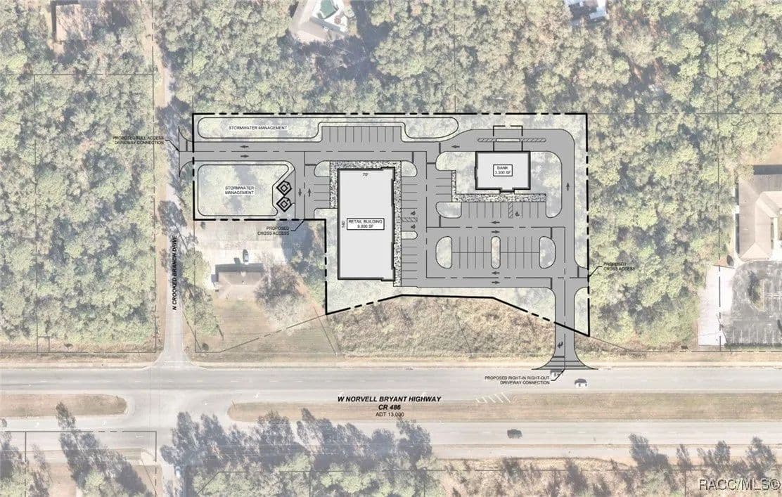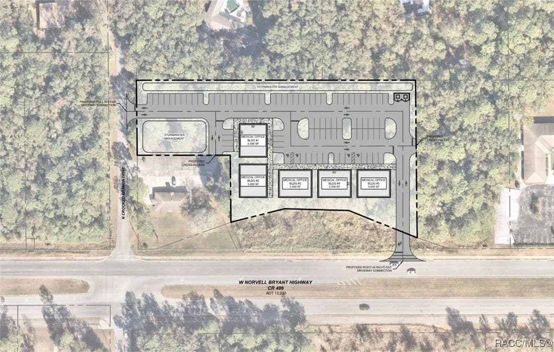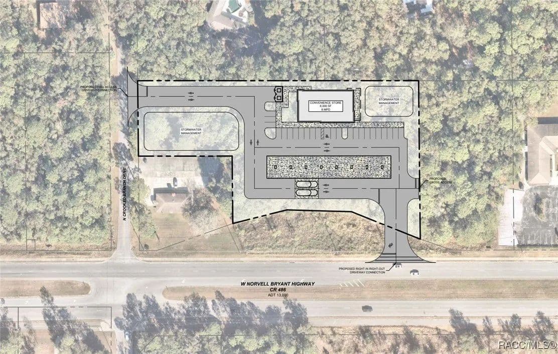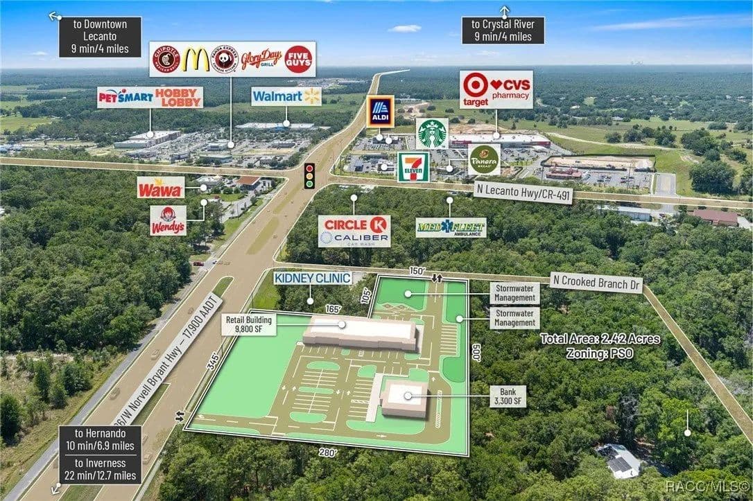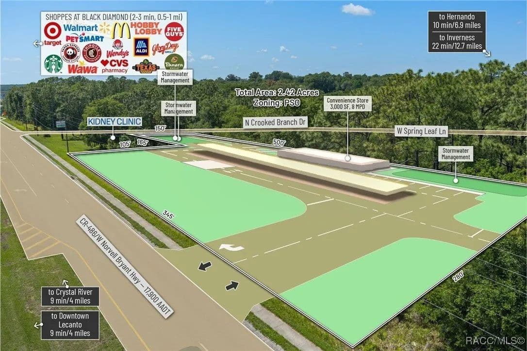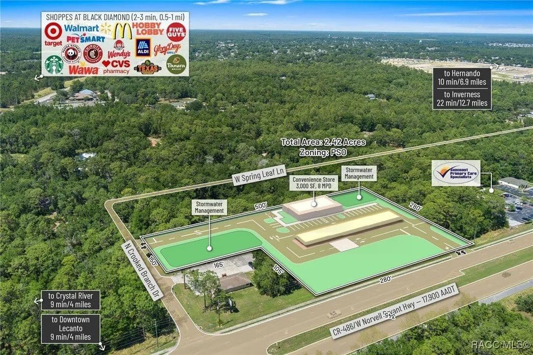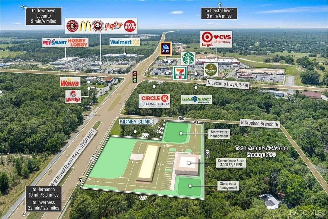 This highly strategic 2.43-acre assemblage presents a rare multi-parcel development opportunity at the northeast corner of E Norvell Bryant Hwy (CR 486) and Crooked Branch Drive, directly across from Citrus County's most active commercial expansion zone. Offering over 352 feet of prime frontage along CR 486, the site boasts dual road exposure and wraps the intersection with full median-cut access, ensuring seamless ingress and egress along one of the county's most visible corridors. E Norvell Bryant Hwy supports an Annual Average Daily Traffic (AADT) of approximately 22,000 vehicles, making it one of the highest-trafficked arteries in the region-ideal for high-exposure commercial, medical, or mixed-use development. The property features gently rolling terrain with elevations ranging from 76 to 103 feet and well-drained Arredondo fine sand soils, with average slopes of 7-16%. Situated entirely within Flood Zone X, it poses no floodplain development restrictions and offers favorable drainage conditions, reducing site preparation costs and simplifying the grading process. County water is available at the frontage, while sewer service is accessible nearby within the utility district, subject to standard connection and assessment approvals. The dual-corner configuration, combined with clean topography, allows for exceptional design flexibility-accommodating multiple building pads, ample parking, and efficient circulation patterns. Located just two parcels east of the signalized intersection of CR 486 and CR 491, the site is surrounded by top-tier national retailers, including Walmart, Target, ALDI, Panera Bread, and Texas Roadhouse-positioning it at the heart of Citrus County's most dynamic medical and retail corridor. Located in the heart of Citrus County's Central Ridge, this property serves 66,000+ residents within 5 miles, with a median age of 60 and household income exceeding $65,000.
