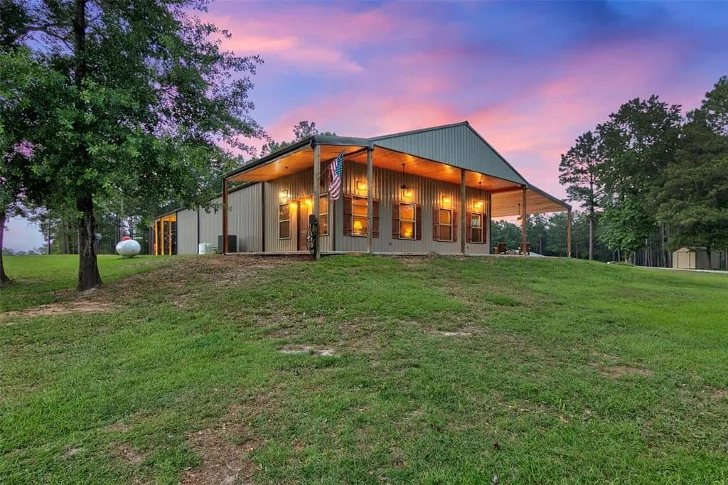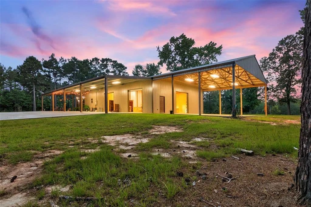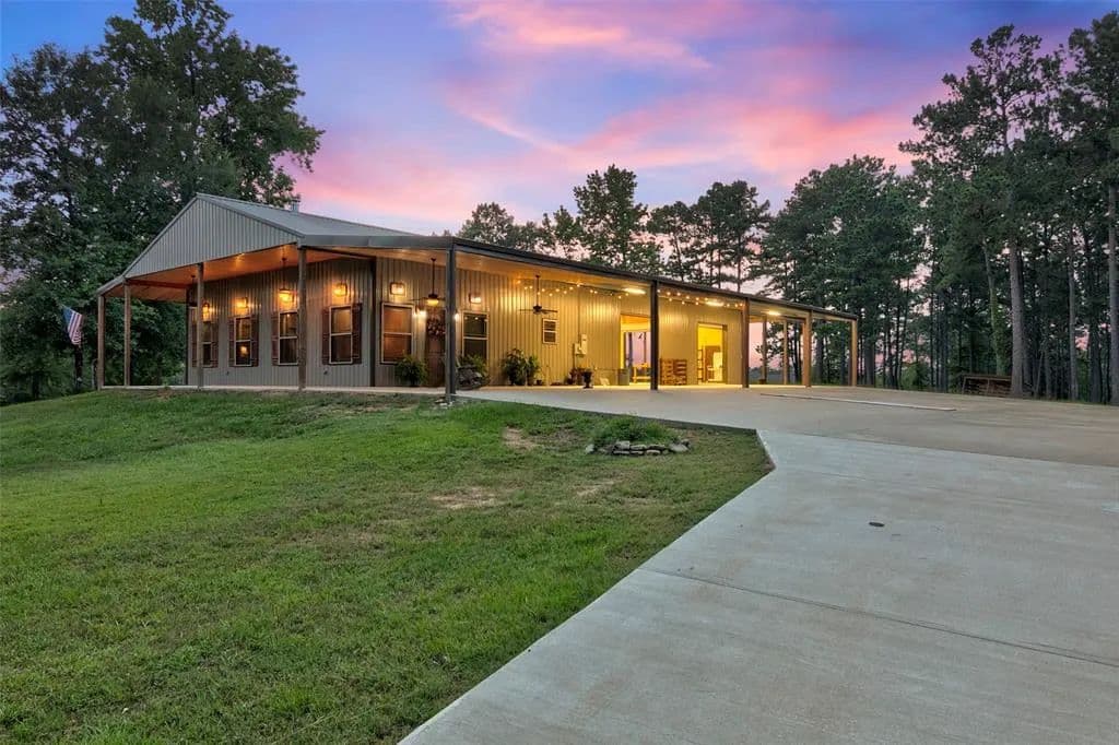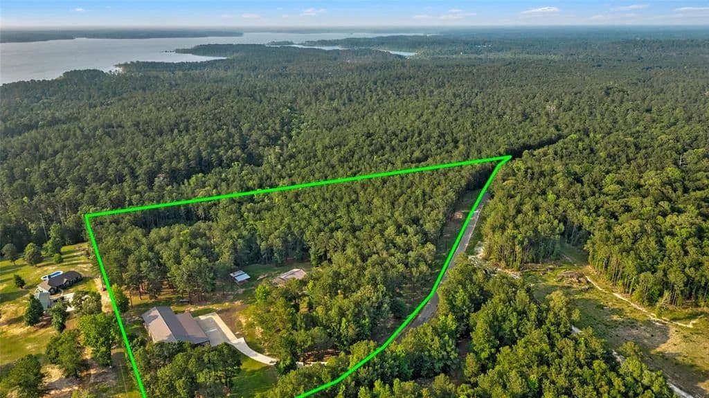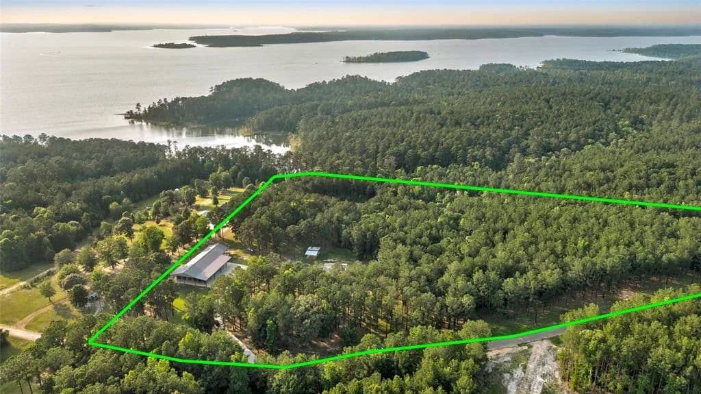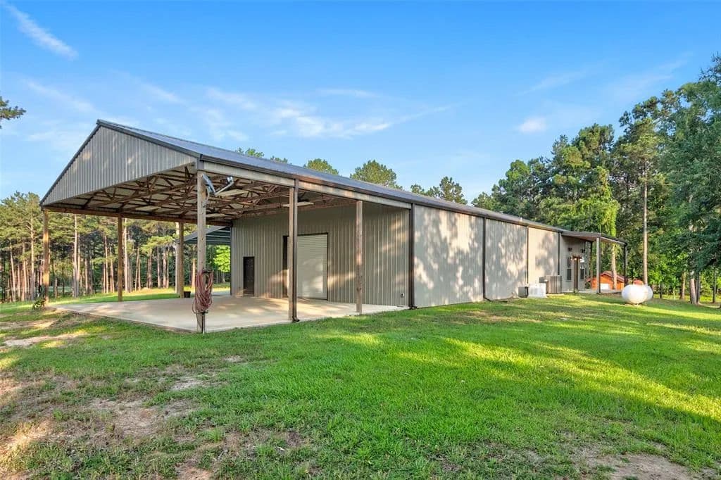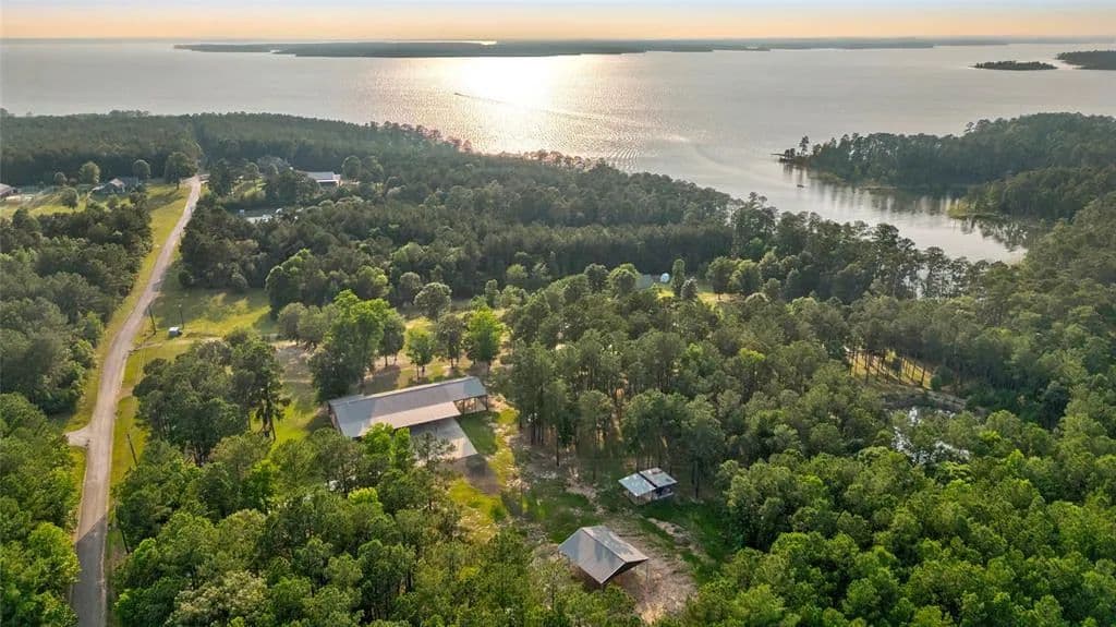 Custom crafted Barndominium in the water front community of Tiger Creek Estates at Lake Sam Rayburn. Situated on 10 rolling acres that meander down to a pond that edges along the Corp access to Lake Sam Rayburn. The privacy afforded amongst the East Texas Pines is amplified along the wrap around covered porch and the warm and spacious open concept living that provides a comfortable backdrop for entertaining and relaxing. A comfortable primary retreat with en-suite bath and large walk-in closet afford privacy for the host and a bunk-room/secondary bedroom provide comfortable lodging for visiting guests or family! The attached 39'x37' garage/shop features 3 roll-up bay doors allowing for storage of vehicles, RV, boats, side by sides, tractors or any other recreational vehicles. In addition, the home features an attached oversized/double carport space for additional vehicle storage, covered pavilion space for entertaining or guest parking. So much more to explore, call today!
